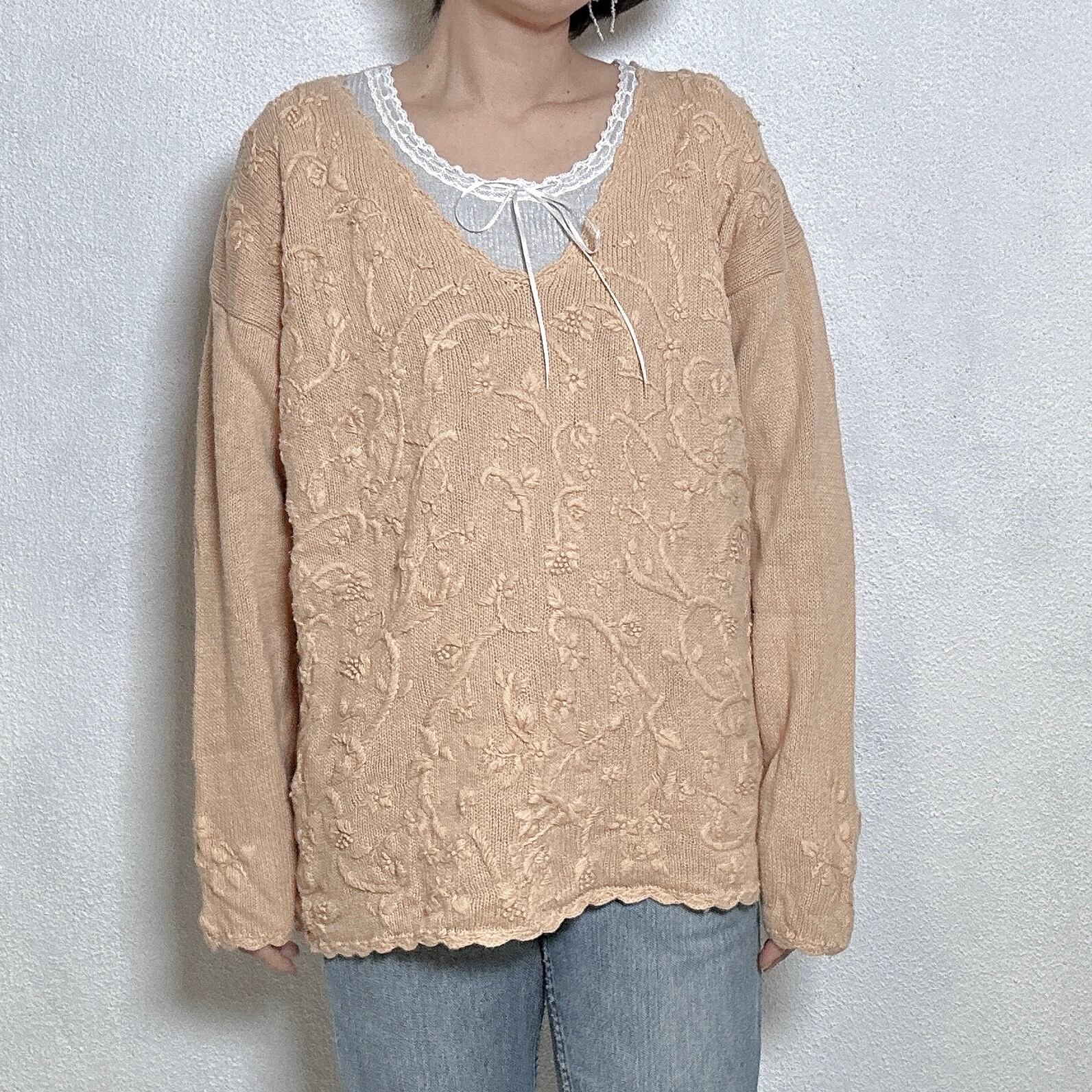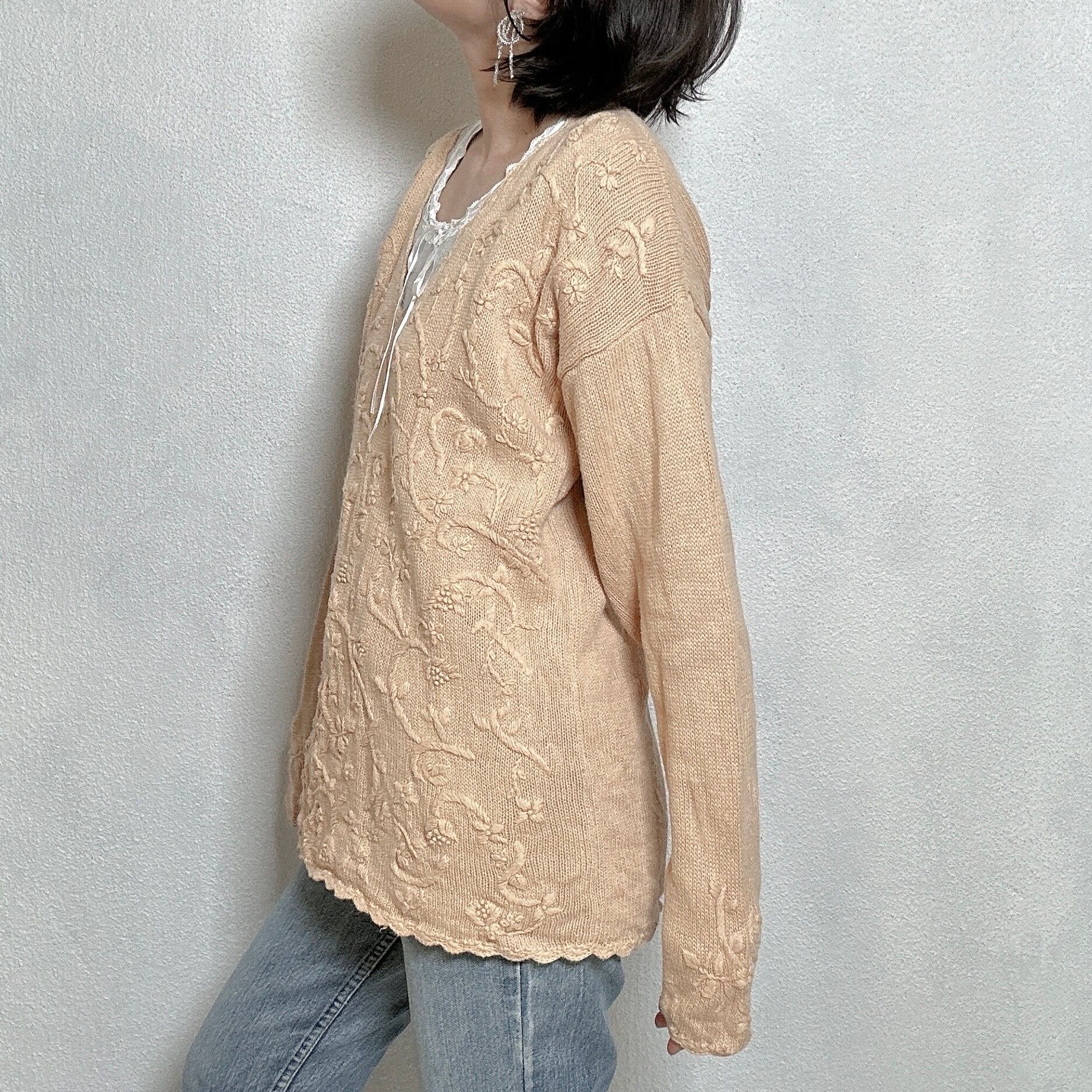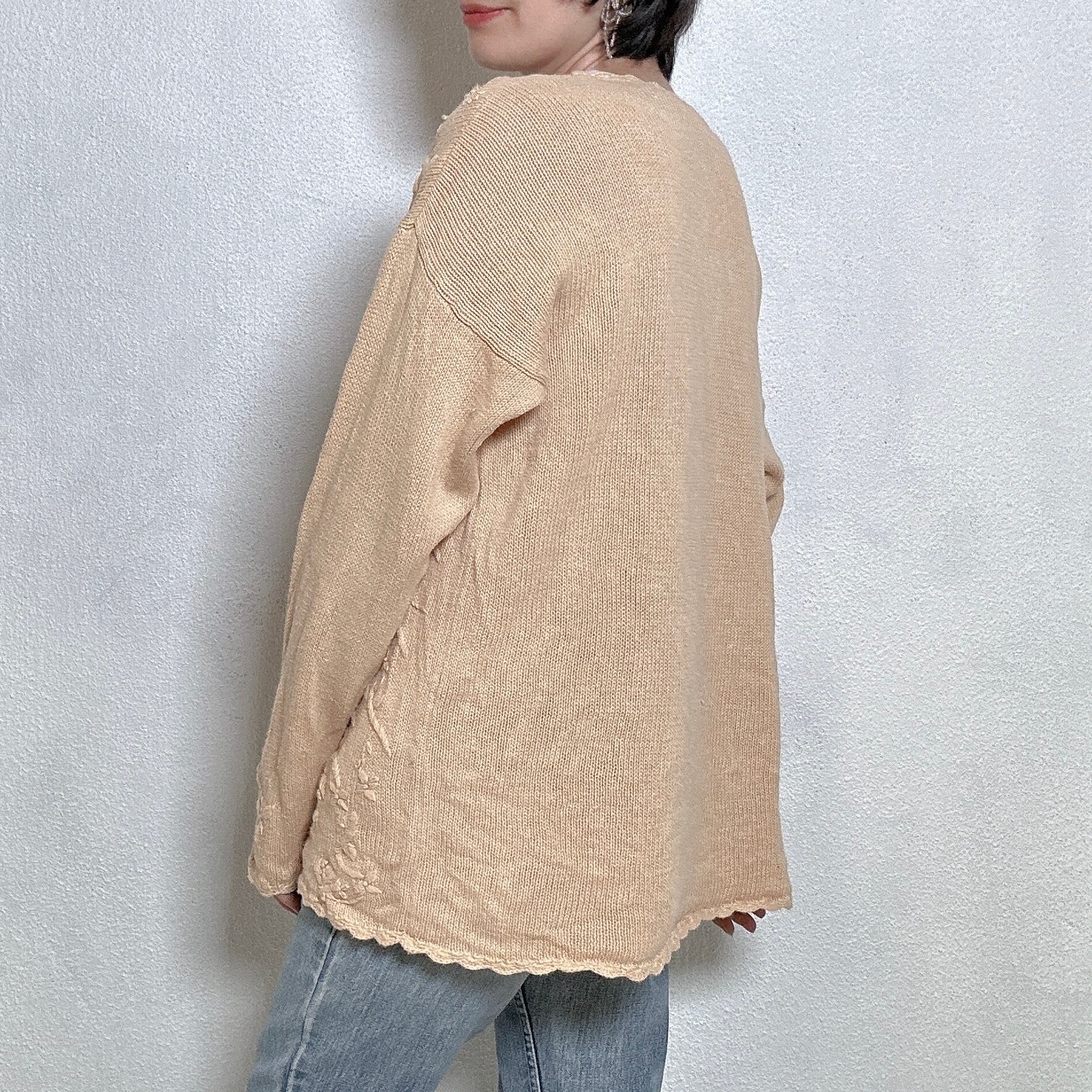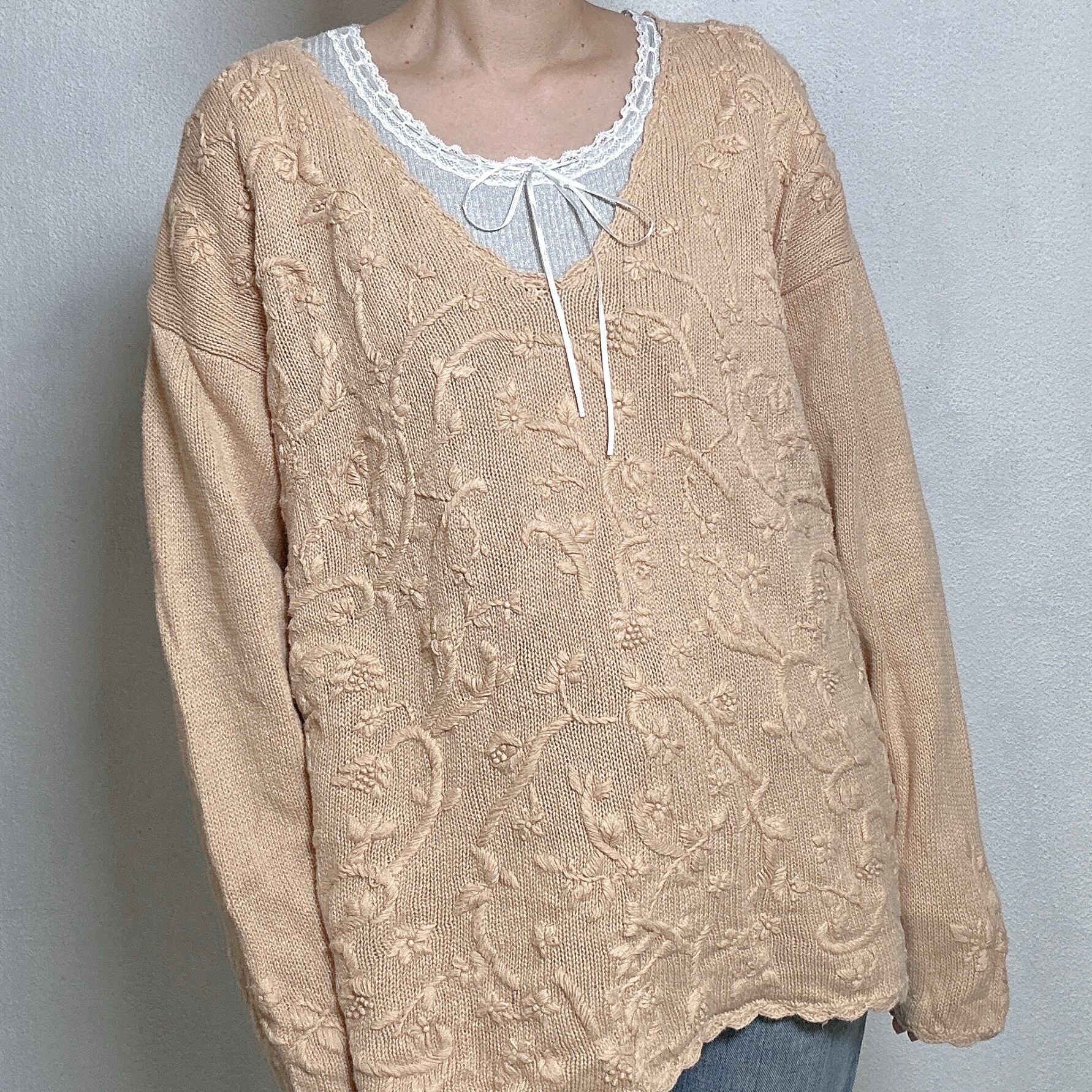 シンプルながらも、繊細なお花の刺繍がアクセントとなり、女性らしさを引き立ててくれます。ナチュラルなカラーは、どんなスタイルにも合わせやすく、デイリーコーディネートにおすすめです。