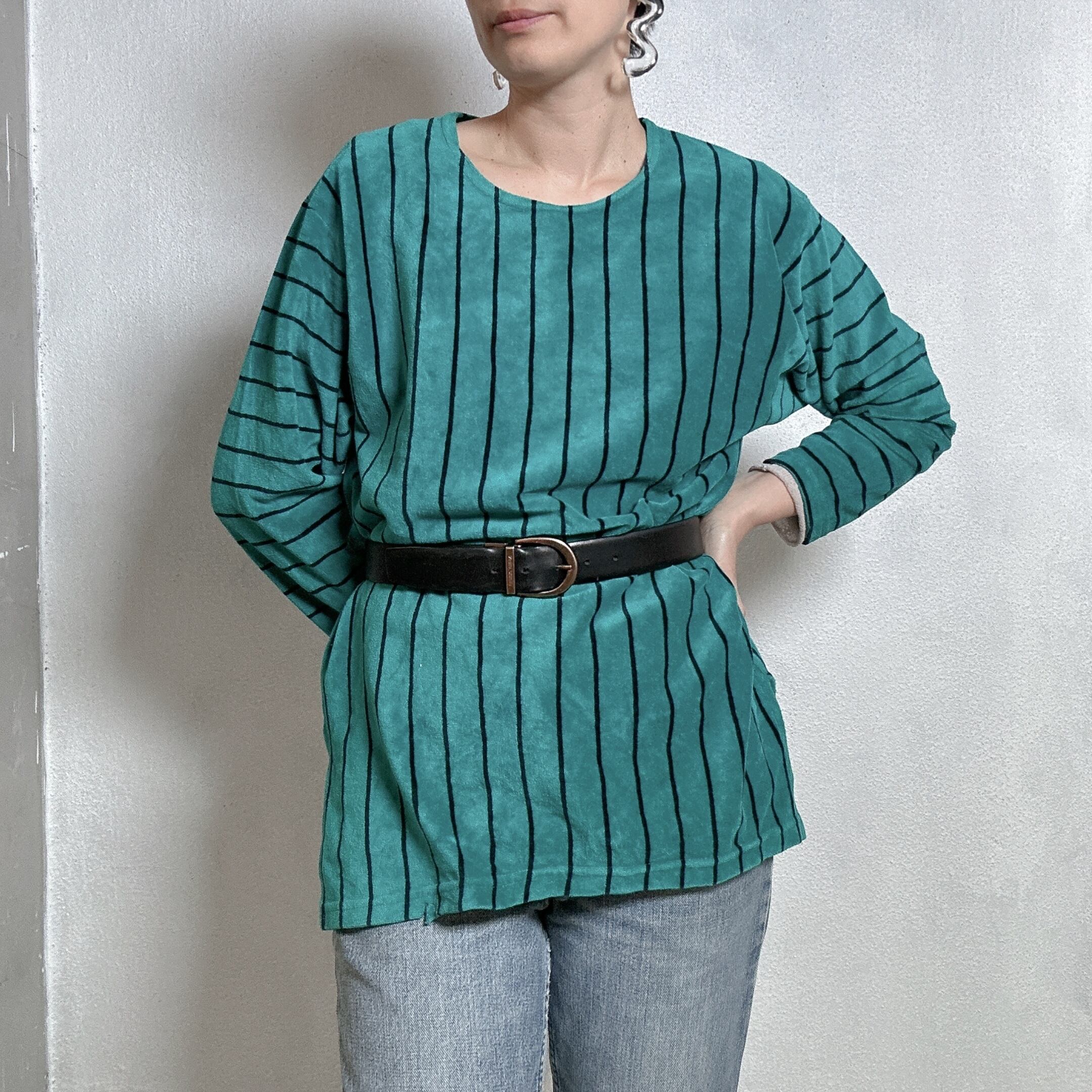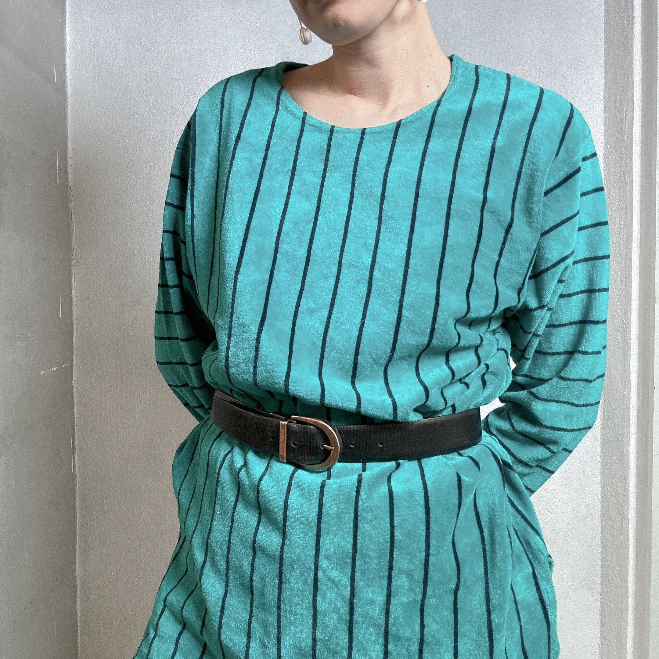 ヴィンテージコットンストライプチュニックです。ゆったりとしたシルエットで、リラックスしたい日にもぴったりのアイテムです。ウエストマークしたり、様々なスタイルを楽しめる一着です!