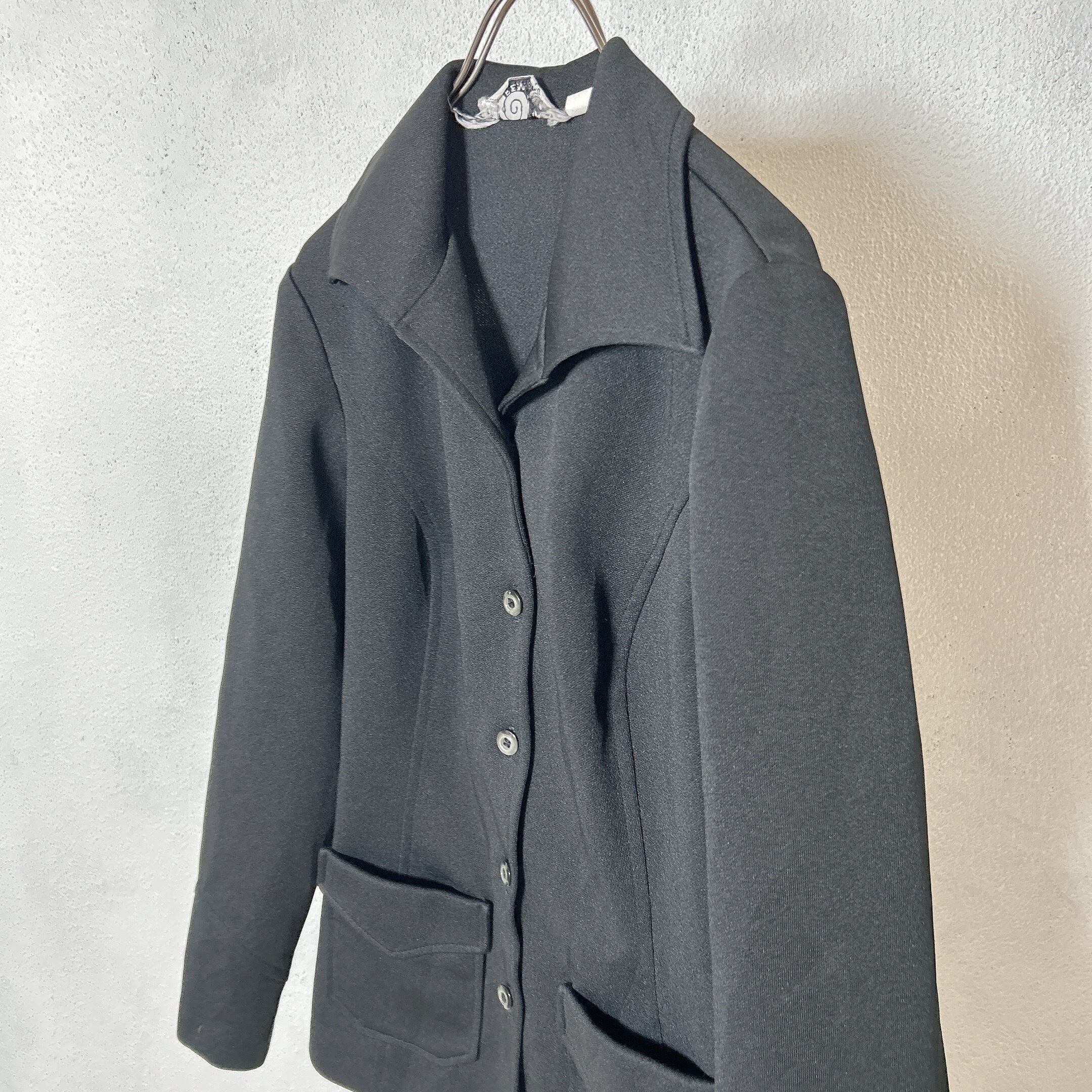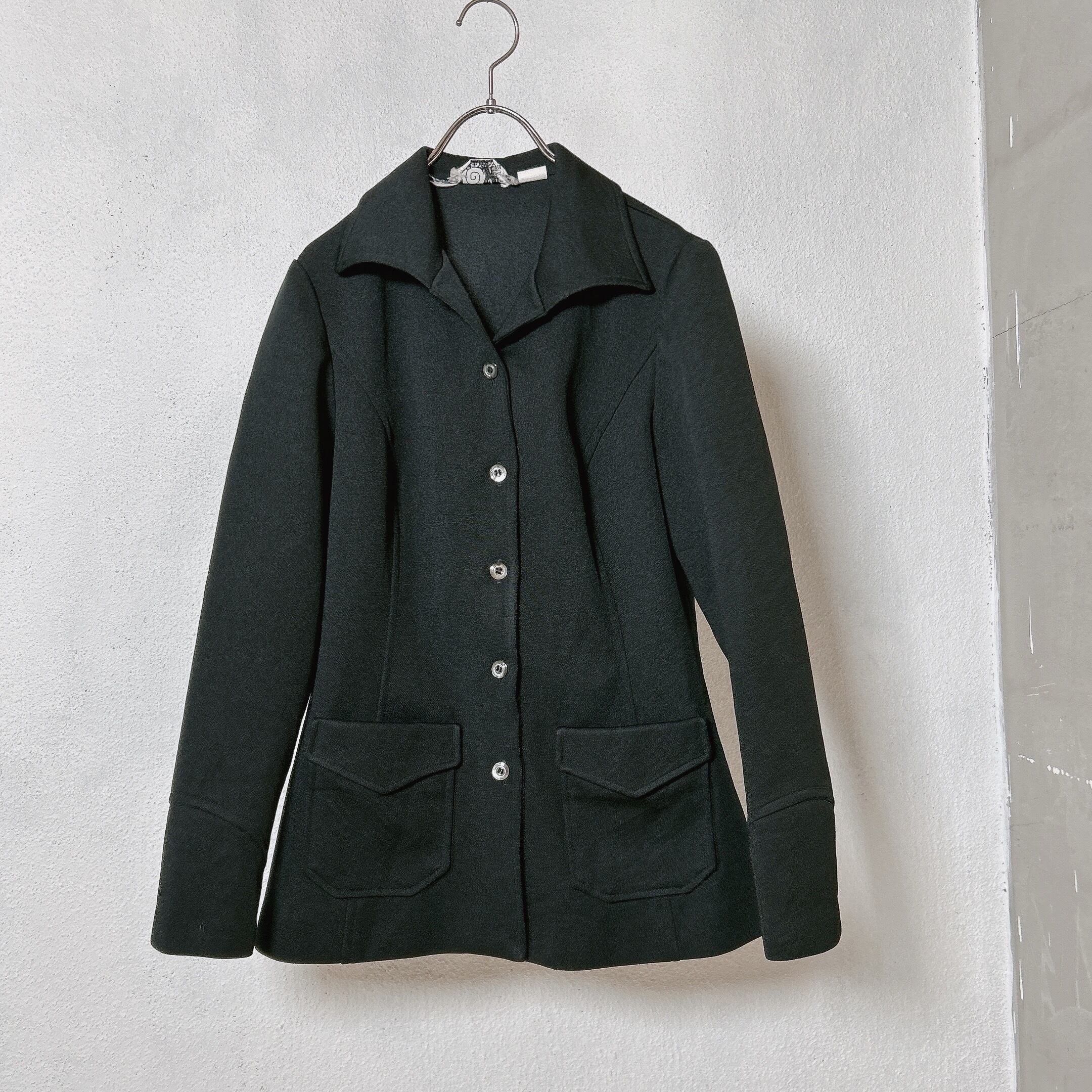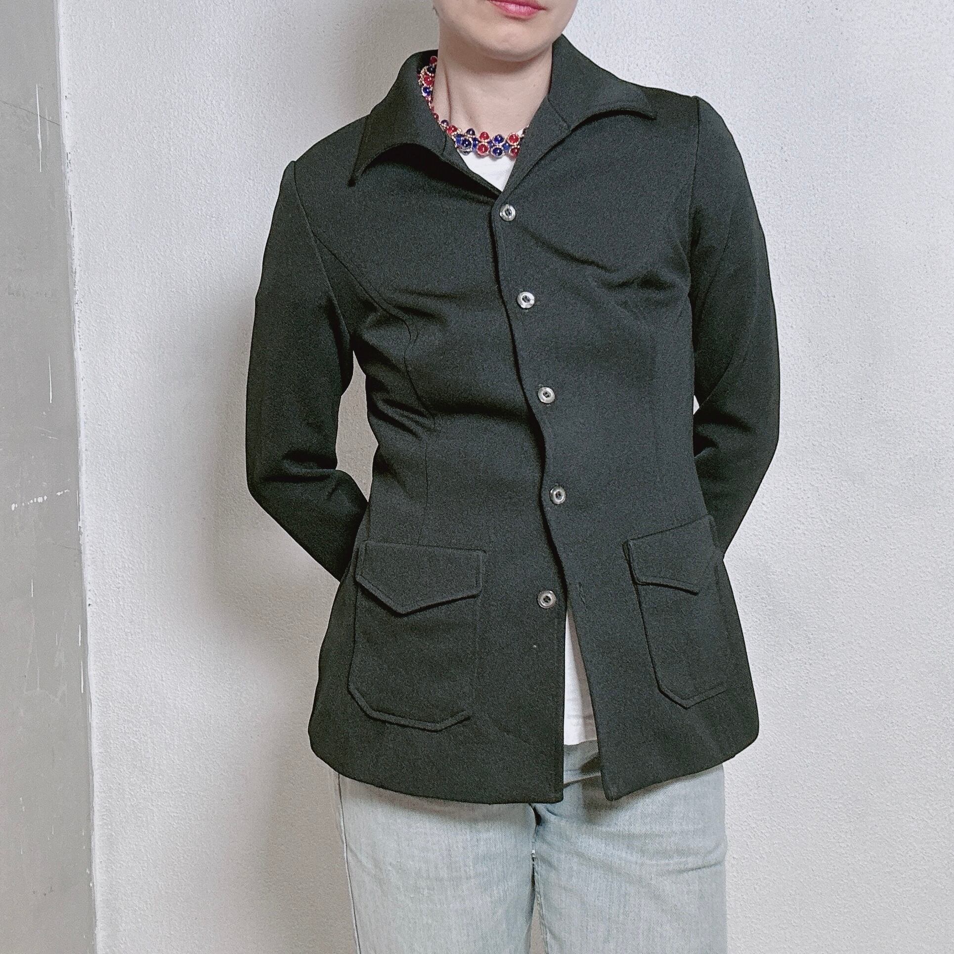 1960年代のヴィンテージ「Fem-E-Kits」ブラックジャケットです!伸縮性のある光沢感ある素材で、ボディーシルエットが綺麗に見える魅力の一着です。どんなスタイルにも合わせやすく、コーディネートの幅が広がります。レトロが新鮮で、存在感のあるジャケットです。