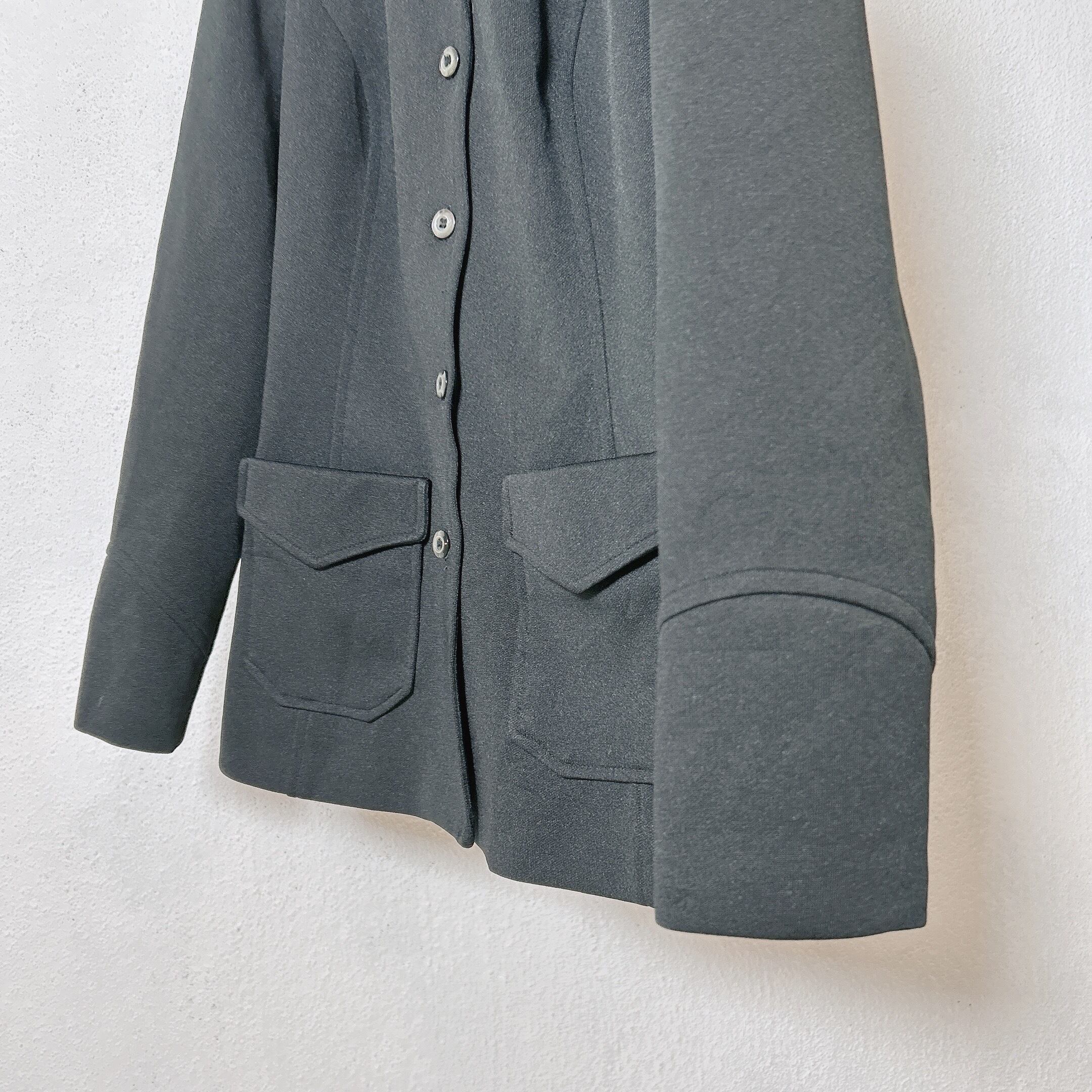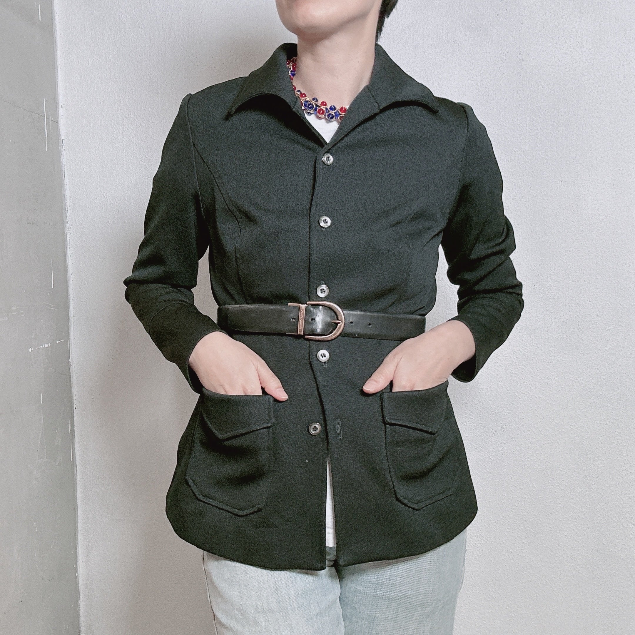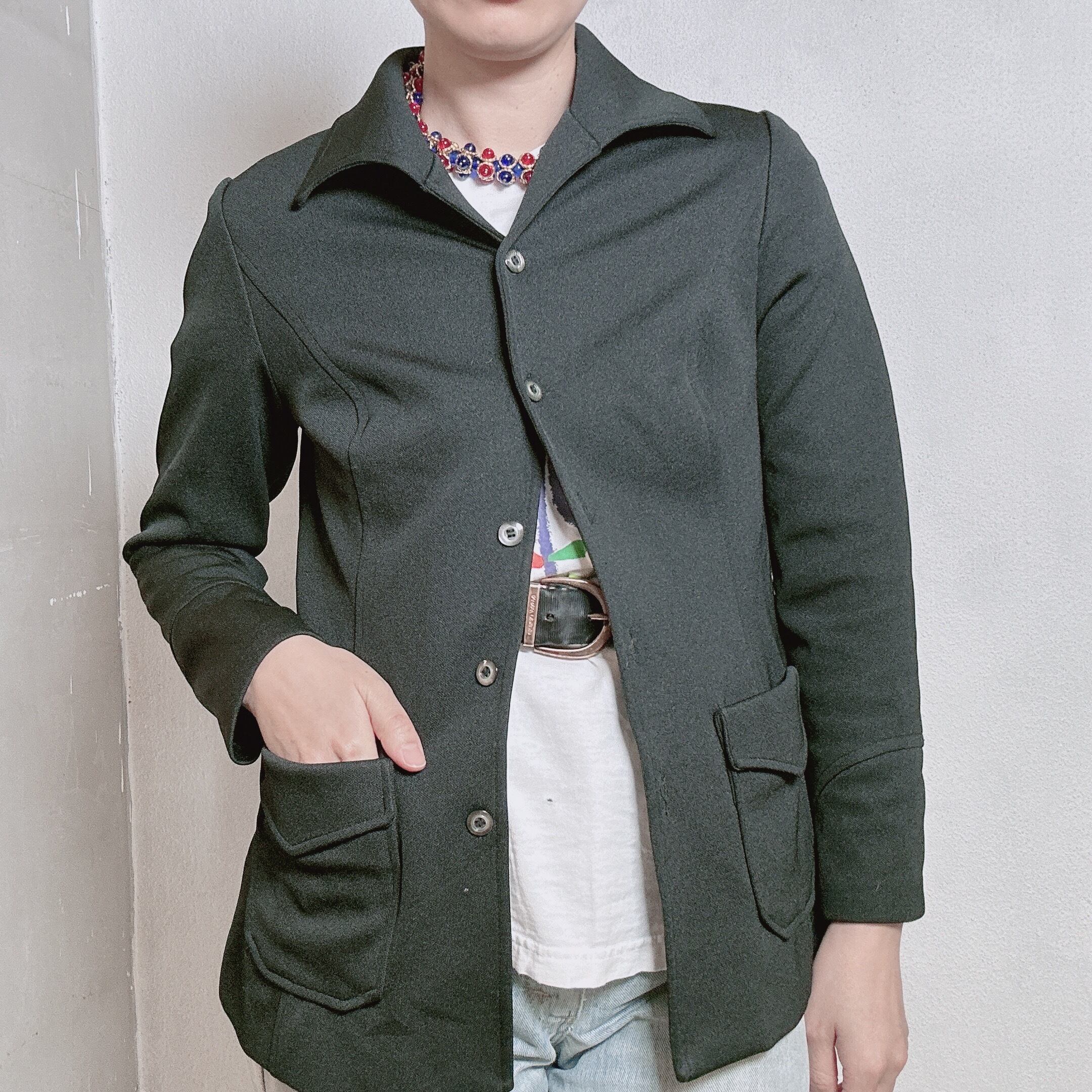 1960年代のヴィンテージ「Fem-E-Kits」ブラックジャケットです!伸縮性のある光沢感ある素材で、ボディーシルエットが綺麗に見える魅力の一着です。どんなスタイルにも合わせやすく、コーディネートの幅が広がります。レトロが新鮮で、存在感のあるジャケットです。