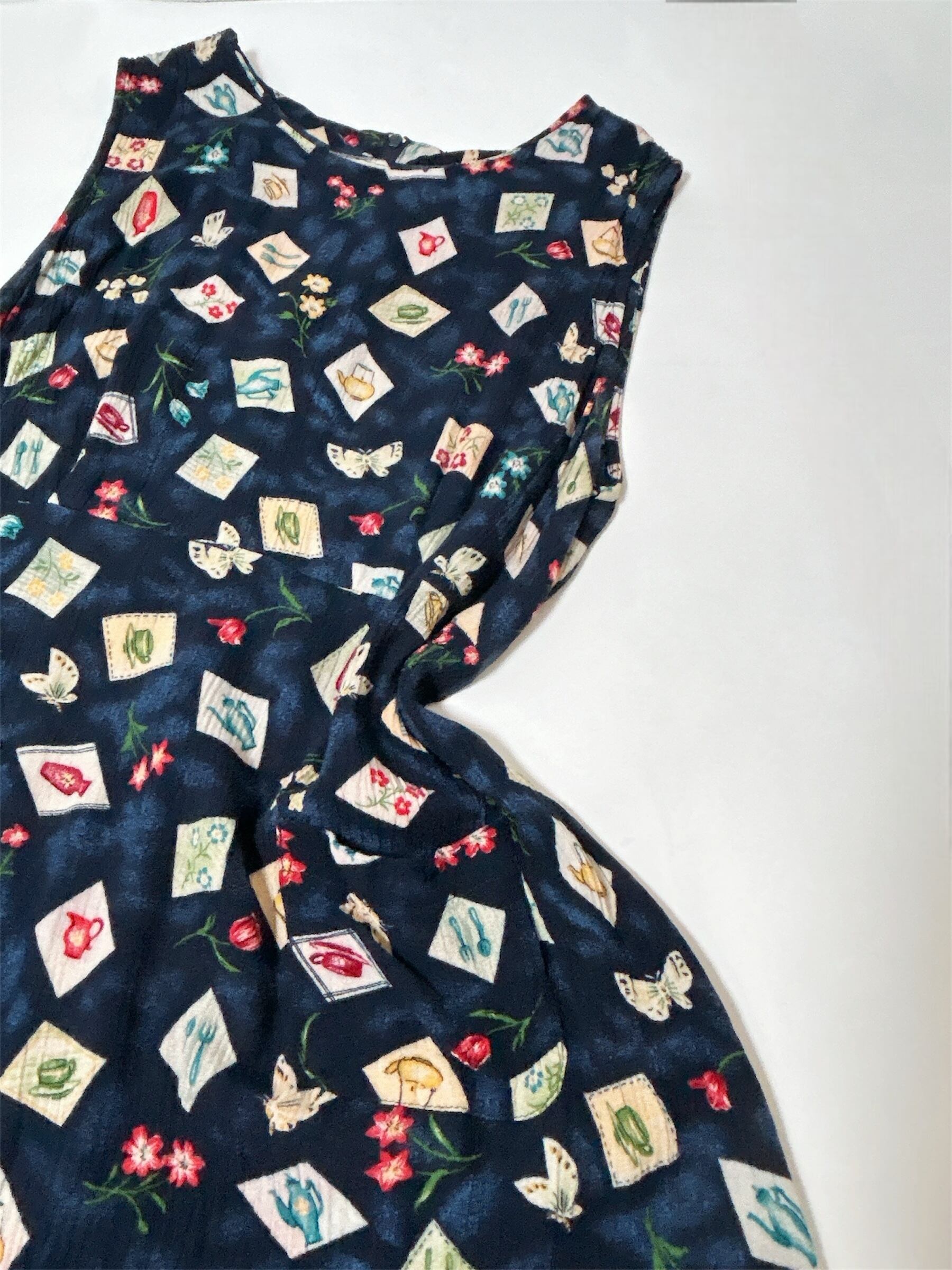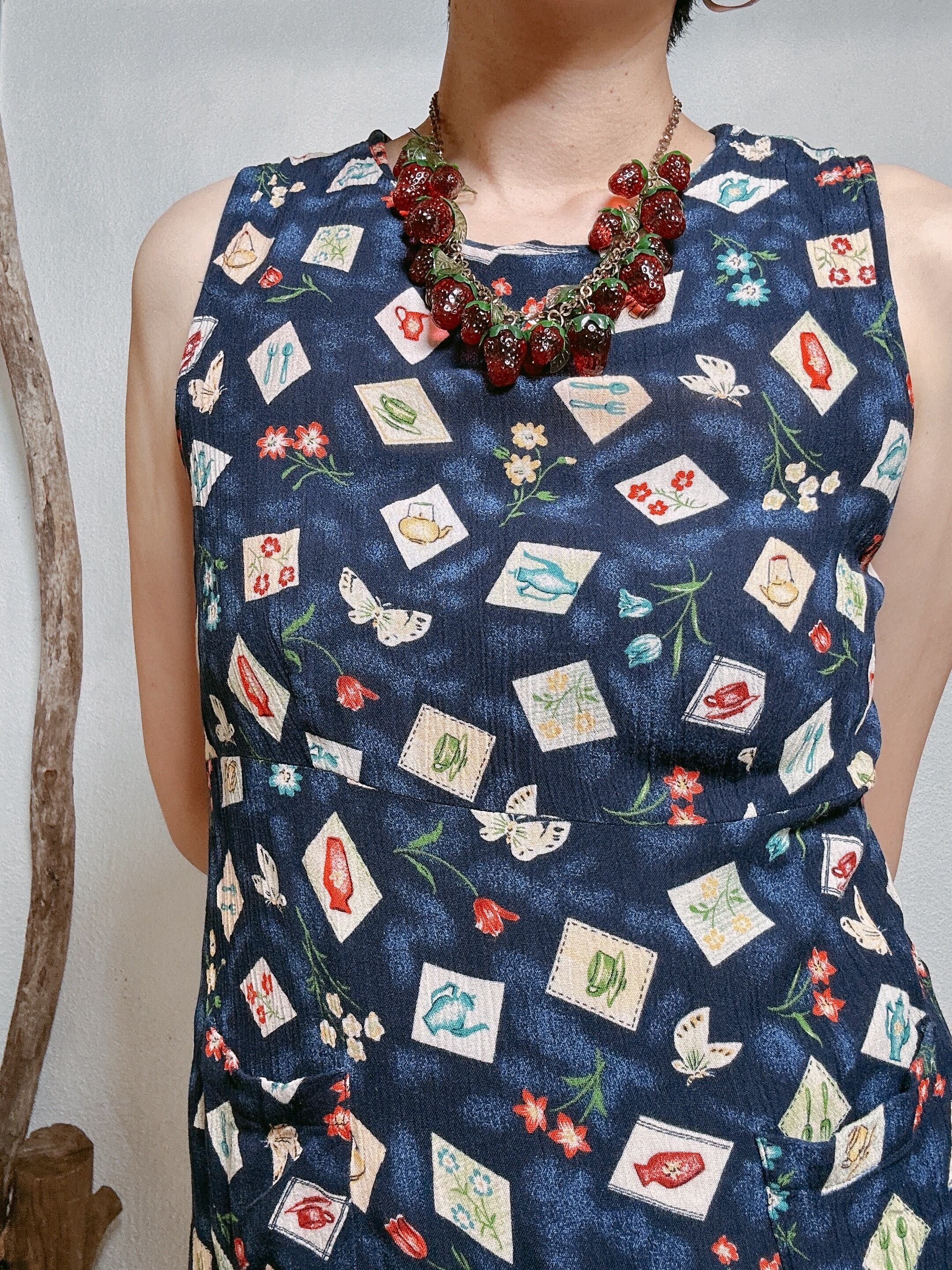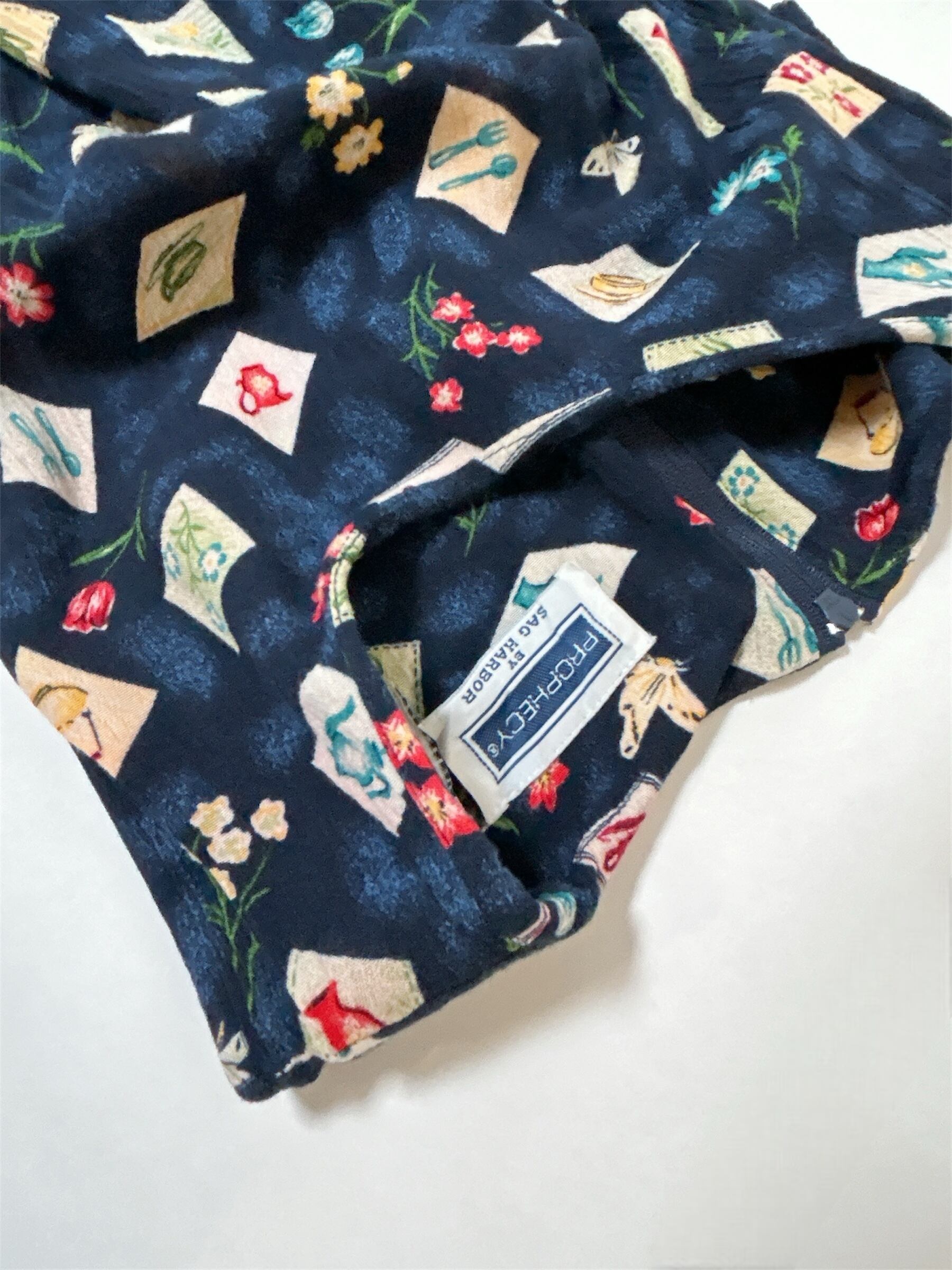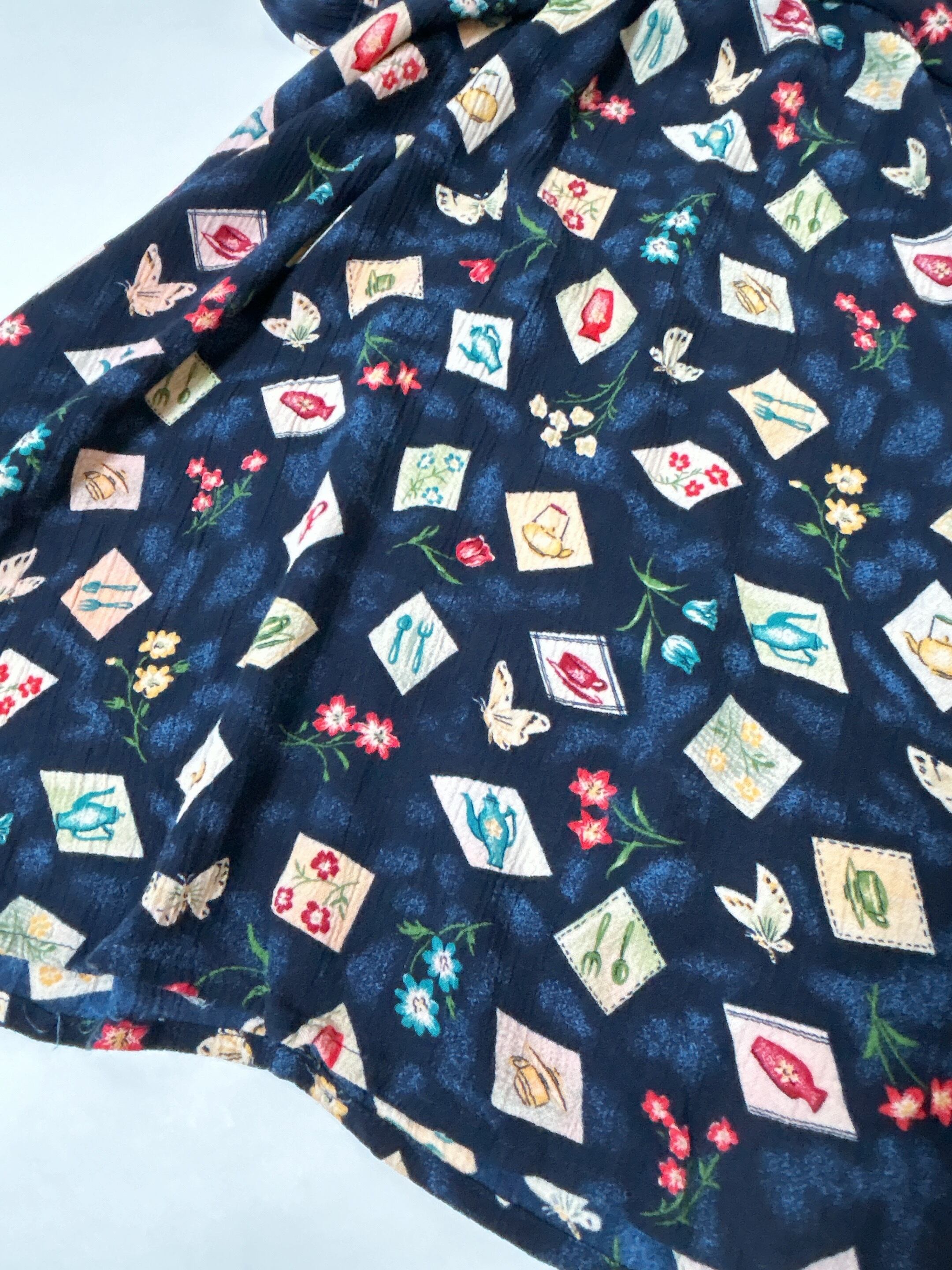 草花とキッチンアイテムがプリントされたガーリーで着るだけで特別感を演出してくれる一枚です。これからの季節にぴったりの軽やかな素材感で、快適に過ごせます。