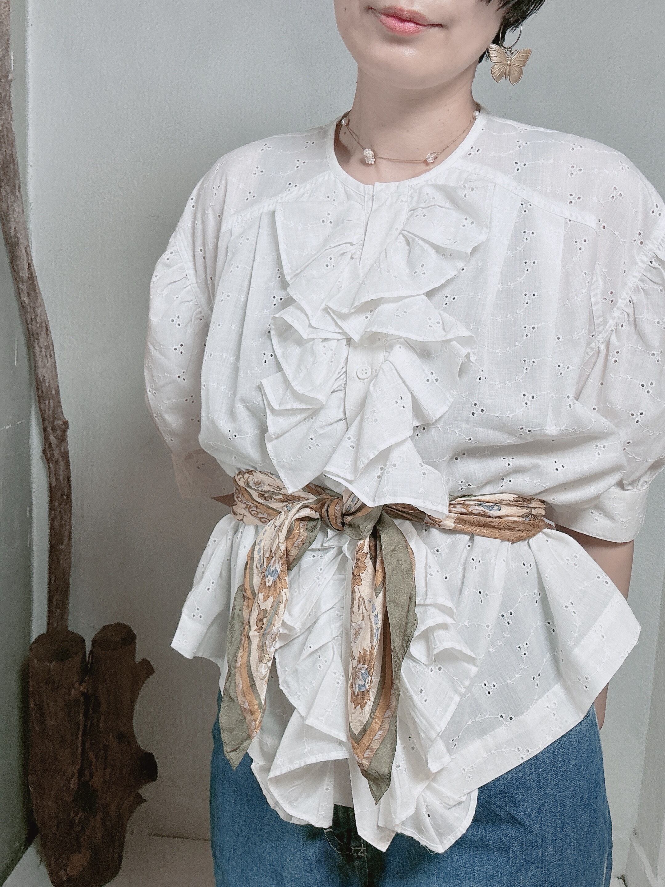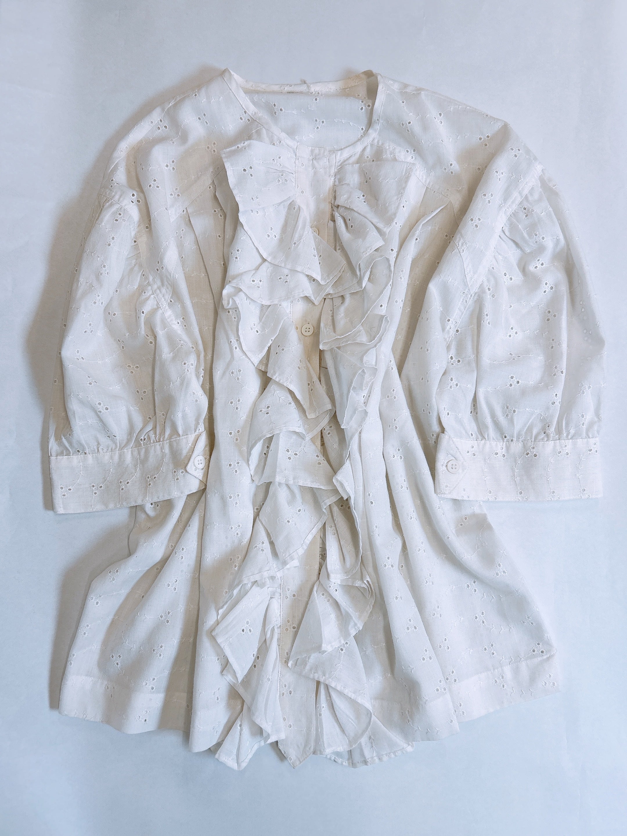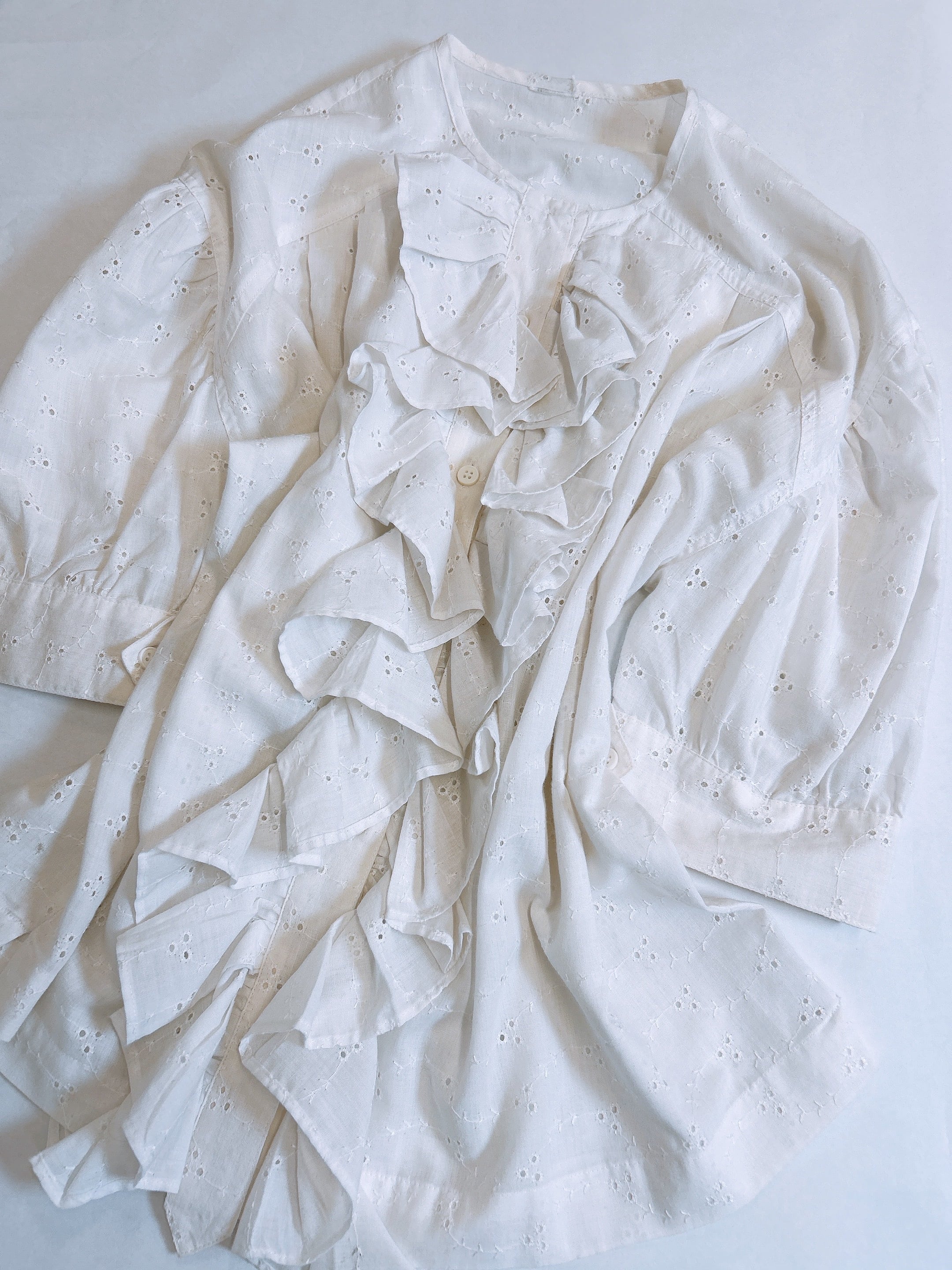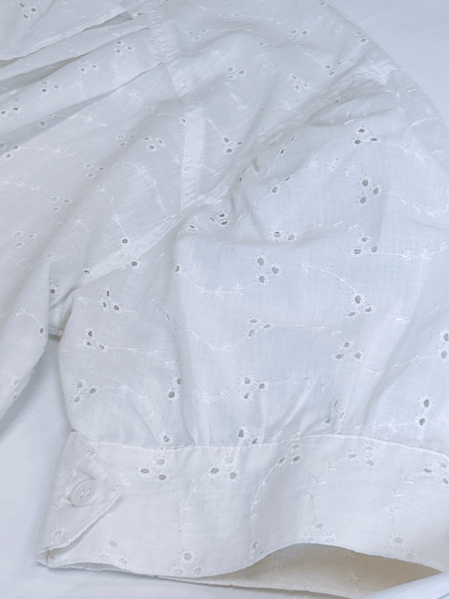 繊細なパンチング刺繍のレースが施されたコットンブラウスは、優雅さと可愛らしさを兼ね備えた一枚です。袖元はふんわりとした膨らみのあるパフスリーブとセンターフロントの大きいフリルが大人ガーリーな印象を与えてくれます。