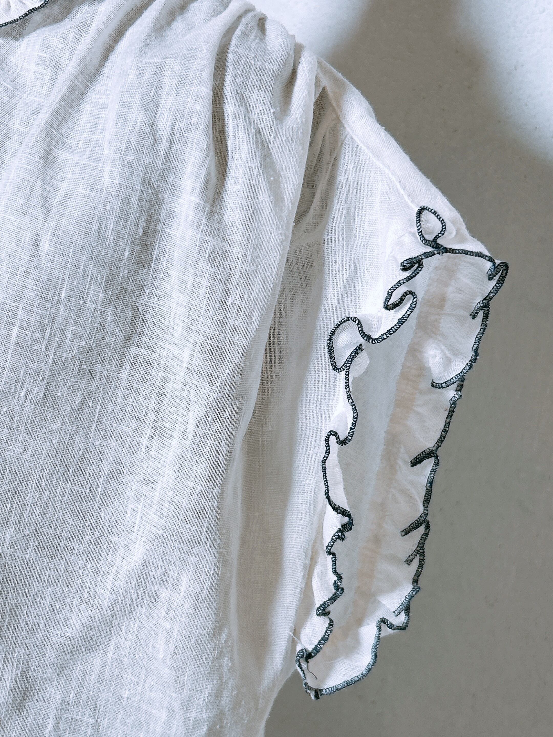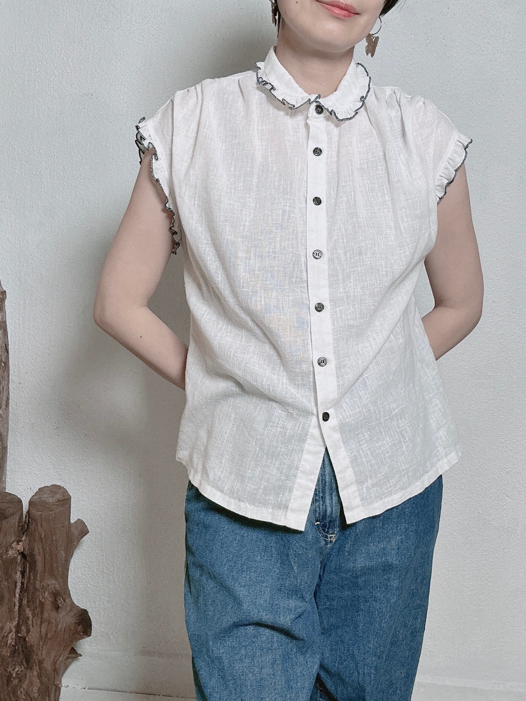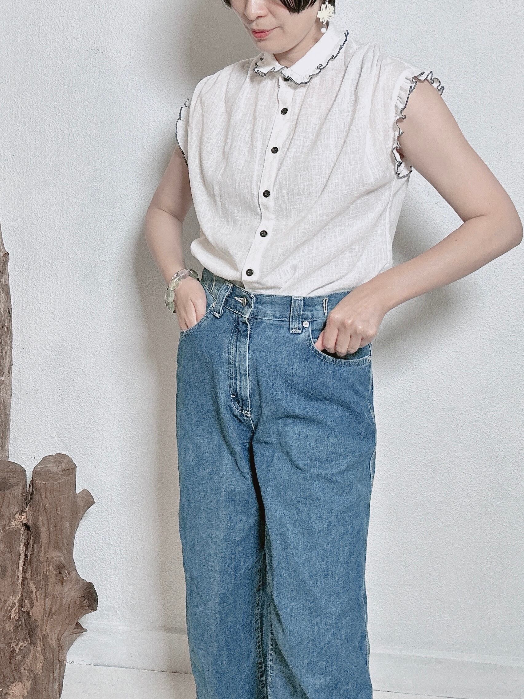 70年代のフリル袖のブラウスは軽やかな素材感と、心地よい肌触りが特徴で、日常使いや特別なシーンでも活躍します。透け感ある涼しげな白いガーゼ素材と、襟、袖元、ボタンには差し色でネイビーカラーが使われたフレンチスタイルのブラウスです。