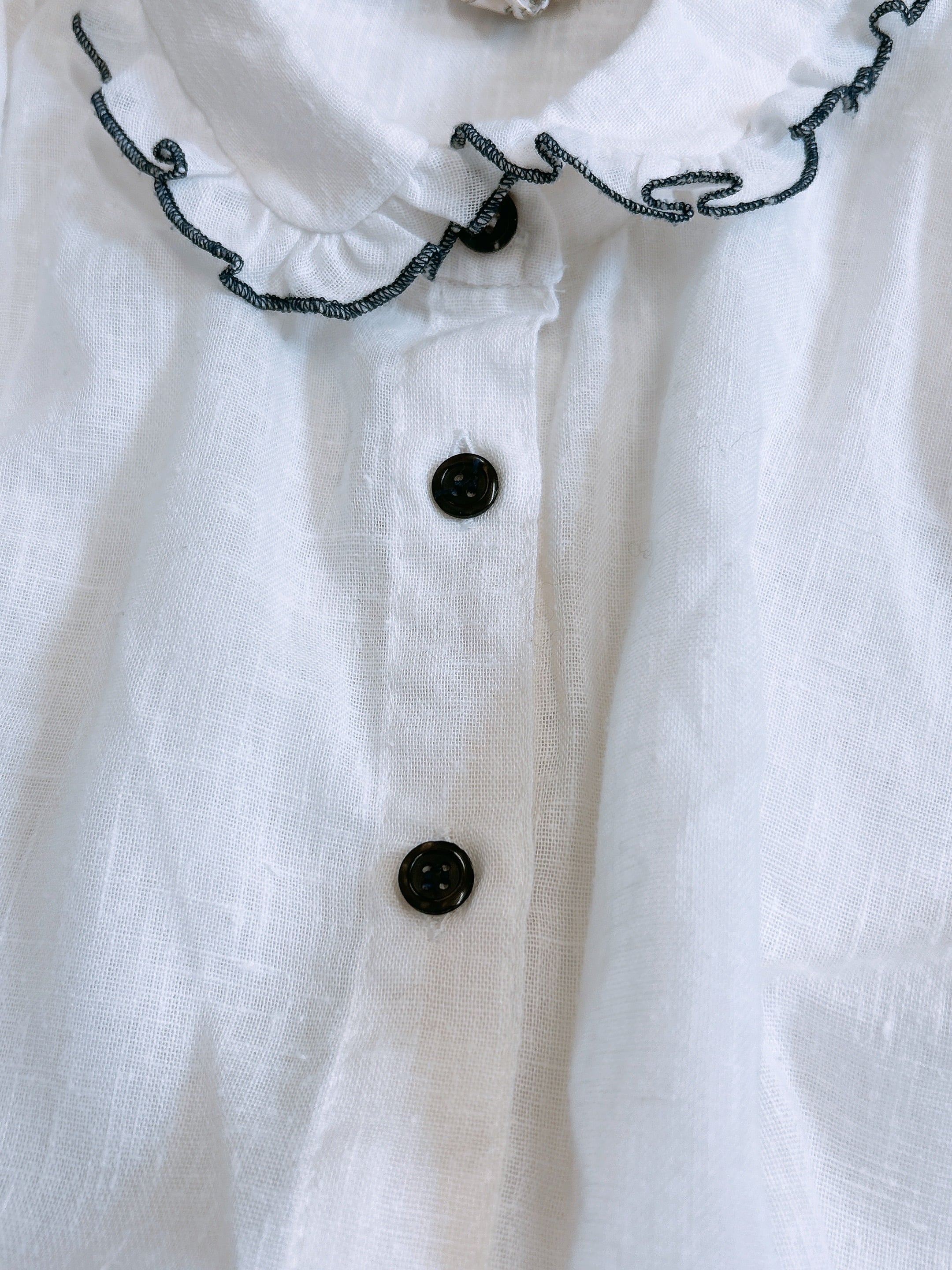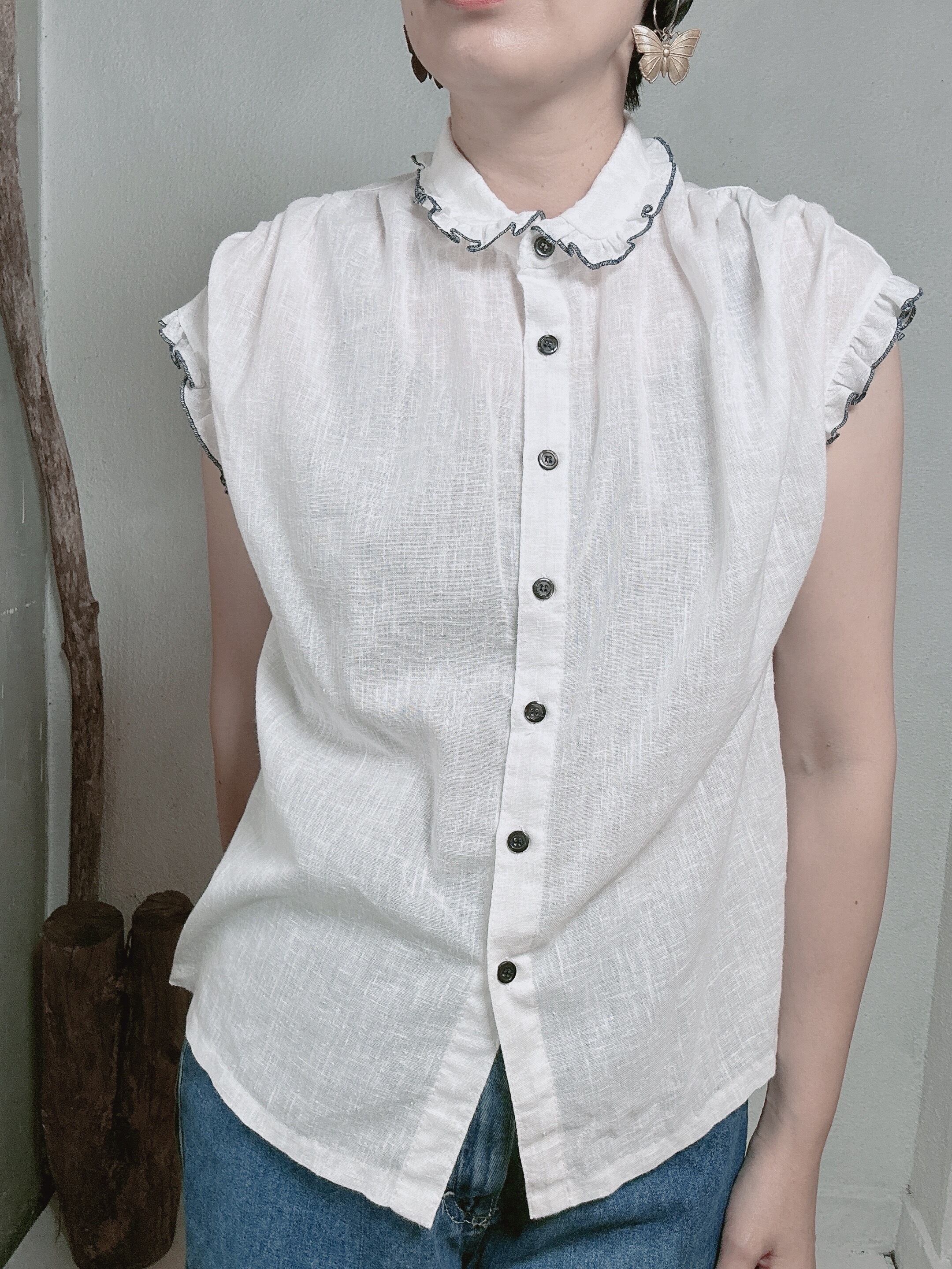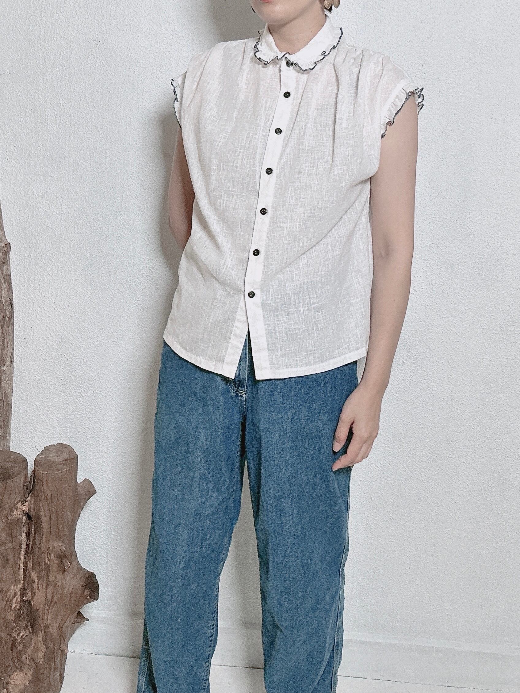70年代のフリル袖のブラウスは軽やかな素材感と、心地よい肌触りが特徴で、日常使いや特別なシーンでも活躍します。透け感ある涼しげな白いガーゼ素材と、襟、袖元、ボタンには差し色でネイビーカラーが使われたフレンチスタイルのブラウスです。