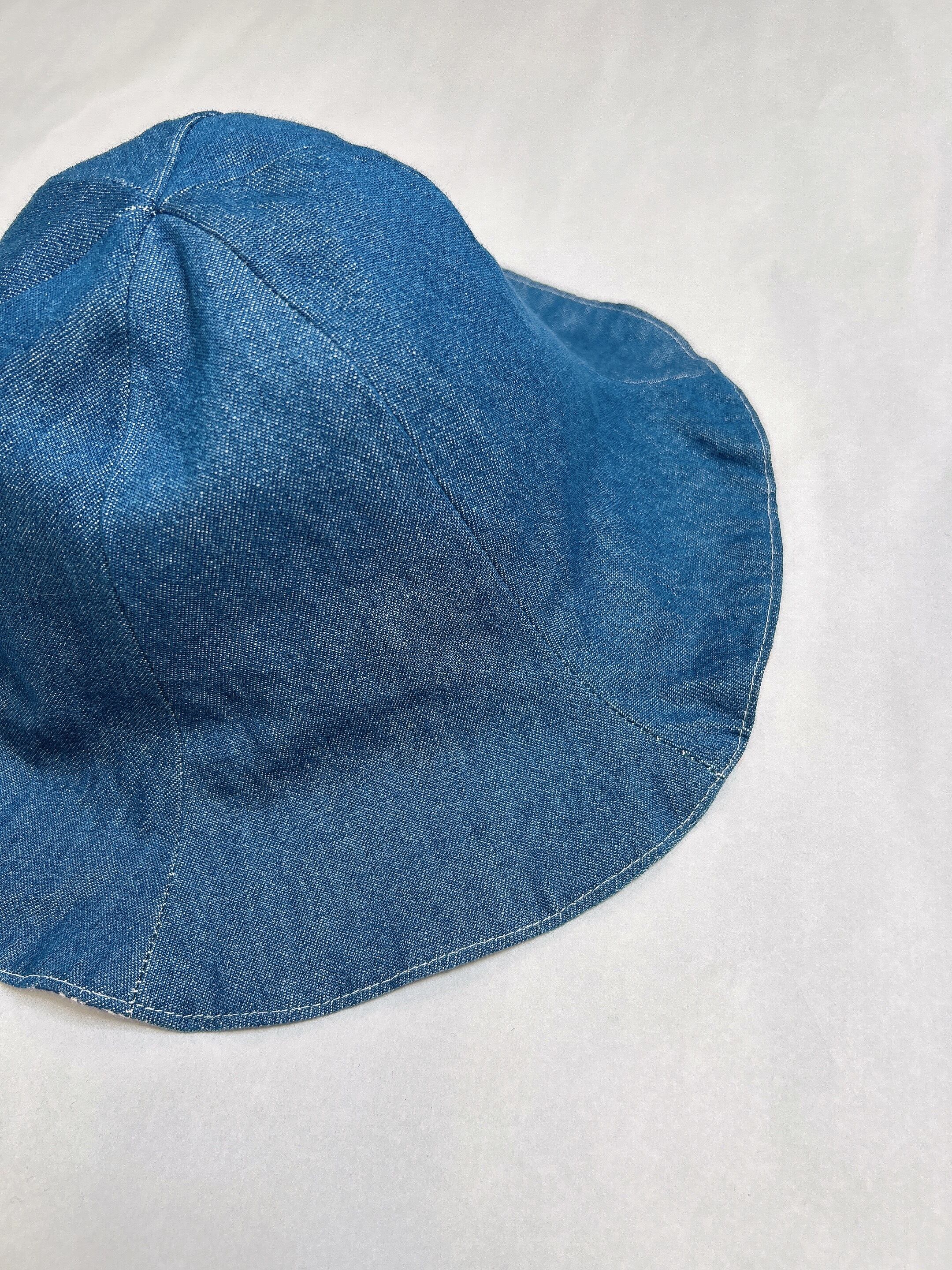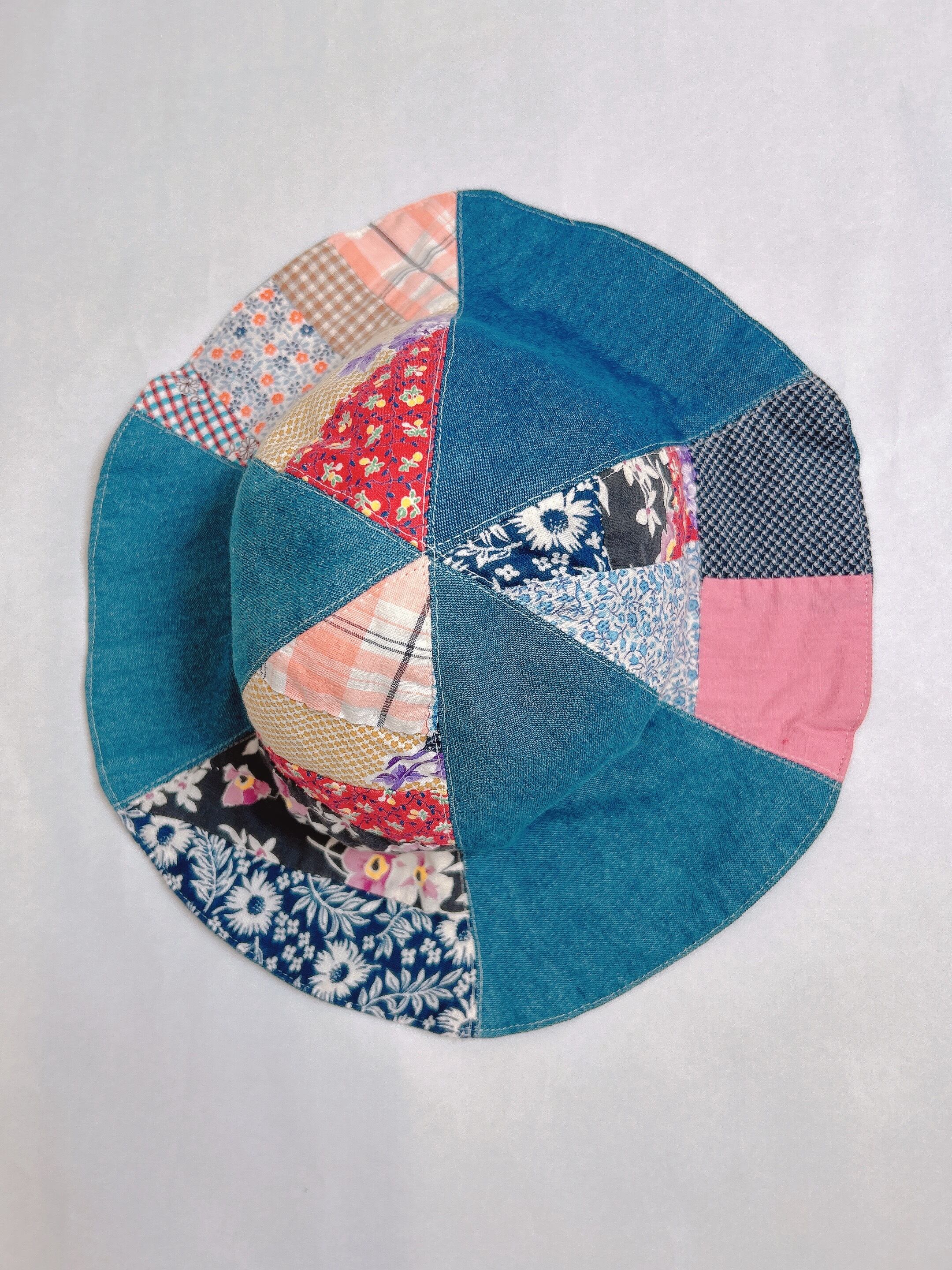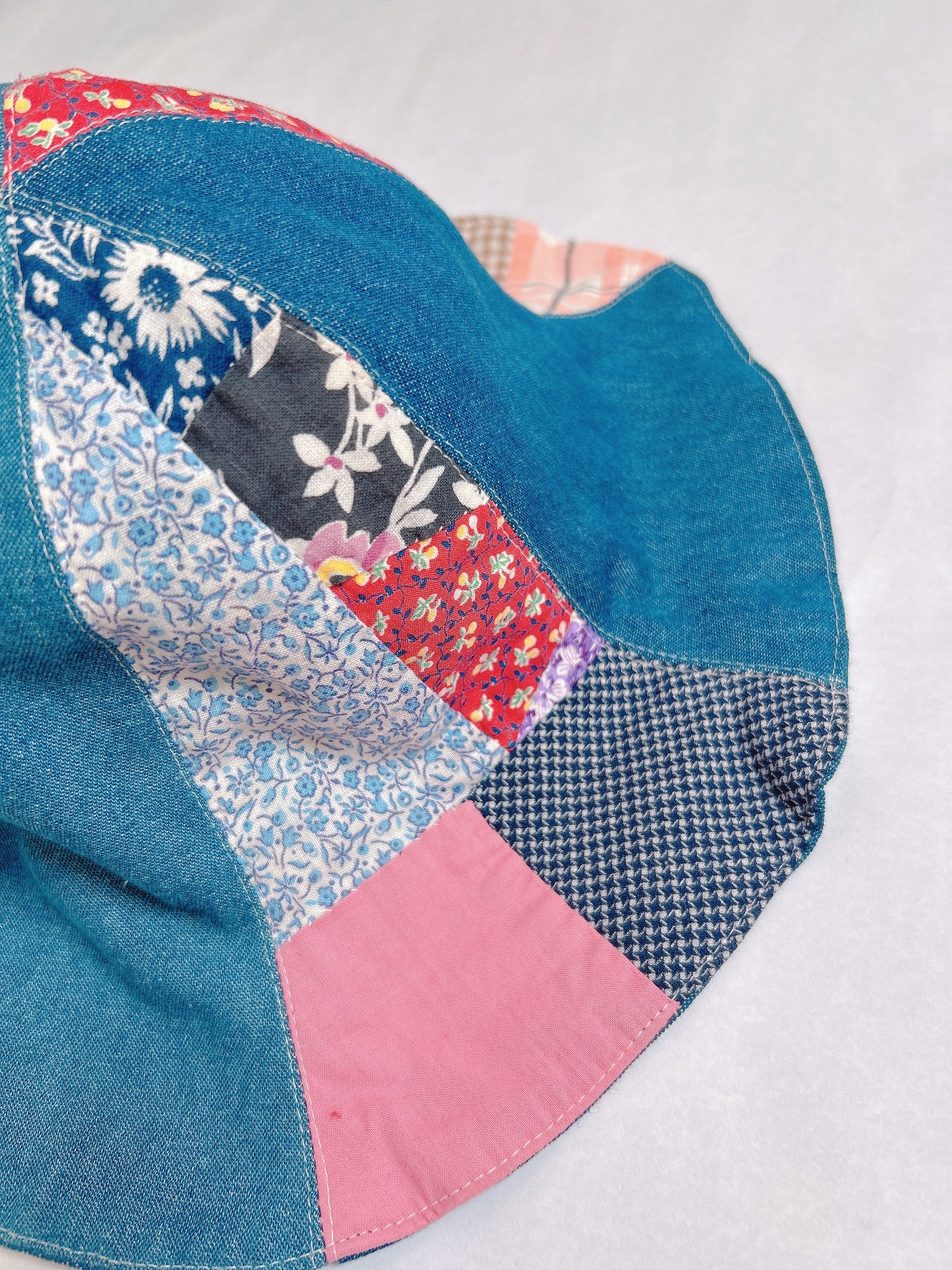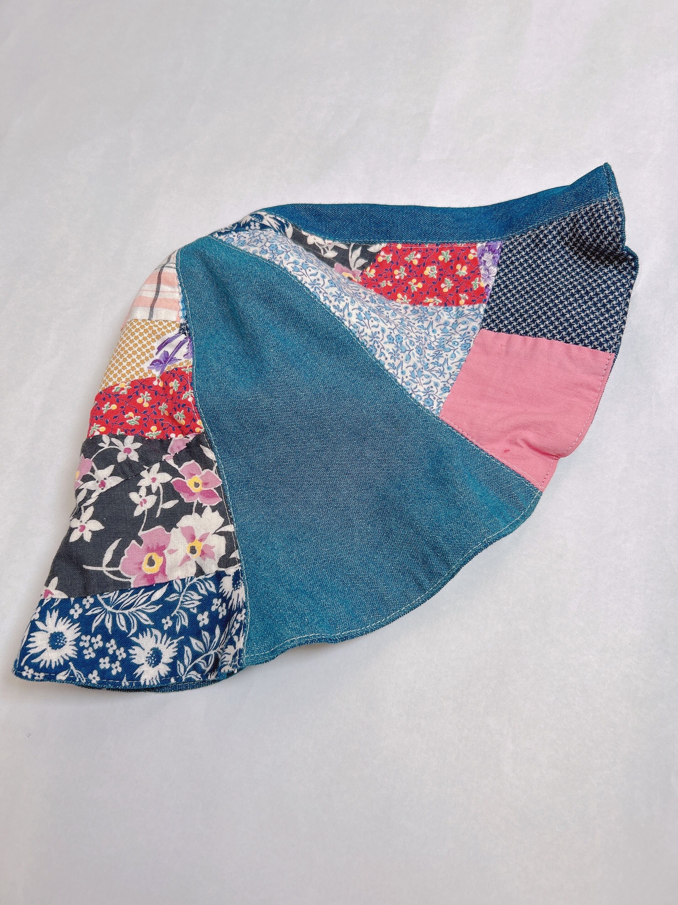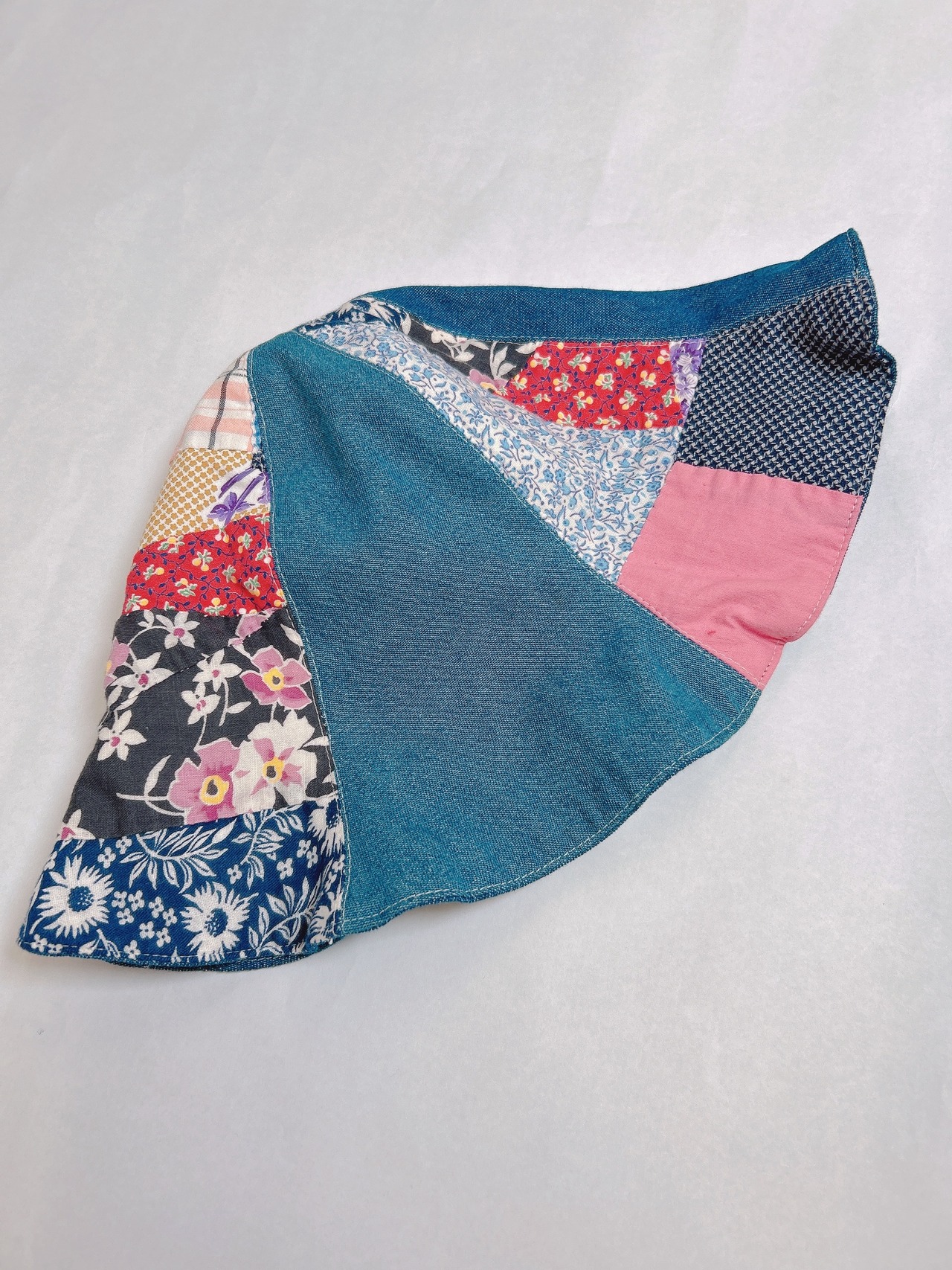 ヴィンテージの布地を使った、リバーシブルのチューリップハット。