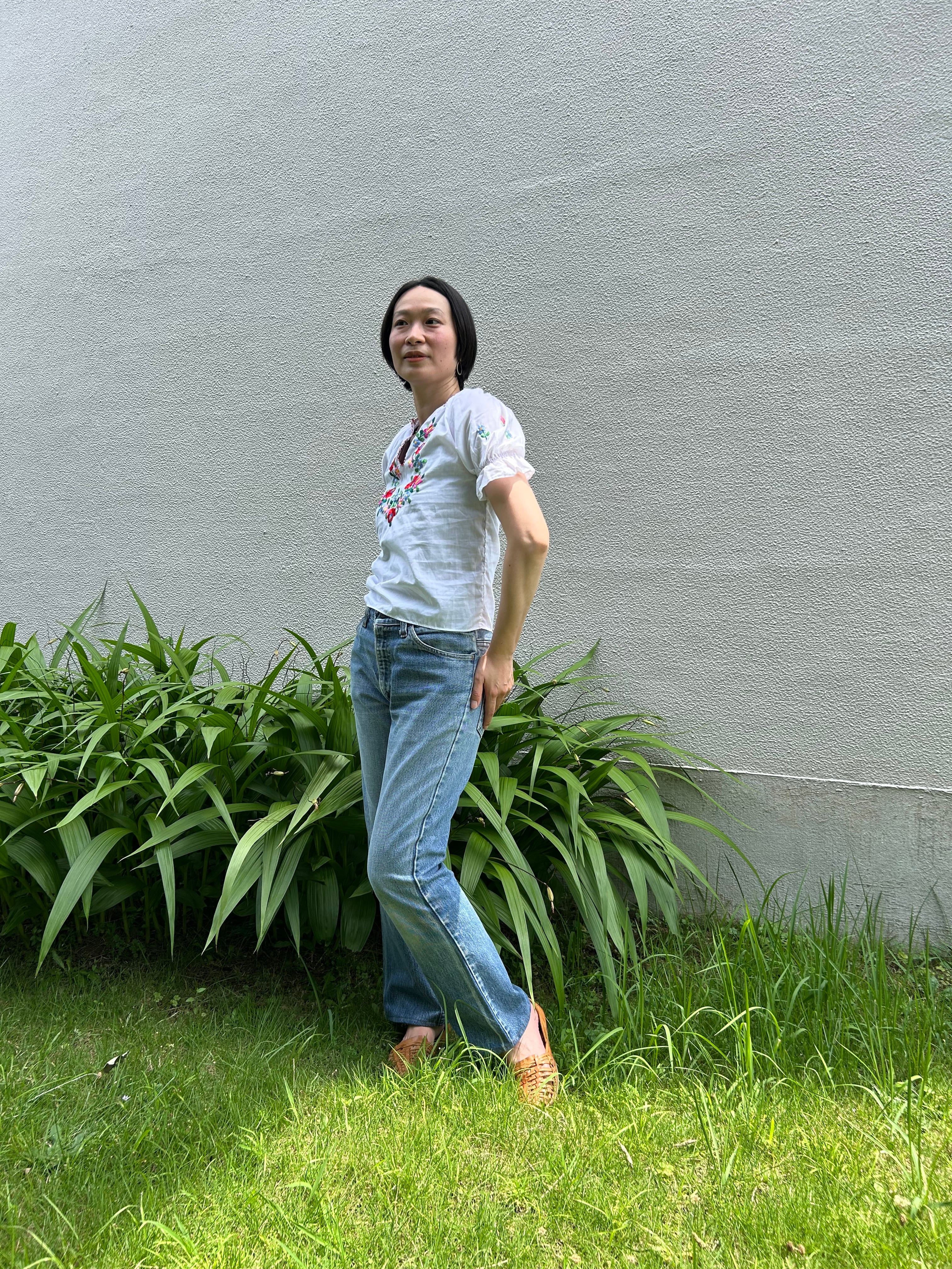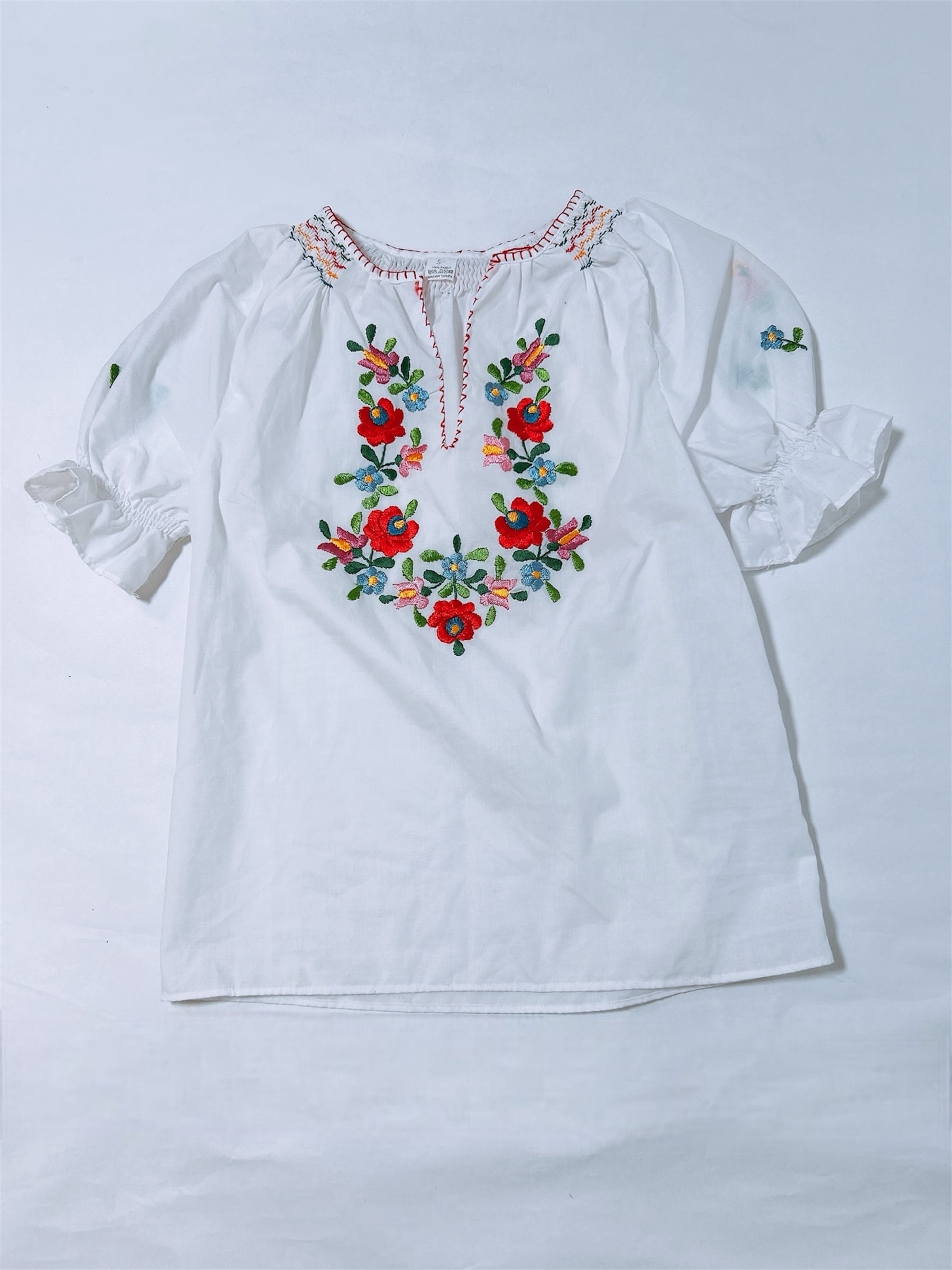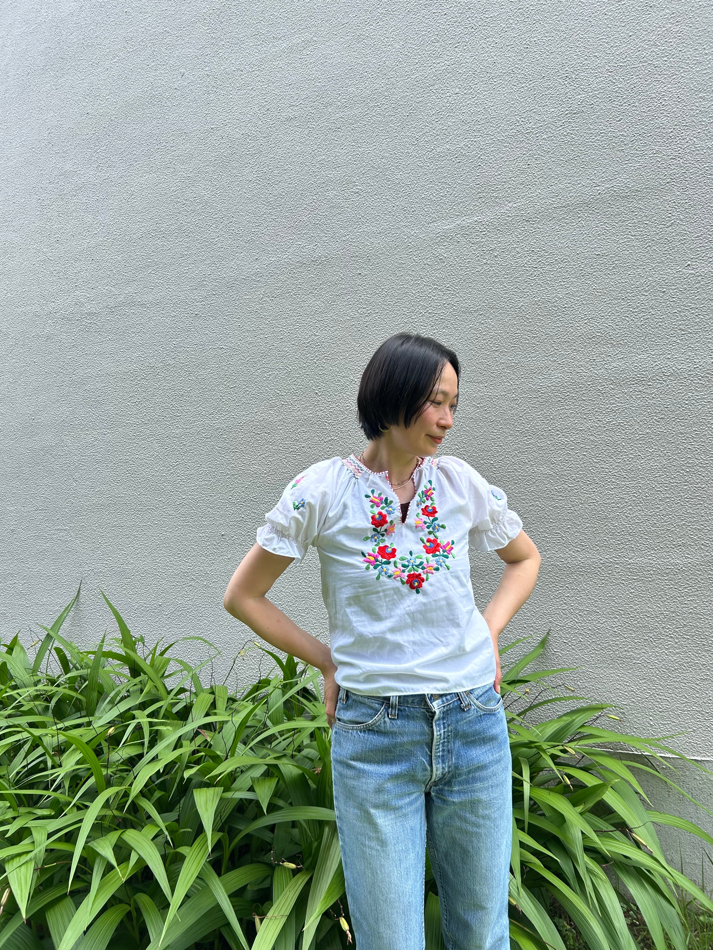 真っ白なコットンに、鮮やかな花々が映えるハンガリー刺繍のヴィンテージブラウス。胸元のV字刺繍が顔まわりを華やかに見せてくれます。ふんわり袖と軽やかな素材感で、暑い季節にもぴったり。デニムと合わせてラフに着こなしても◎