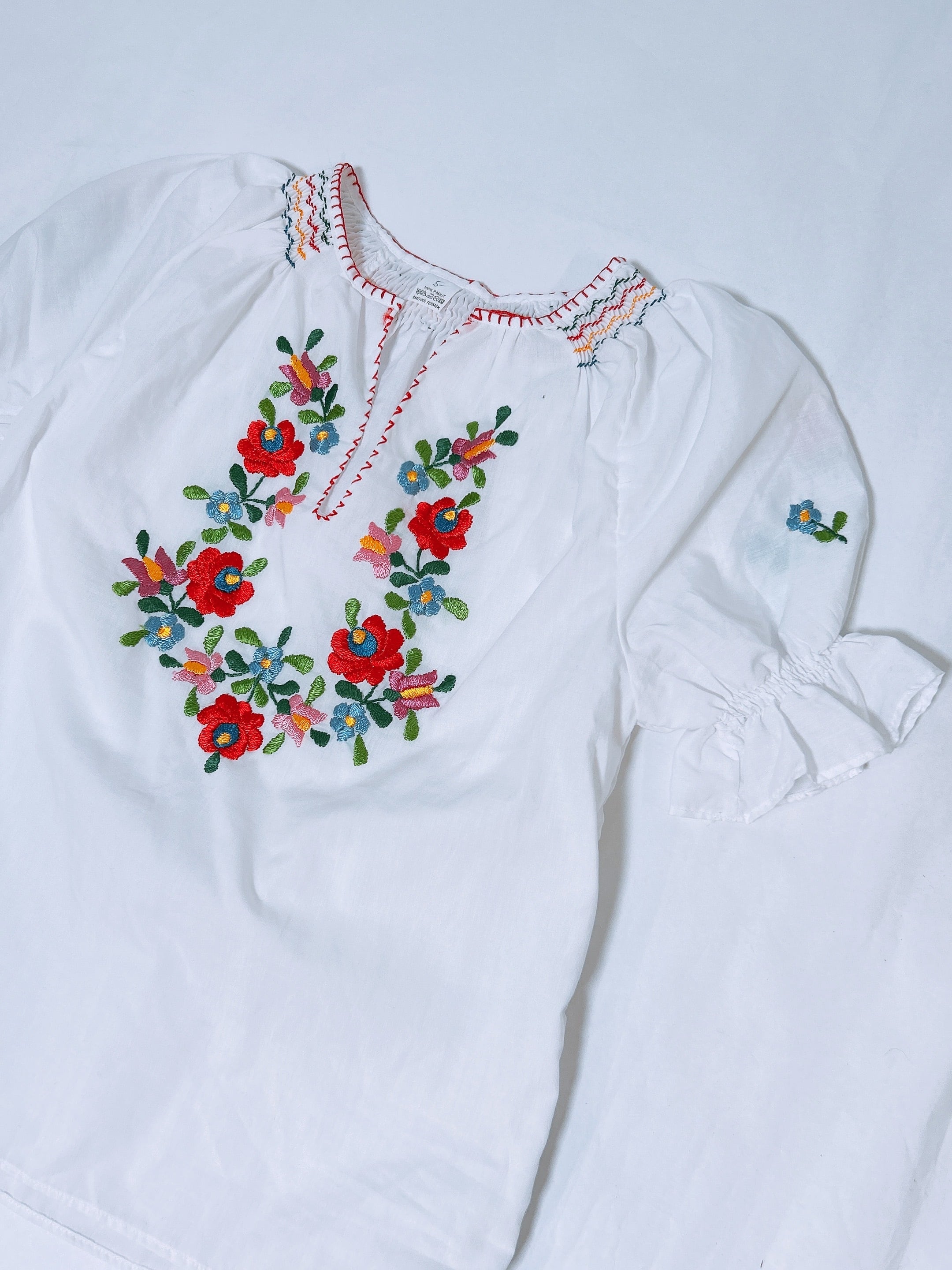 Floral Echoes from Hungary – Vintage White Cotton Blouse m135