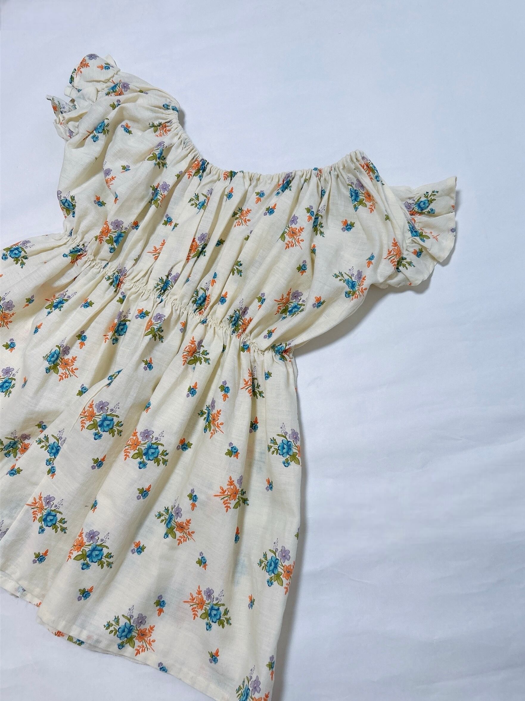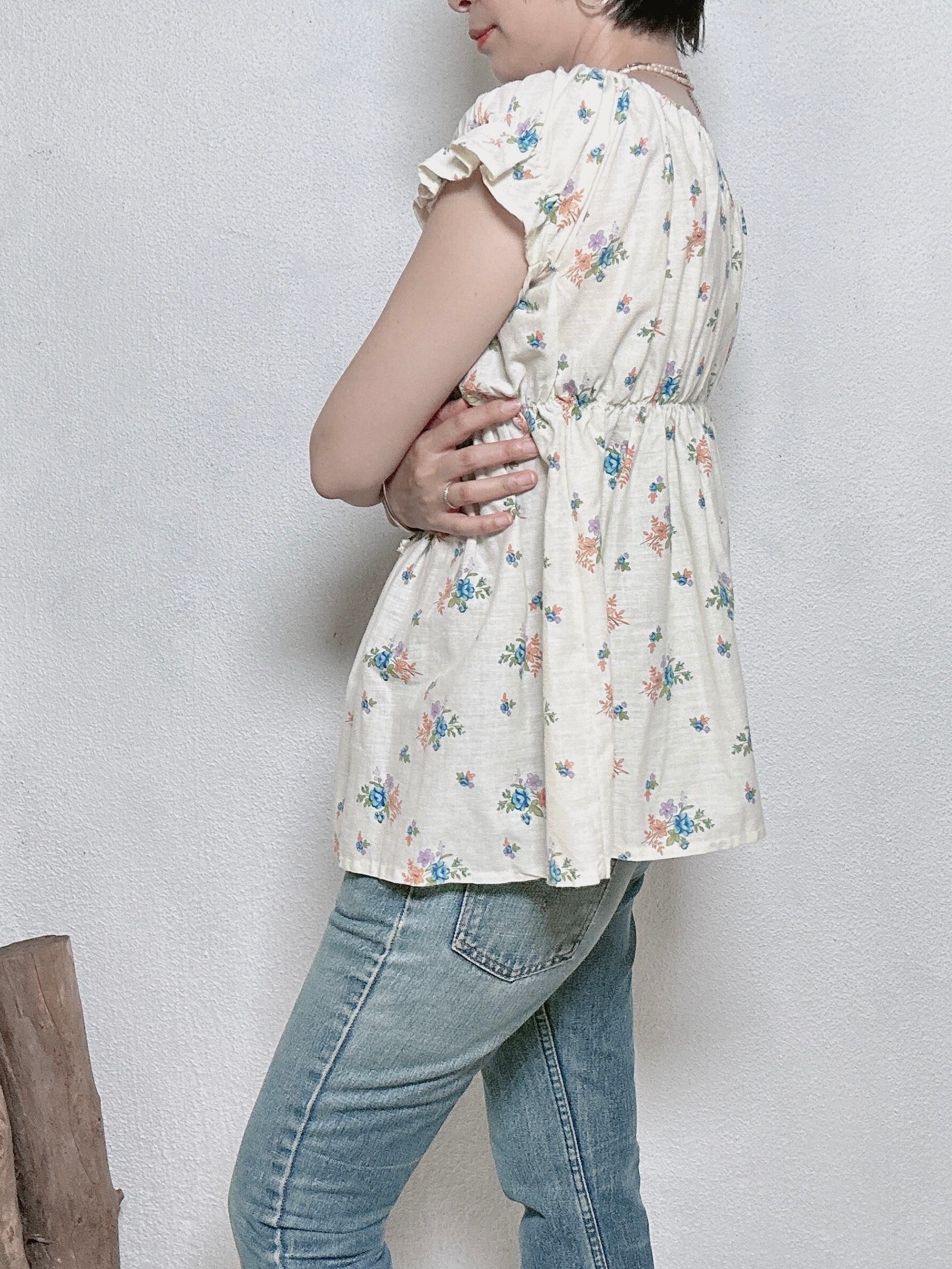 ナチュラルな花柄がかわいいヴィンテージのペザントトップス。肩を出してオフショルダーにしても、フリル袖で着てもOKな2WAY仕様で、その日の気分やスタイリングに合わせて楽しめます♪