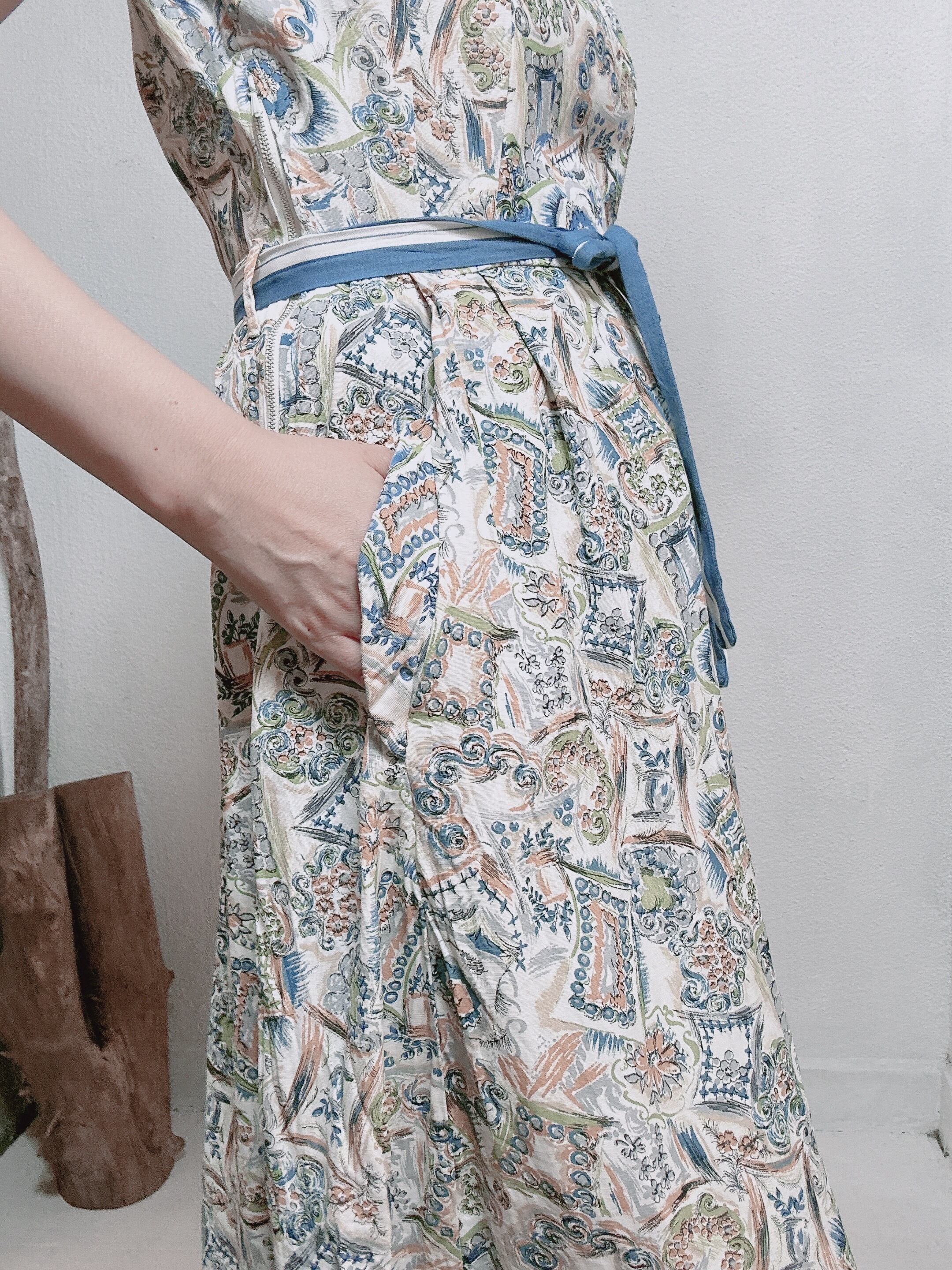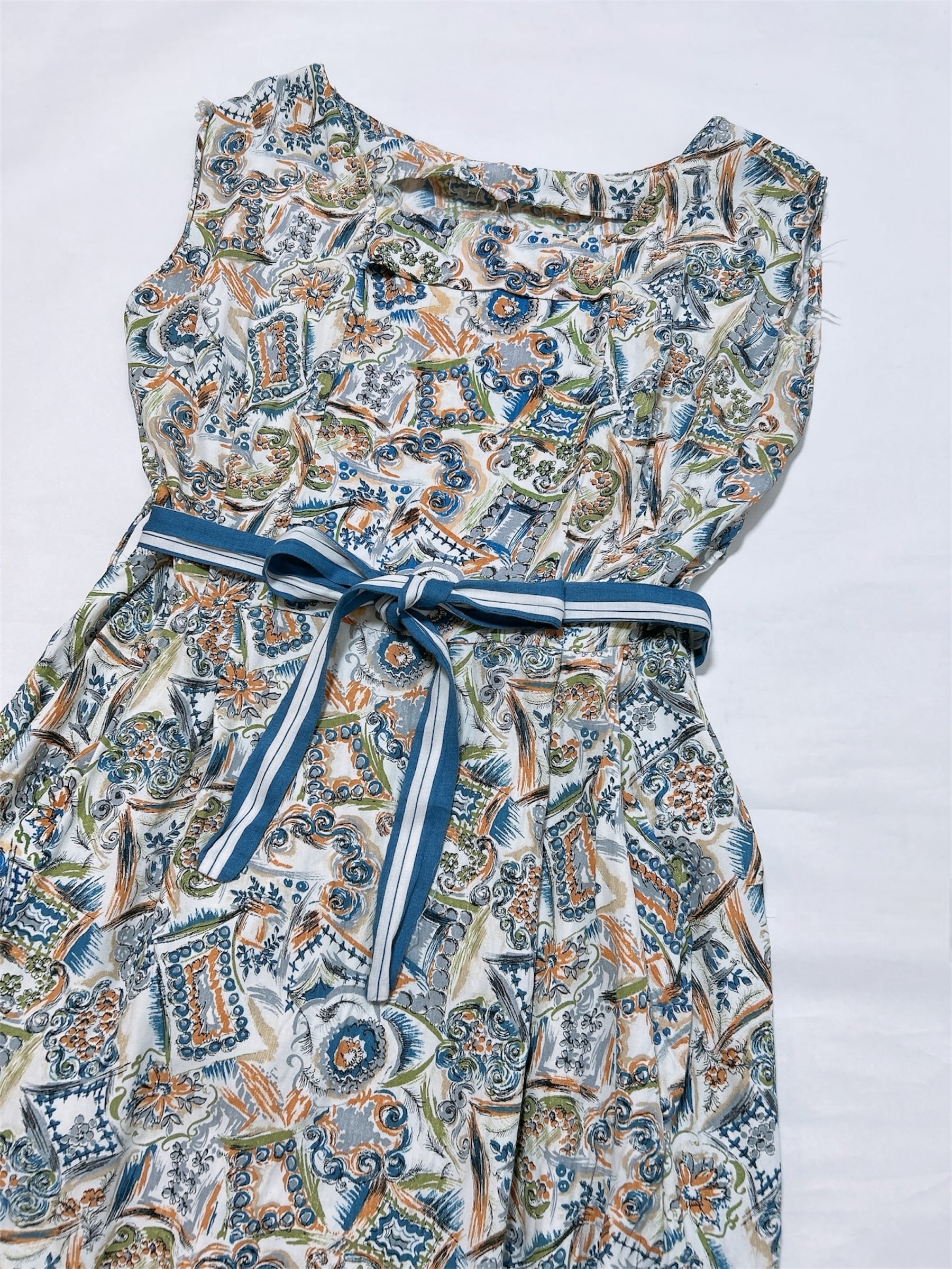 Vintage Boho Print Dress with Blue Waist Tie – Timeless Charm m144