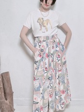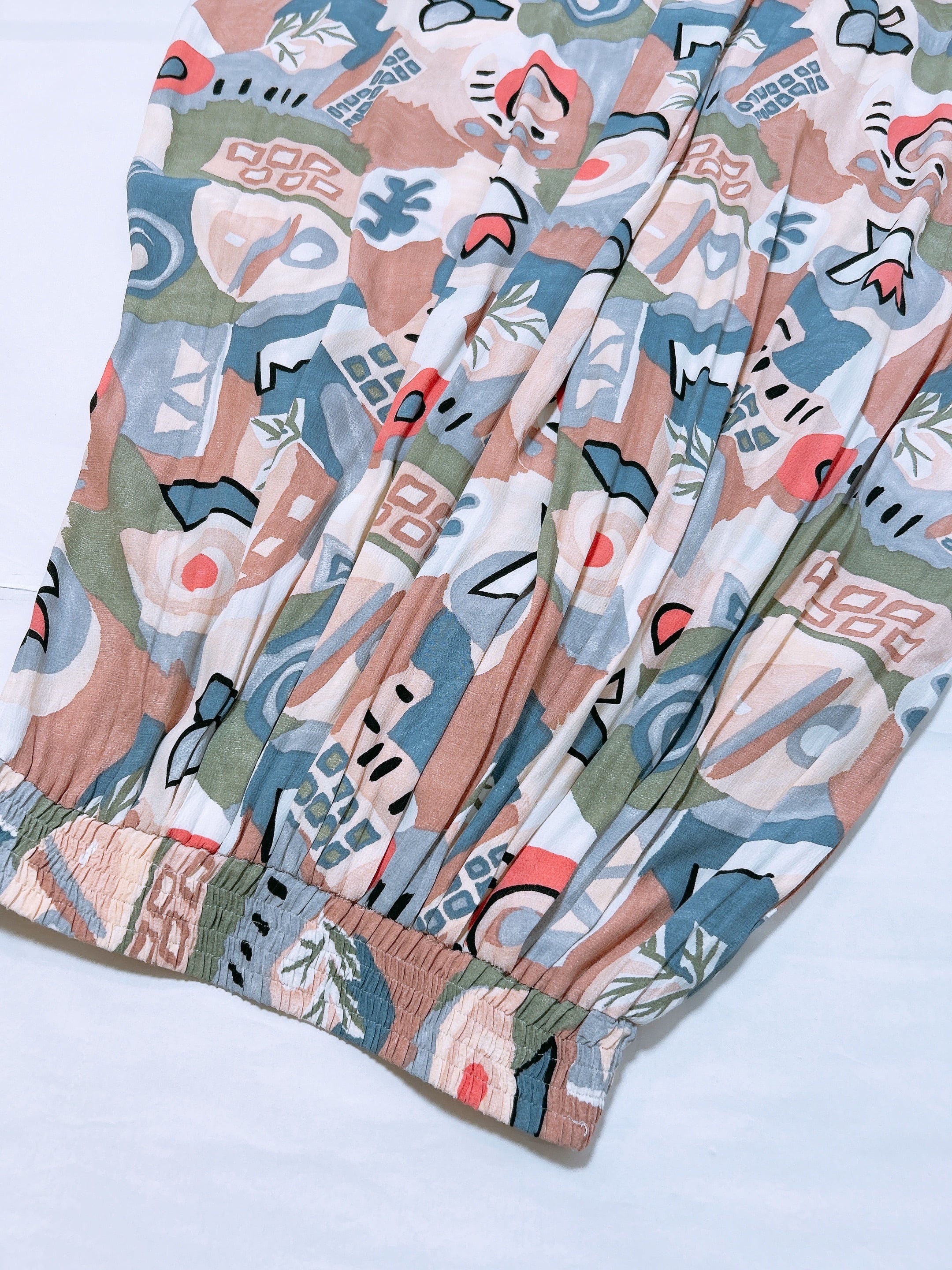 リズミカルな線とカラフルなモチーフが、まるで抽象画みたいに広がるデザイン。軽やかで柔らかな素材感に、リラックス感のあるシルエット。