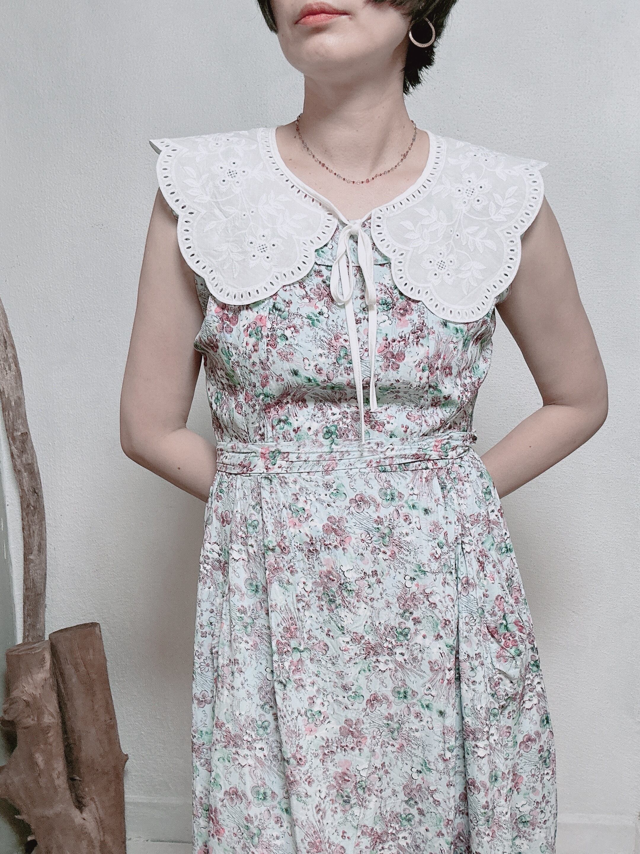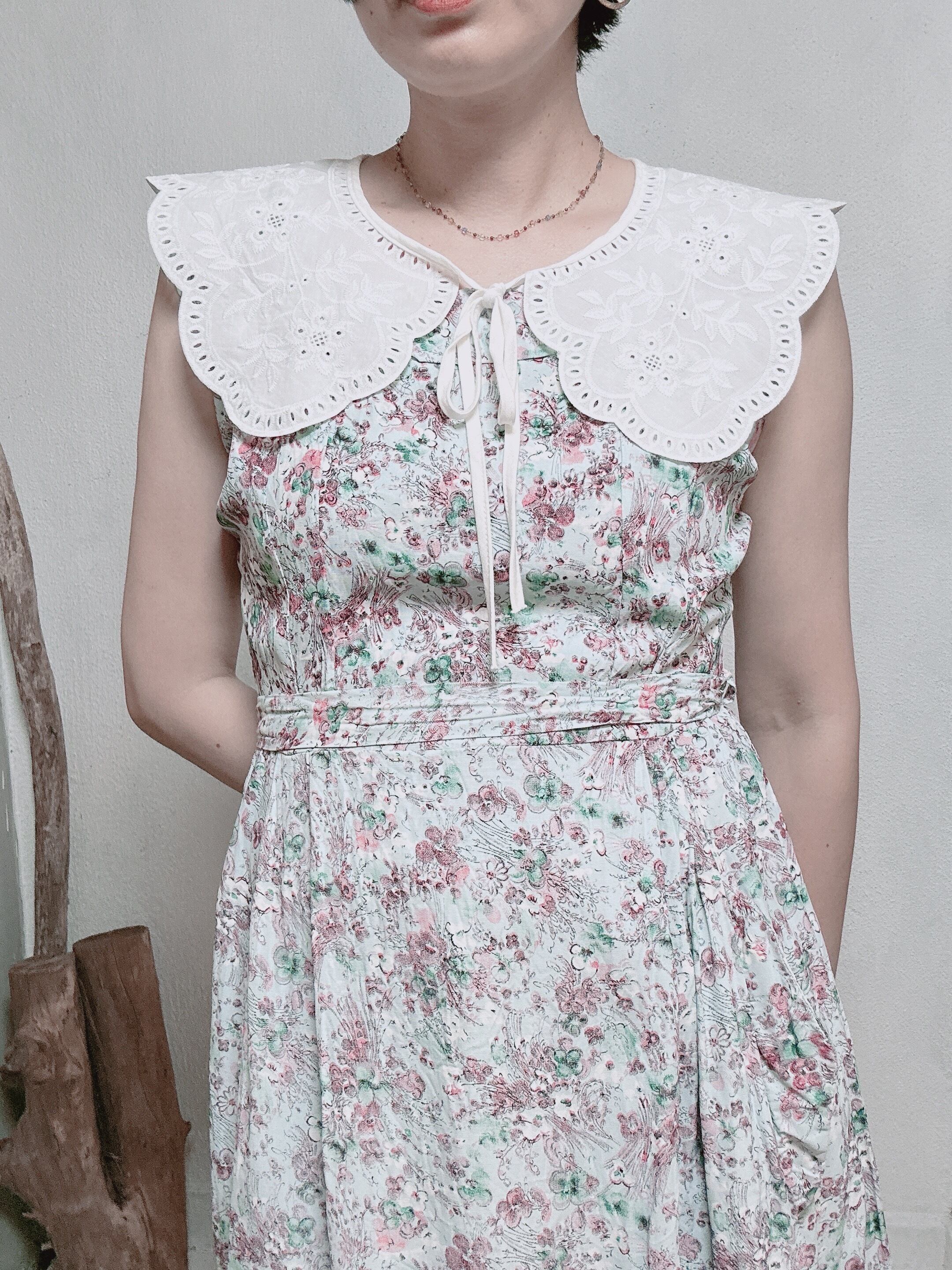 上品なスカラップカットに、花模様の刺繍が施されたヴィンテージのレースカラー。