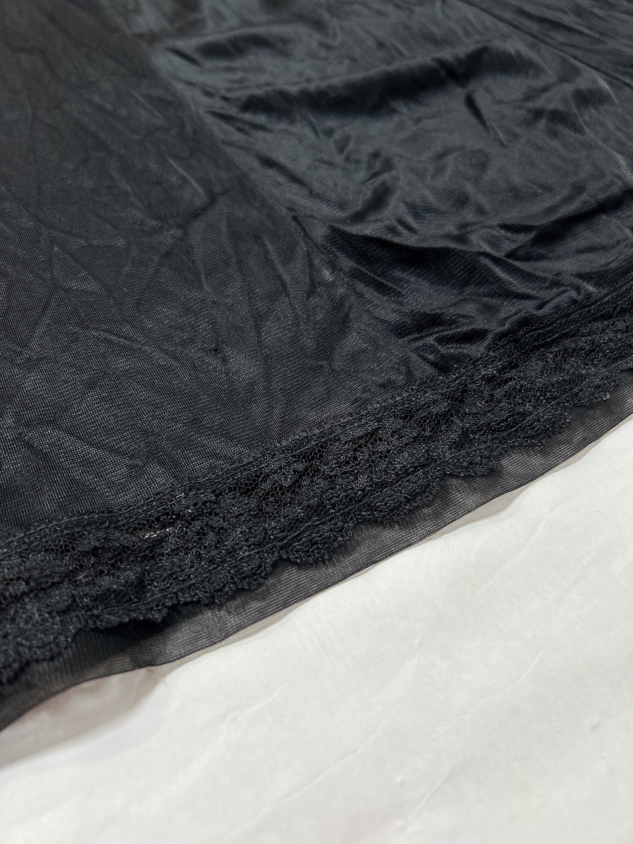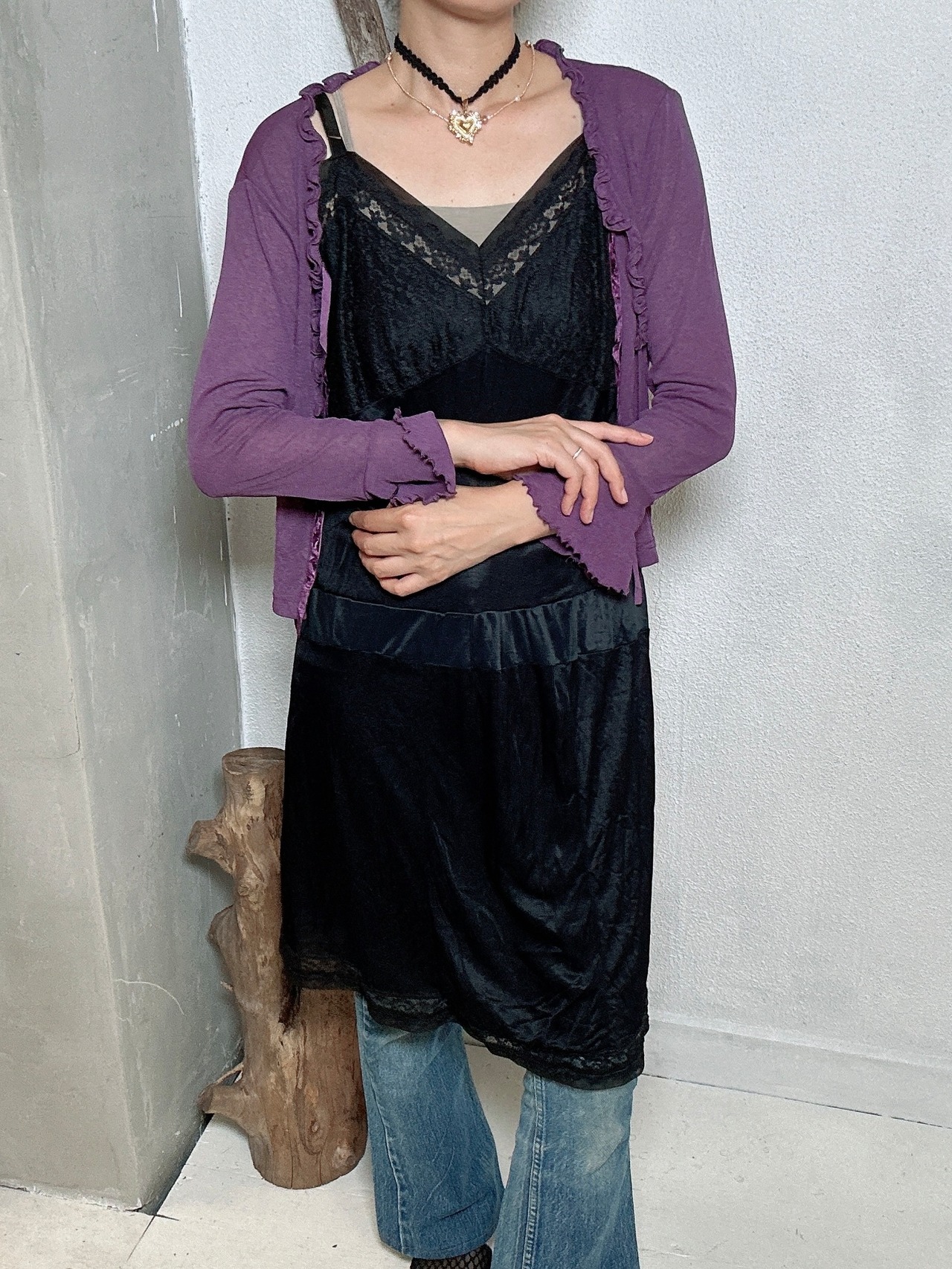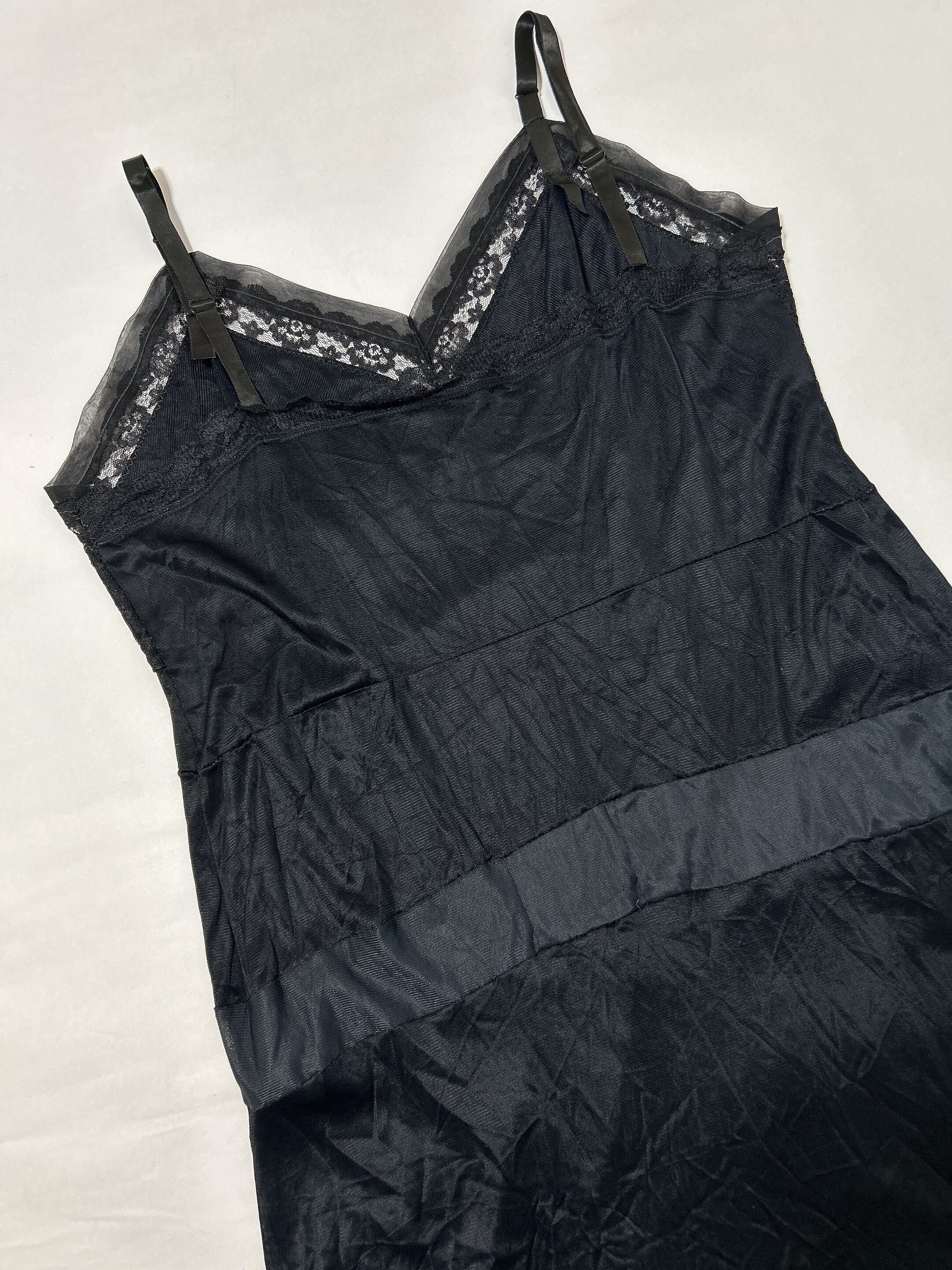 艶やかなブラックサテンとレースの切り替えが魅力的なランジェリーキャミソールドレス。胸元の繊細なレースと、程よく体に沿うシルエットが女性らしさを引き立てます。ワンピースとしても、デニムやパンツとのレイヤードスタイルにもおすすめの一枚。古着ならではの雰囲気があり、大人の抜け感を演出してくれます。