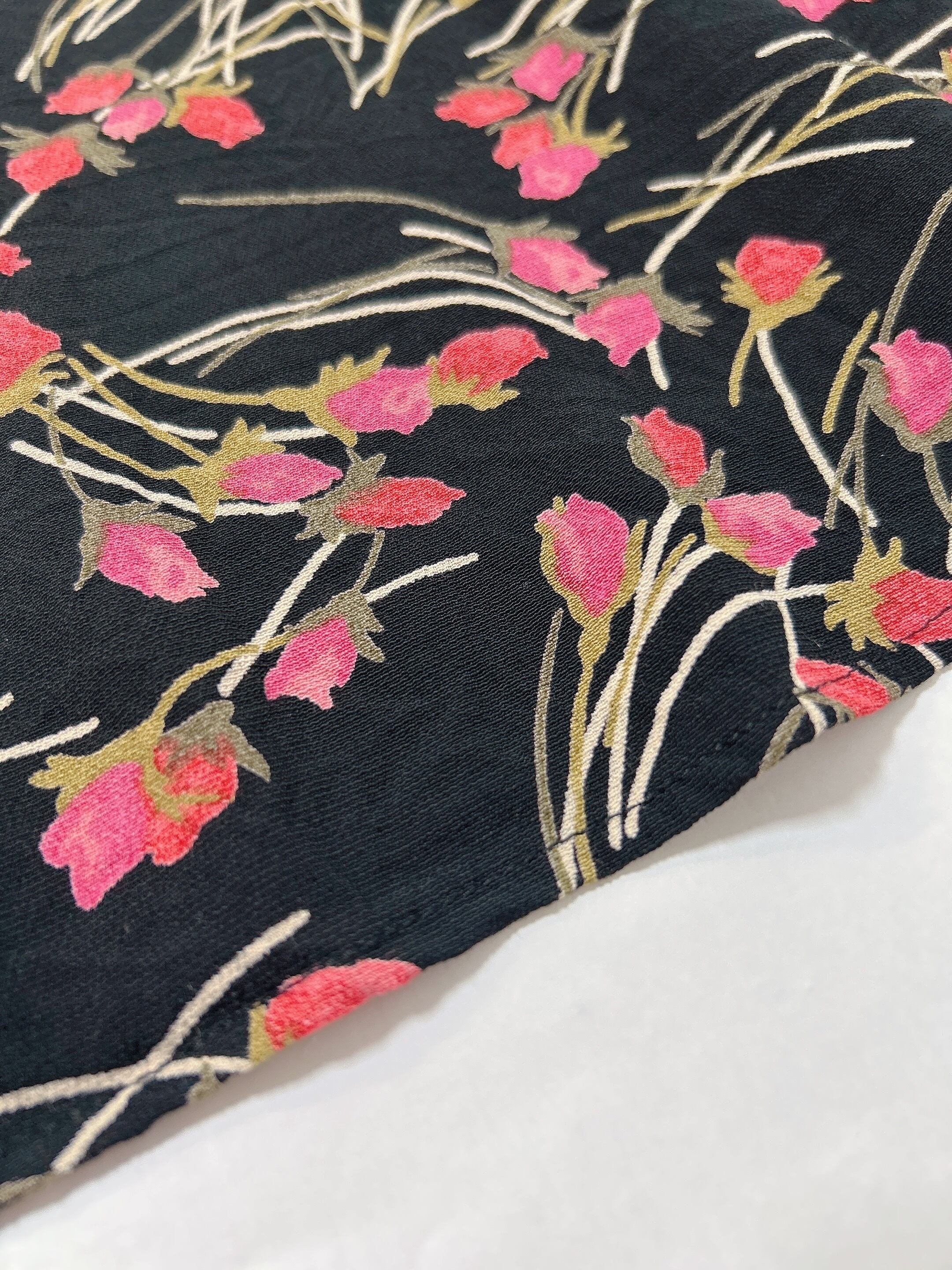 ブラックベースにピンクの花柄が映えるヴィンテージのミディ丈スカート。さらっとした素材感で着心地も軽やか。ウエストは程よくフィットし、裾にかけてすっきりと広がるシルエットが女性らしい印象を演出します。シンプルなトップスと合わせるだけで、コーディネートの主役になってくれるアイテムです。
