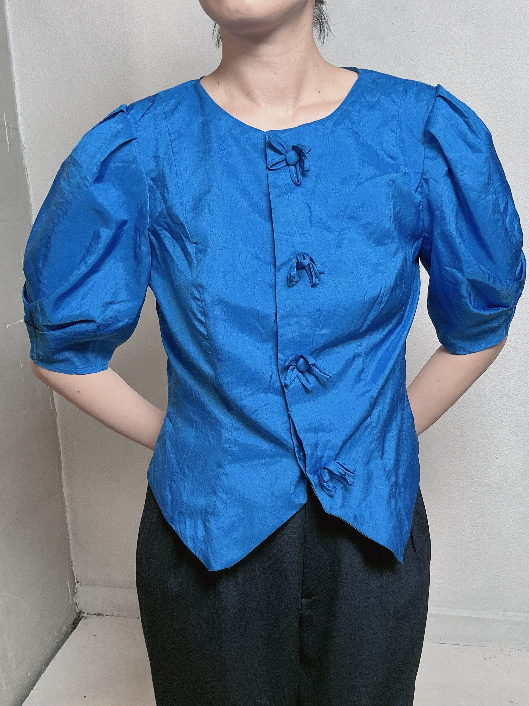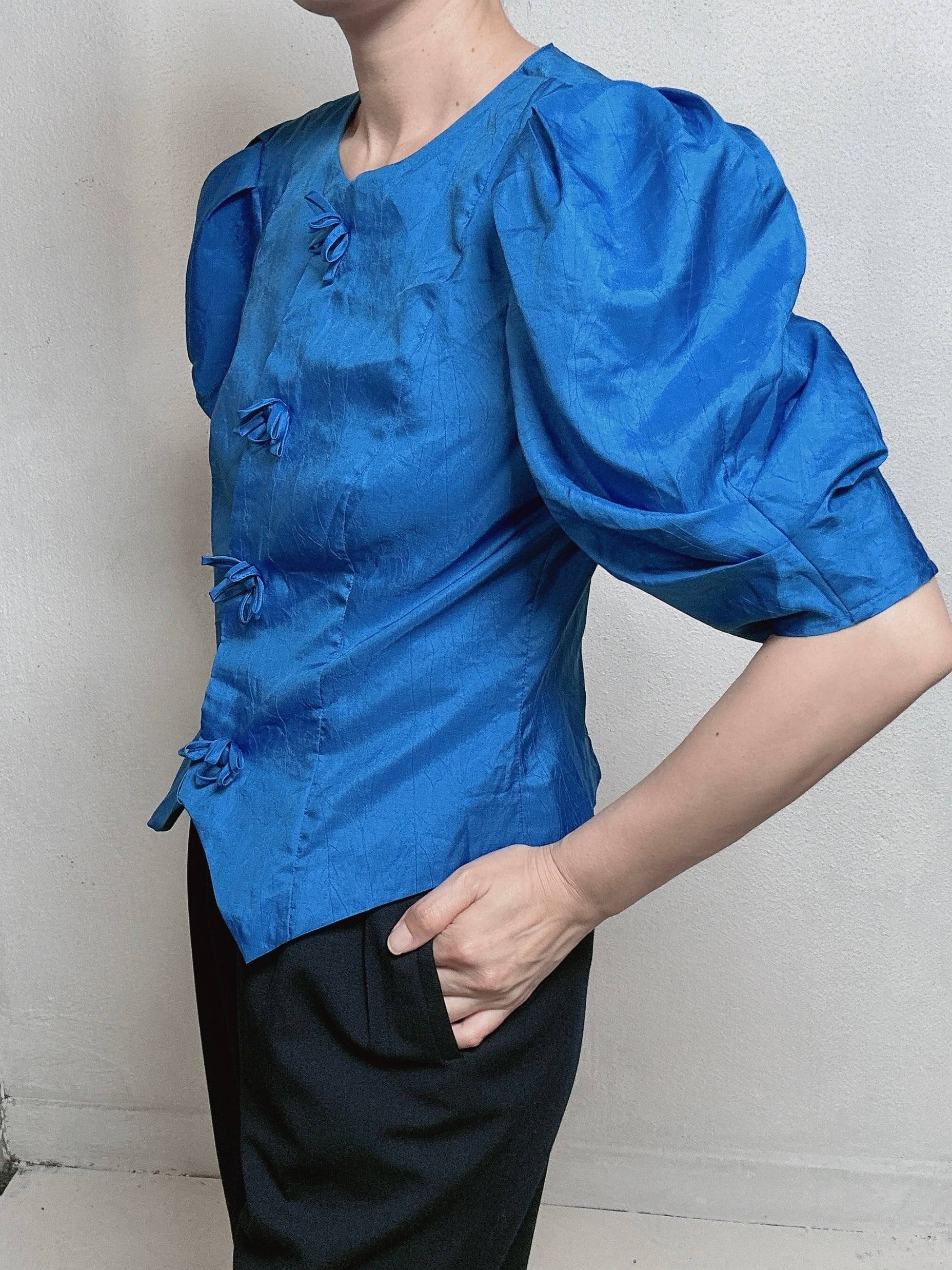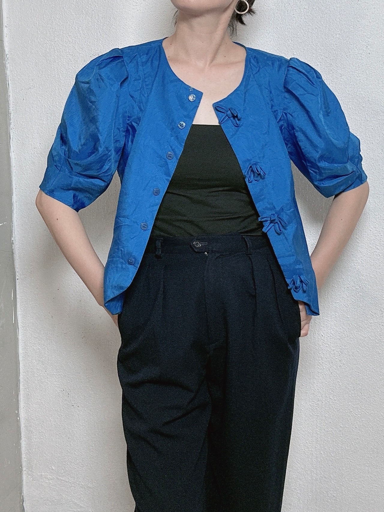 こちらは1980年代のVera Montによるヴィンテージジャケットブラウスです。鮮やかなブルーの高品質な生地で作られた、特徴的なパフスリーブが印象的なアイテム。フロントのボタンディテールがアクセントになり、エレガントでありながらも少し遊び心のあるデザインが魅力です。
