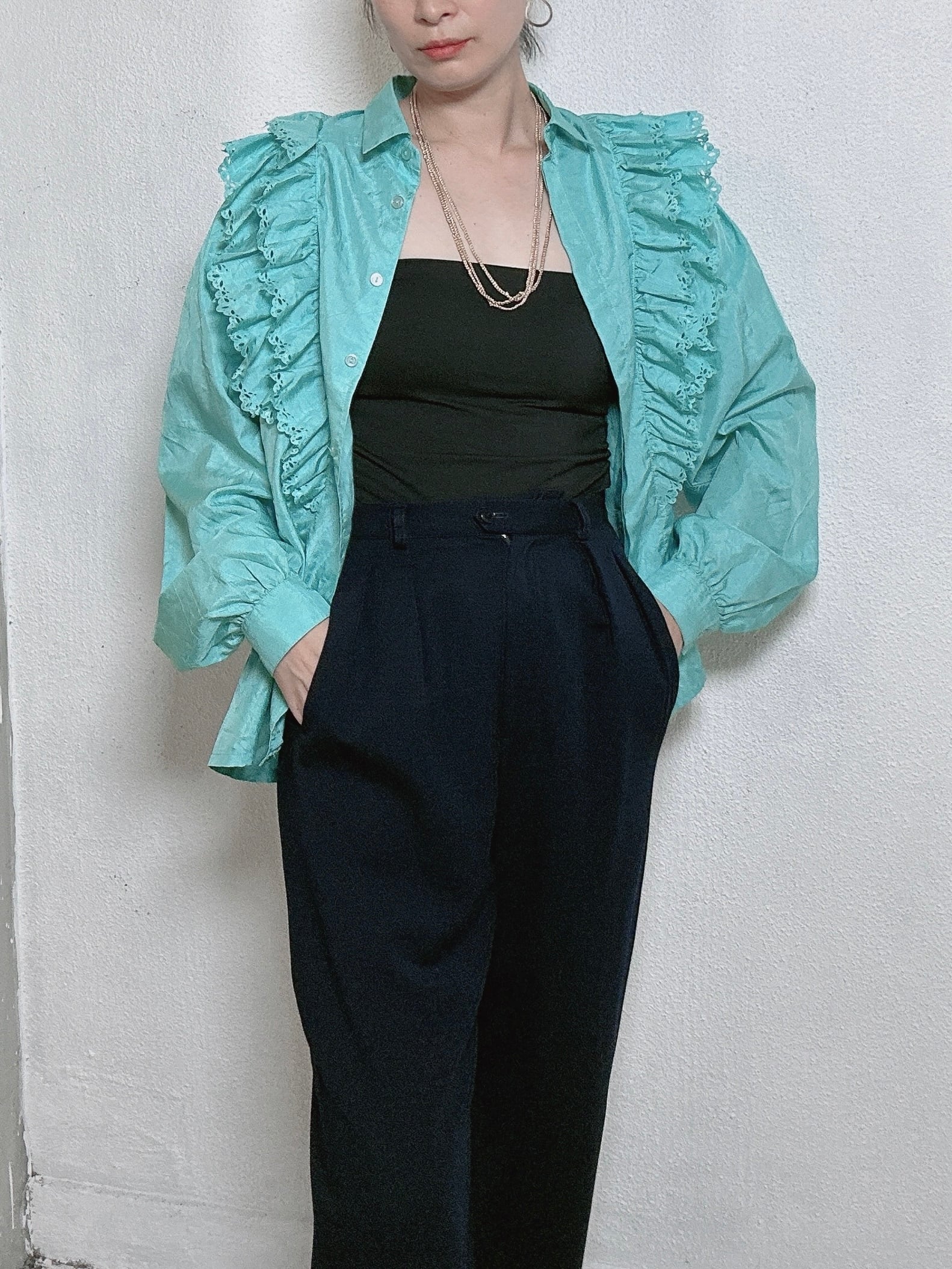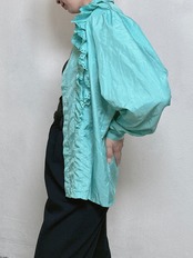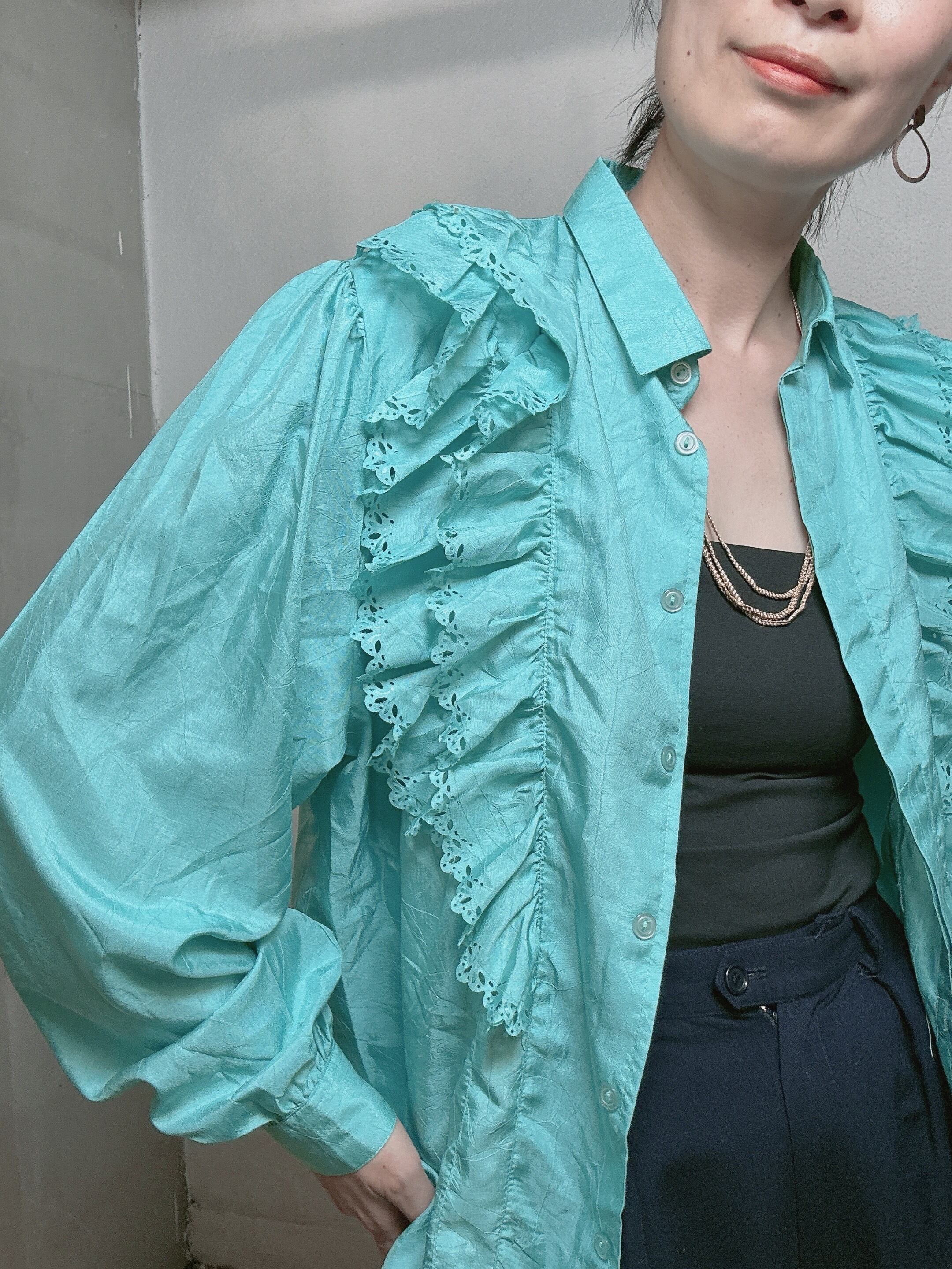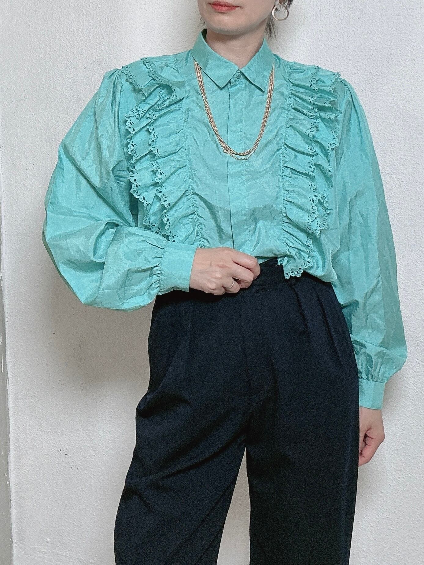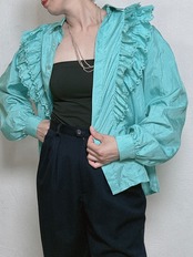 1980年代らしい華やかなディテールが魅力のヴィンテージブラウスです。爽やかなミントグリーンカラーが目を引き、フロントにたっぷりとあしらわれたフリルがエレガントな印象を与えます。ふんわりとしたバルーンスリーブがシルエットに立体感をプラスし、1枚で主役になるアイテムです。