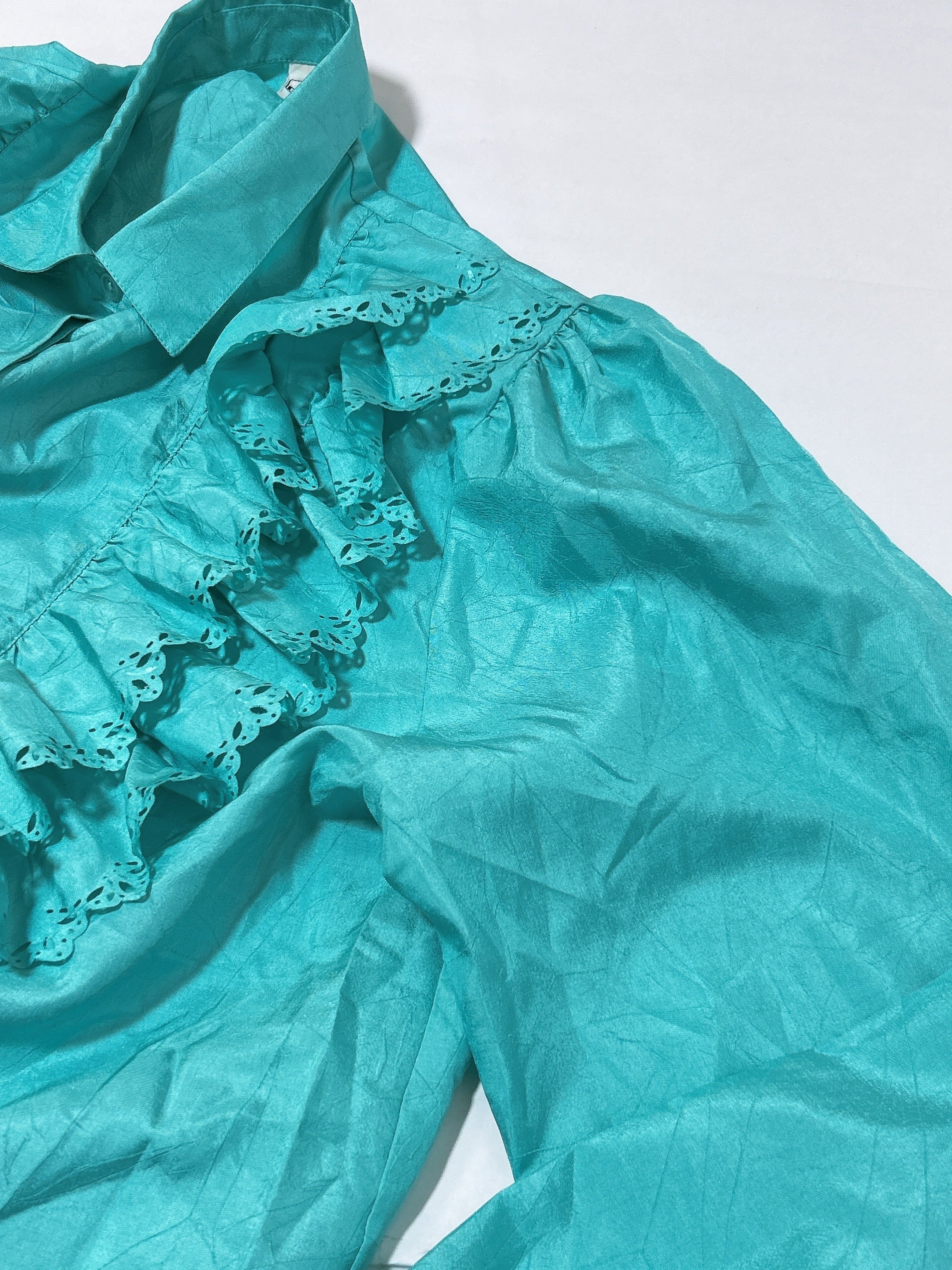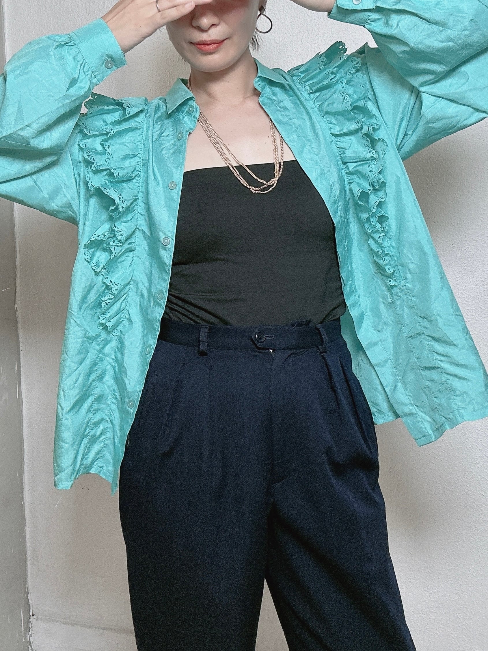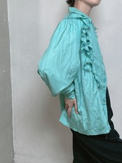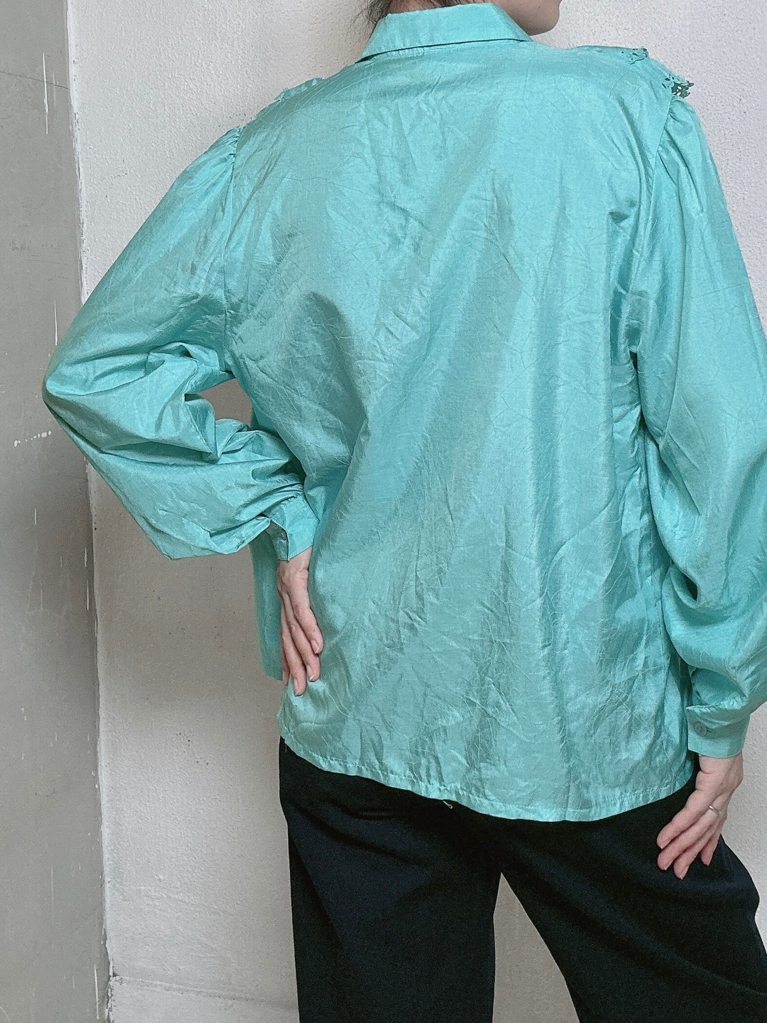 1980年代らしい華やかなディテールが魅力のヴィンテージブラウスです。爽やかなミントグリーンカラーが目を引き、フロントにたっぷりとあしらわれたフリルがエレガントな印象を与えます。ふんわりとしたバルーンスリーブがシルエットに立体感をプラスし、1枚で主役になるアイテムです。