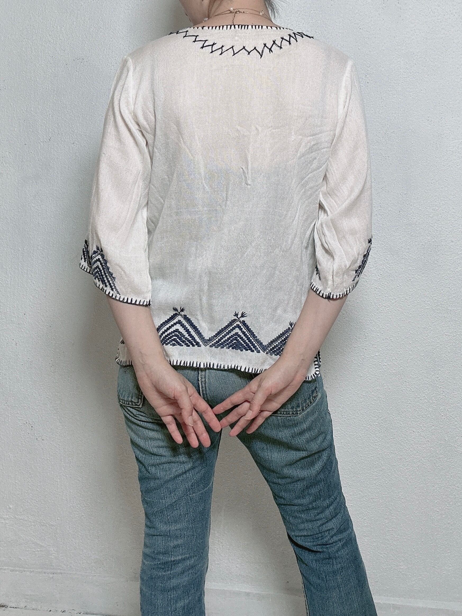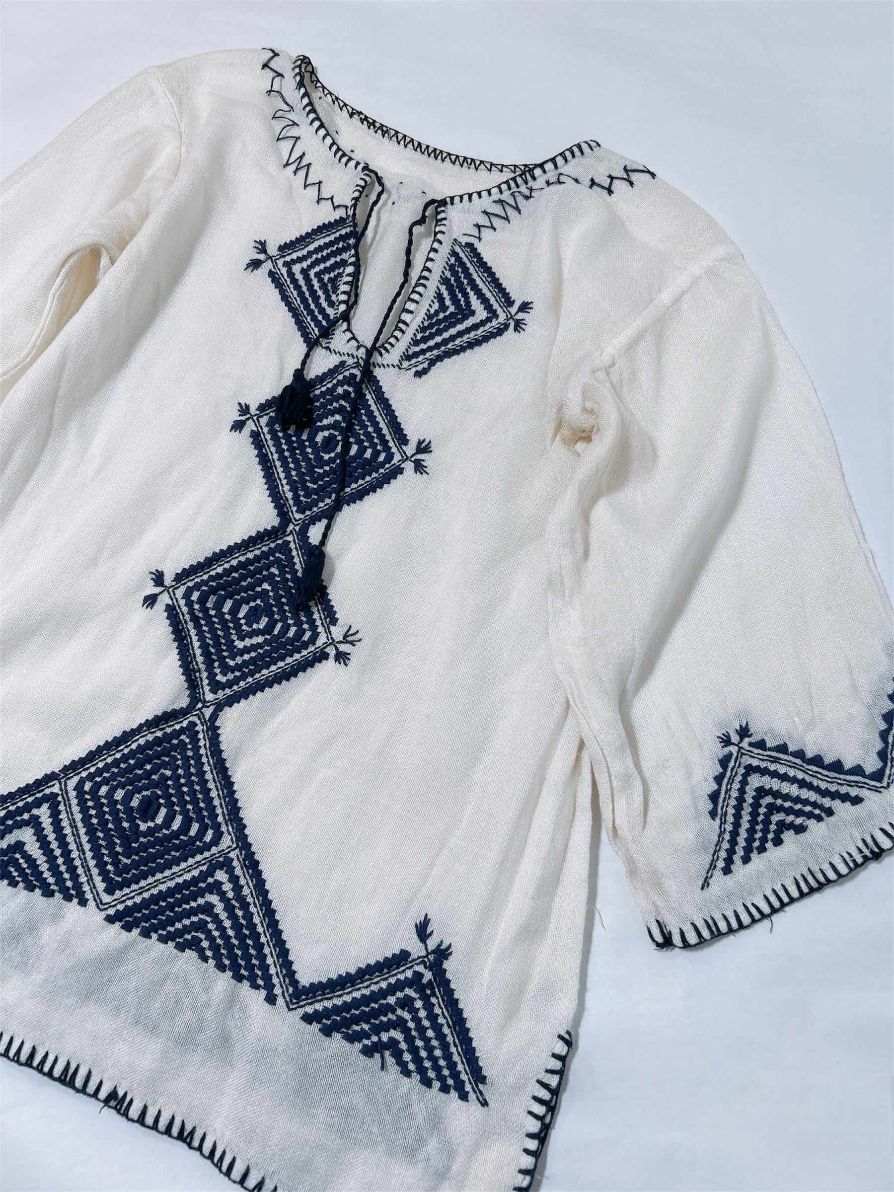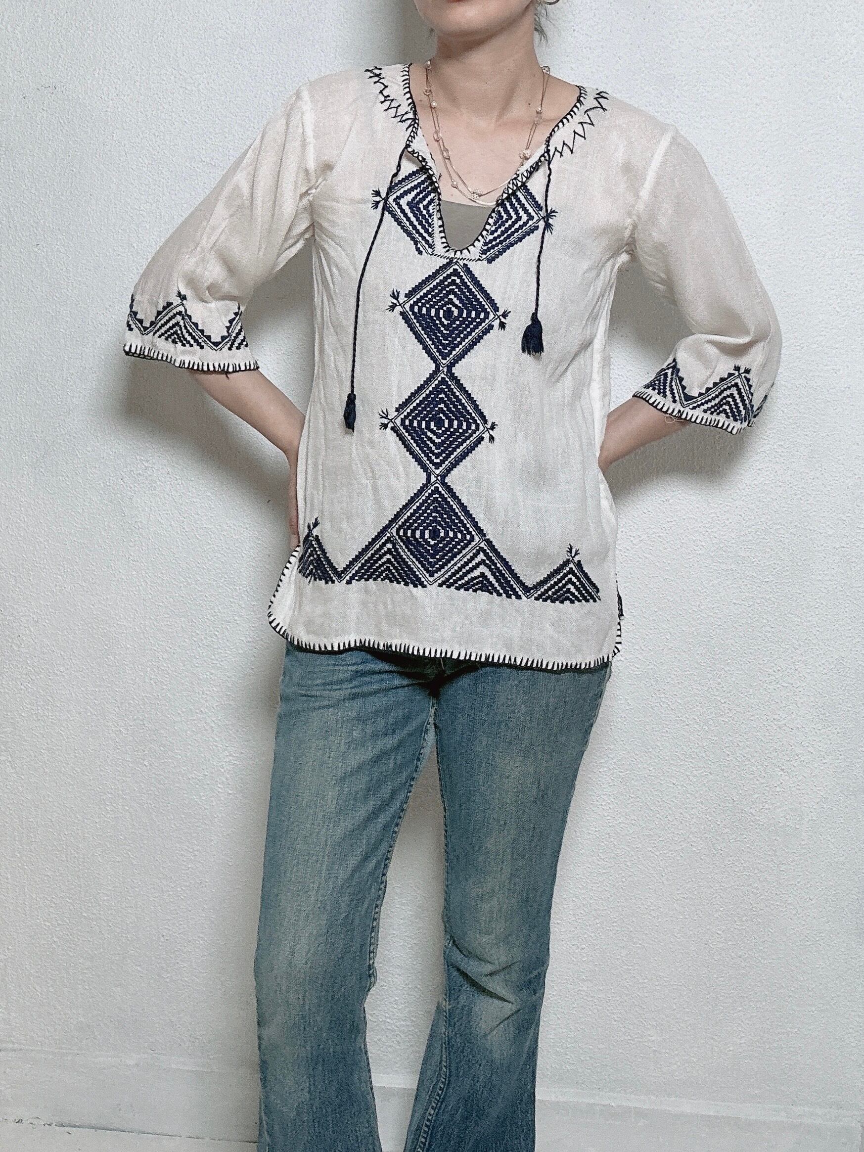 こちらはヴィンテージのボヘミアンスタイルトップスです。アイボリーのコットン素材にネイビーの刺繍が施され、シンプルでありながらも存在感のあるデザインです。胸元に付いているひもは結ぶことができ、アクセントとして着こなしに華やかさを加えます。