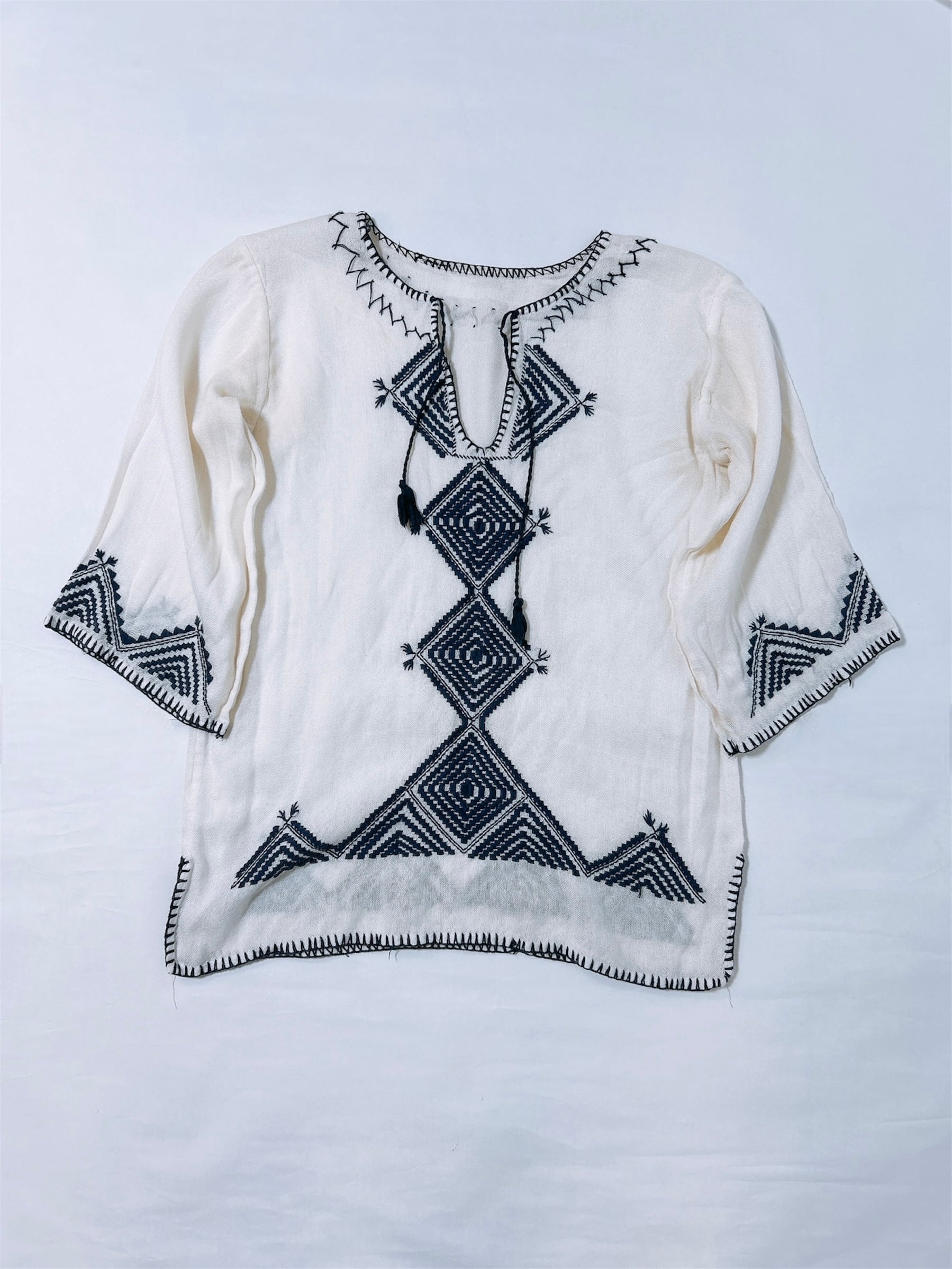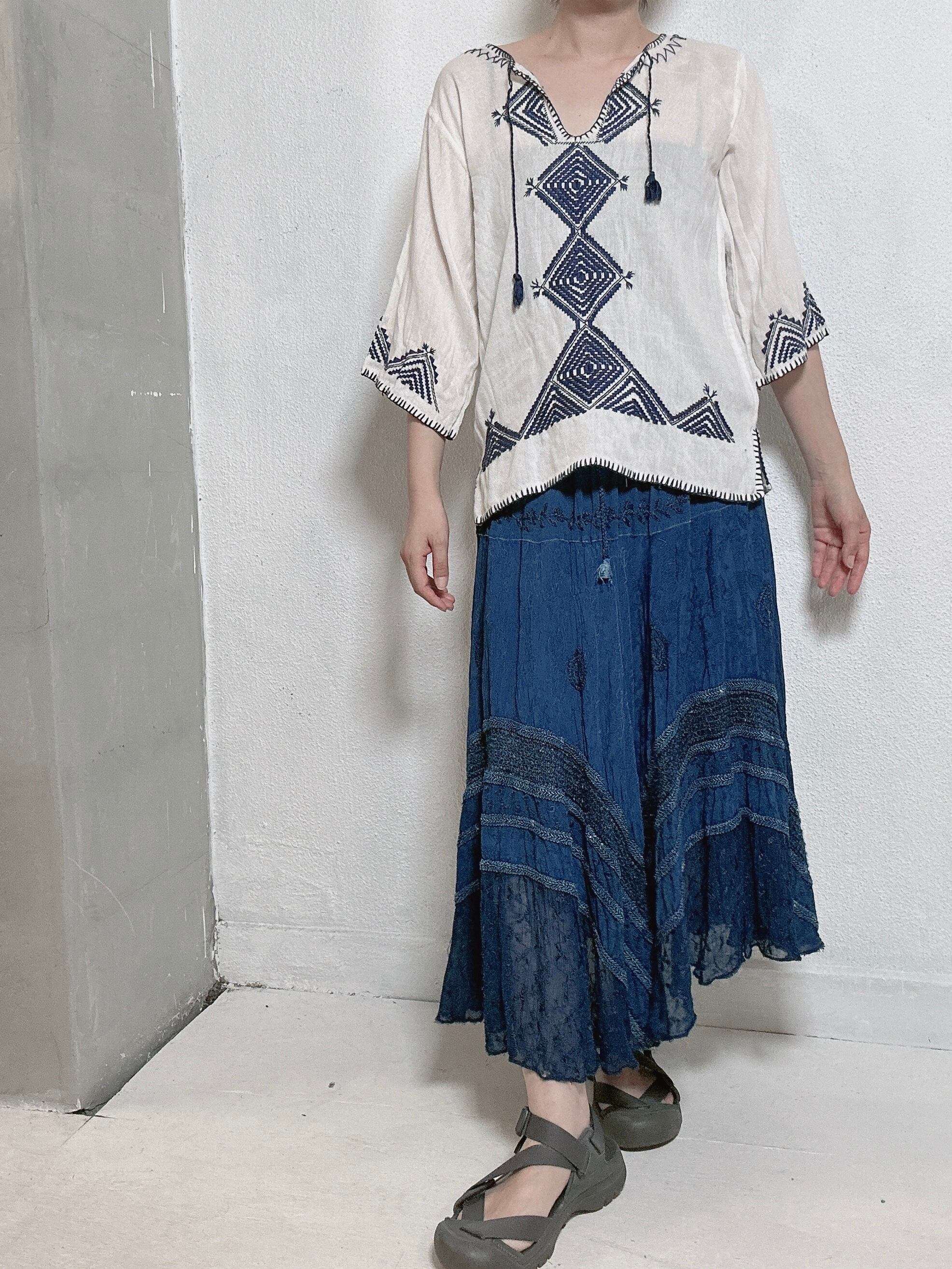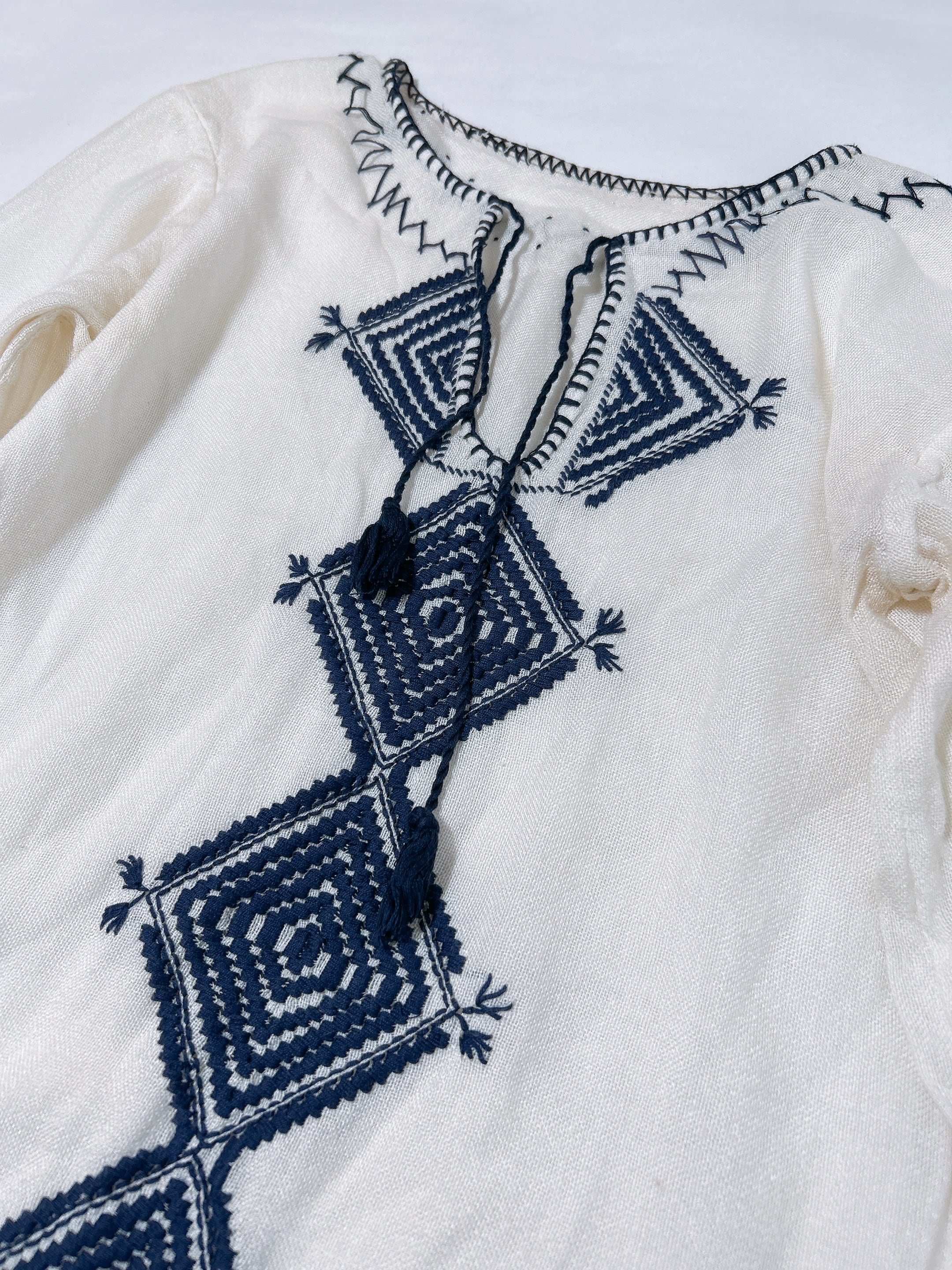 こちらはヴィンテージのボヘミアンスタイルトップスです。アイボリーのコットン素材にネイビーの刺繍が施され、シンプルでありながらも存在感のあるデザインです。胸元に付いているひもは結ぶことができ、アクセントとして着こなしに華やかさを加えます。