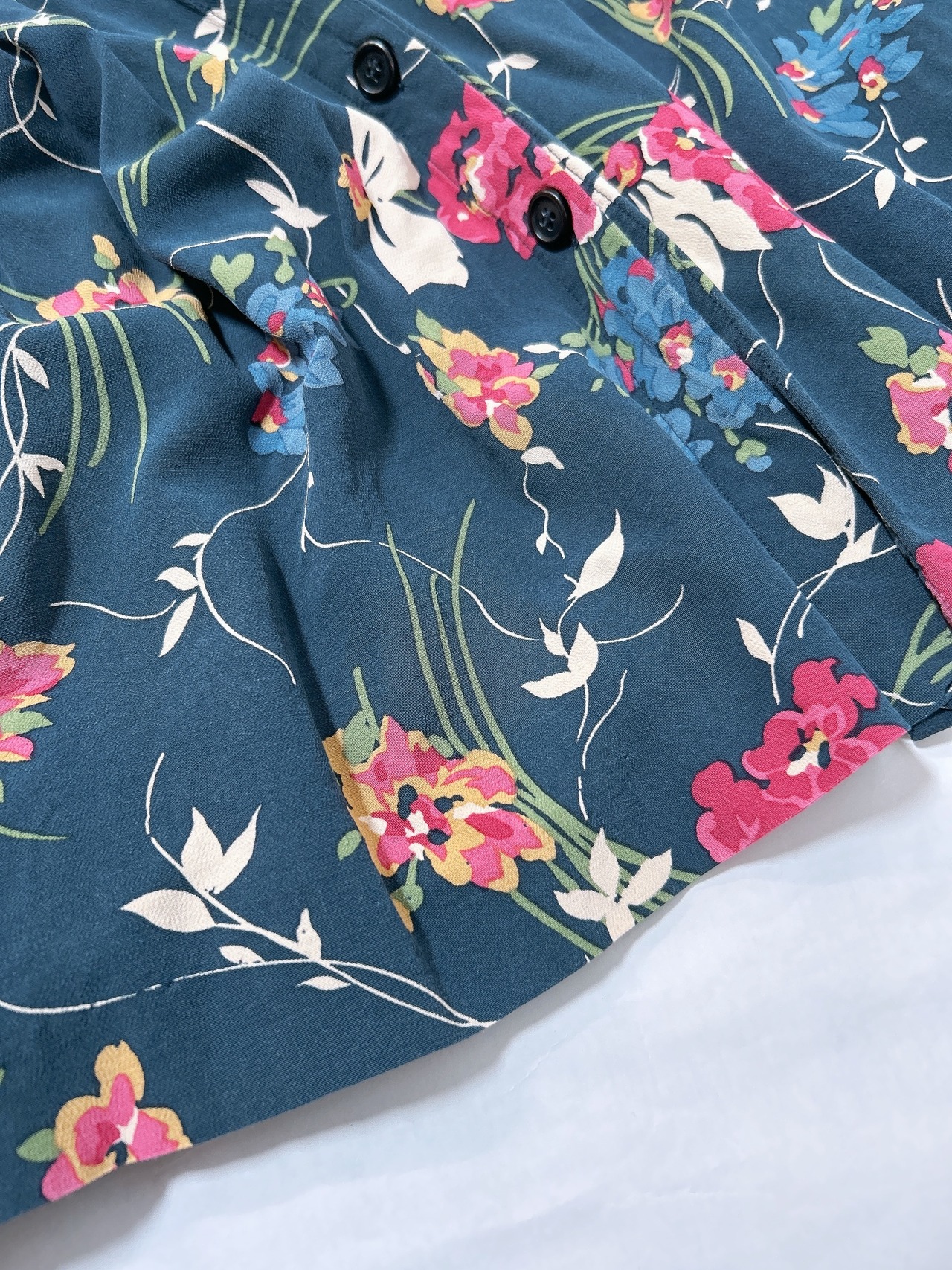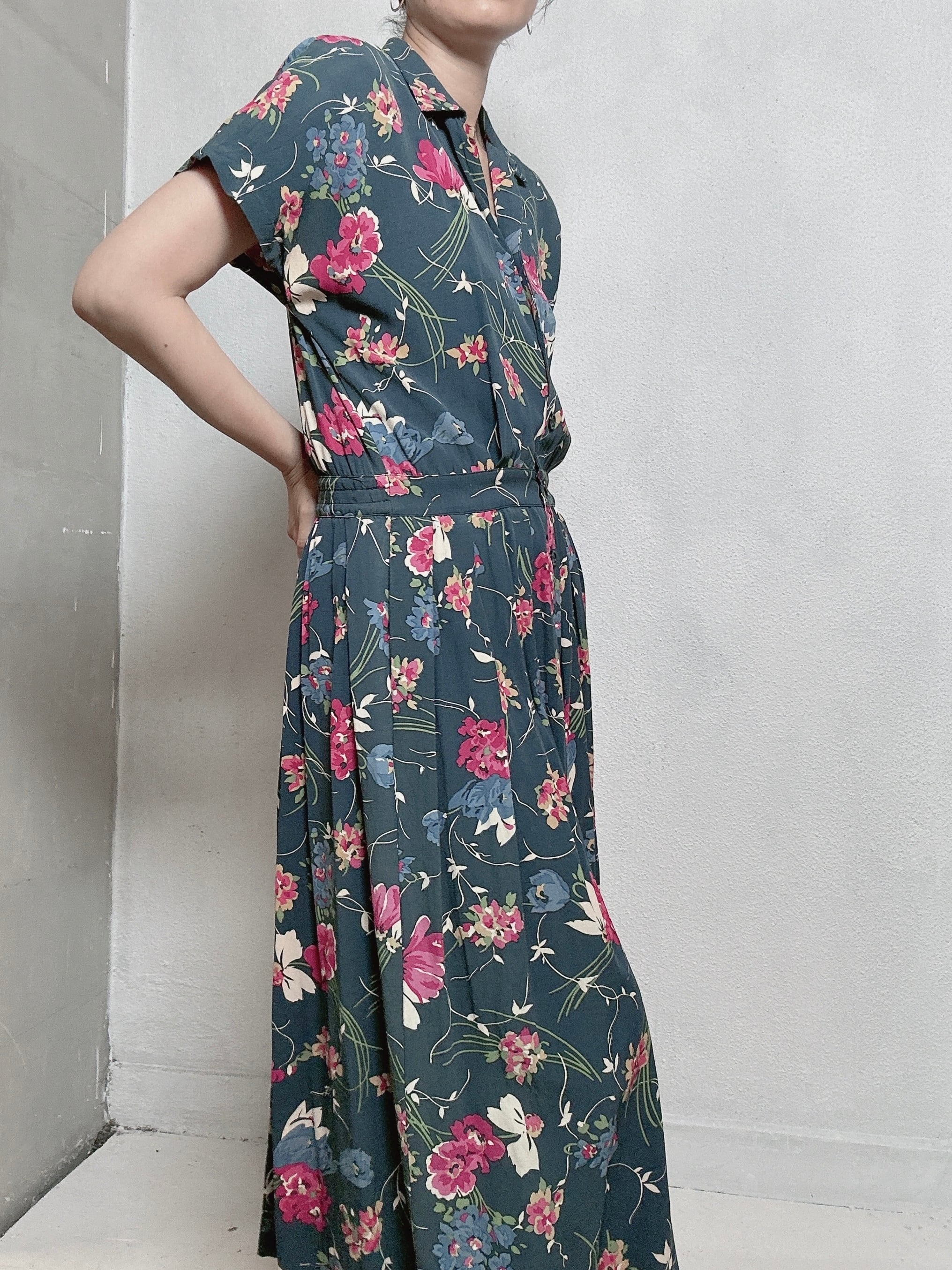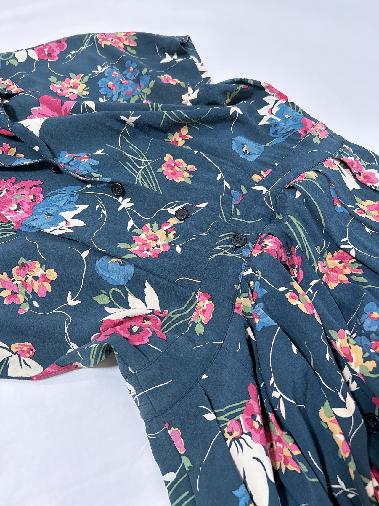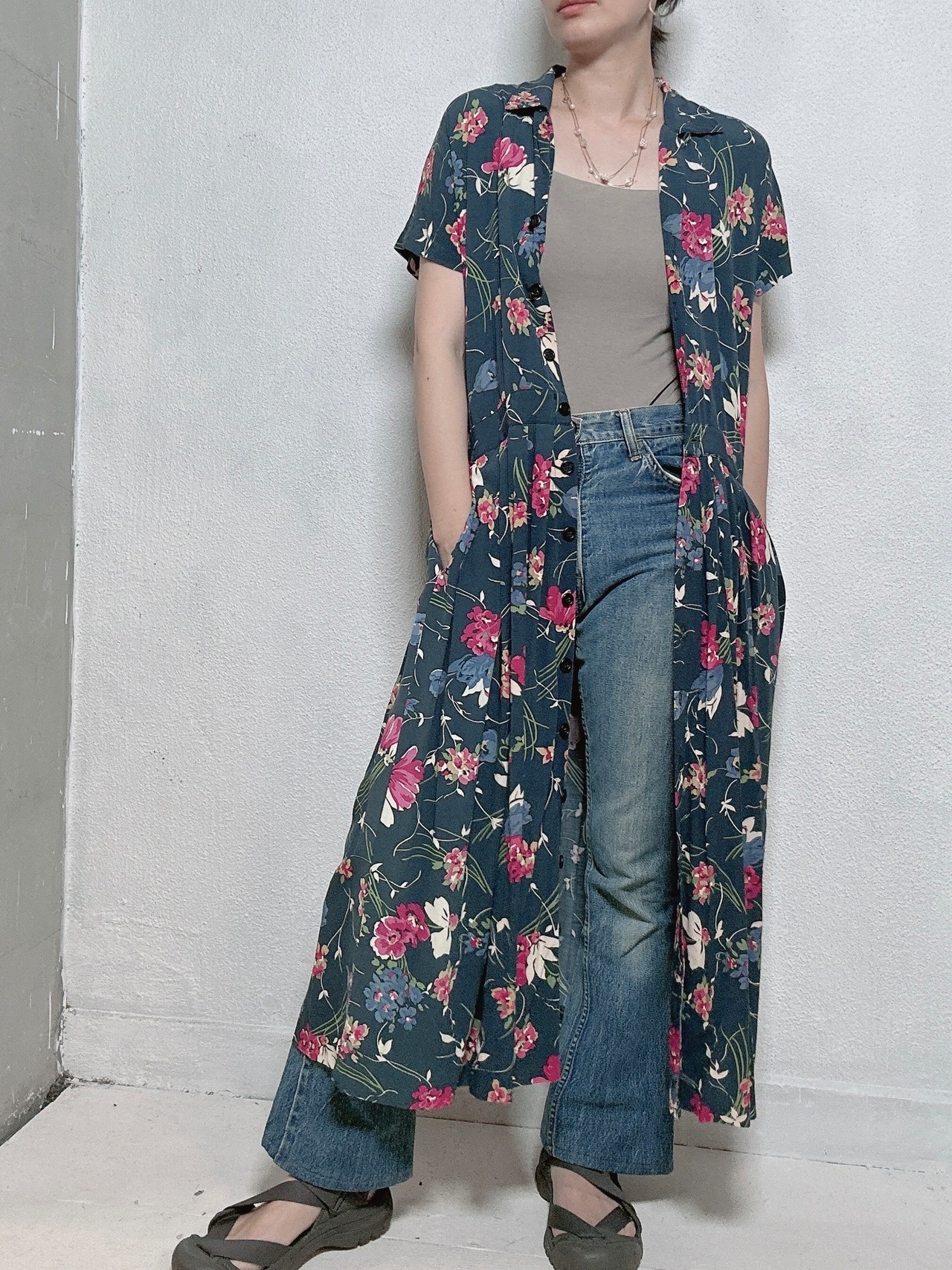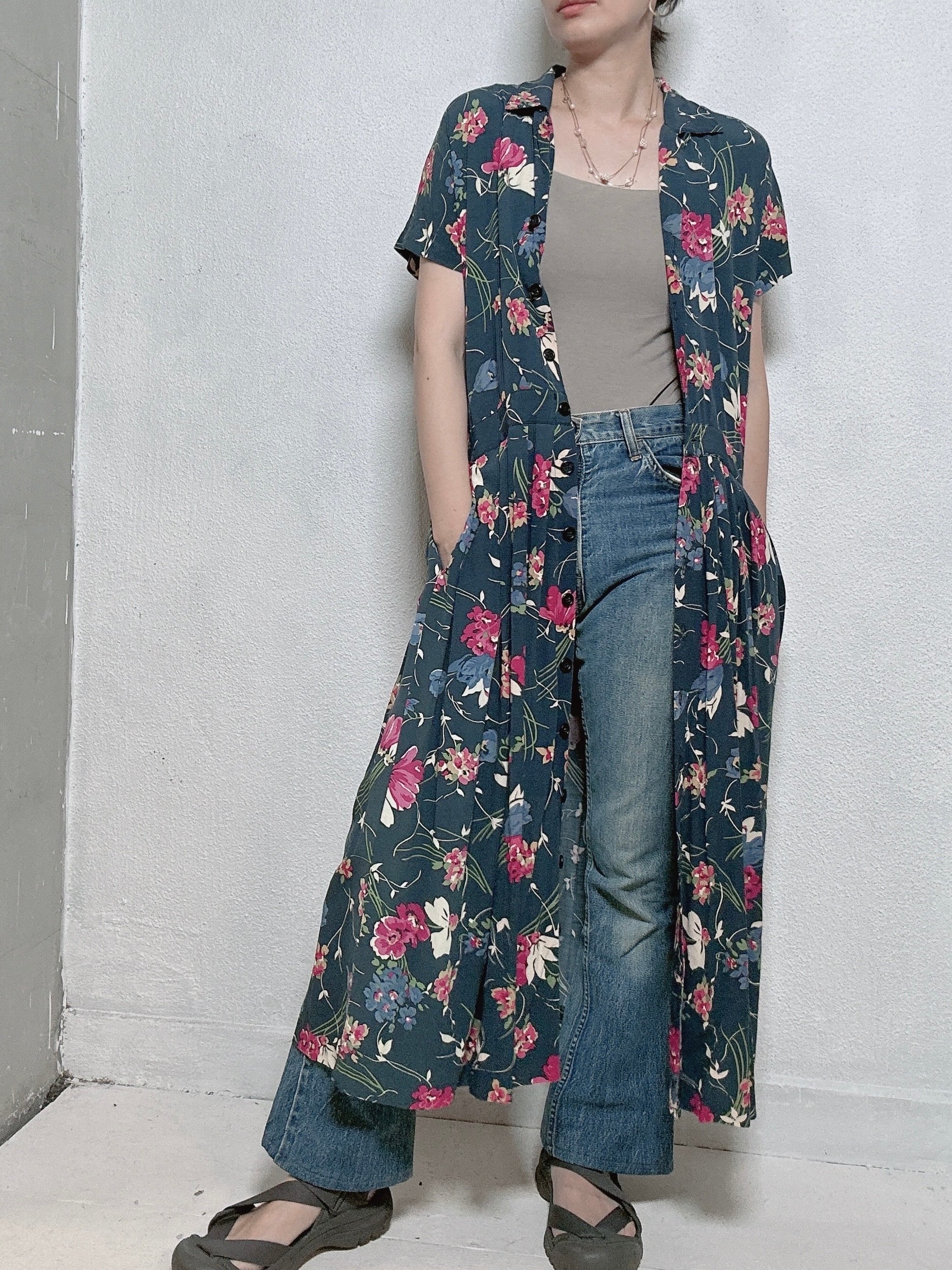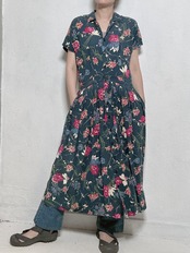 1990年代のLIZ CLAIBORNEヴィンテージワンピースです。深いネイビーをベースにした華やかな花柄が特徴で、エレガントさと落ち着きが絶妙に調和したデザインです。フロントボタンを開けて羽織りとしても着用できるので、コーディネートの幅が広がります。両サイドには便利なポケットもついており、実用性も抜群。