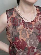 バーガンディやモカ、マスタードなど、落ち着きのあるくすみカラーの立体フラワーレースが贅沢にあしらわれ、透け感のある軽やかな印象に仕上がっています。