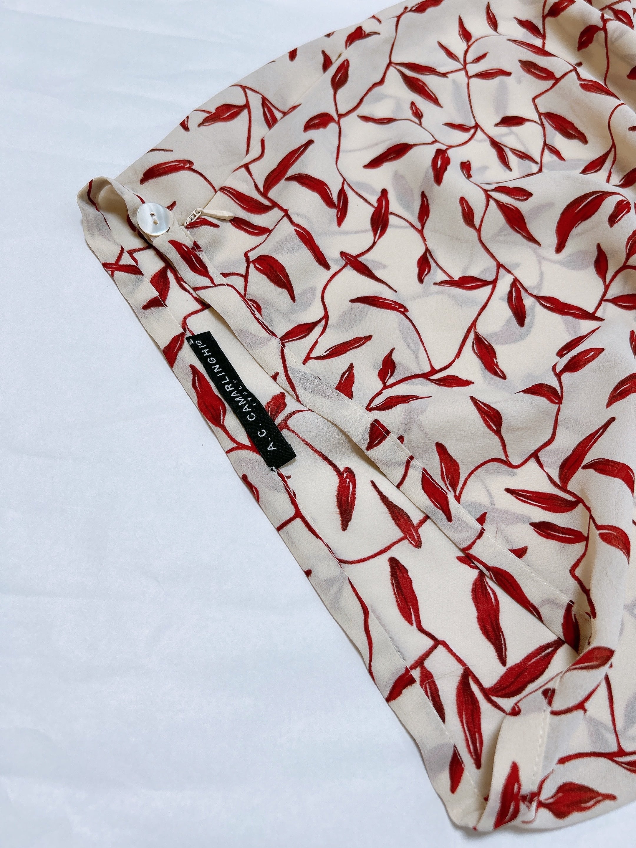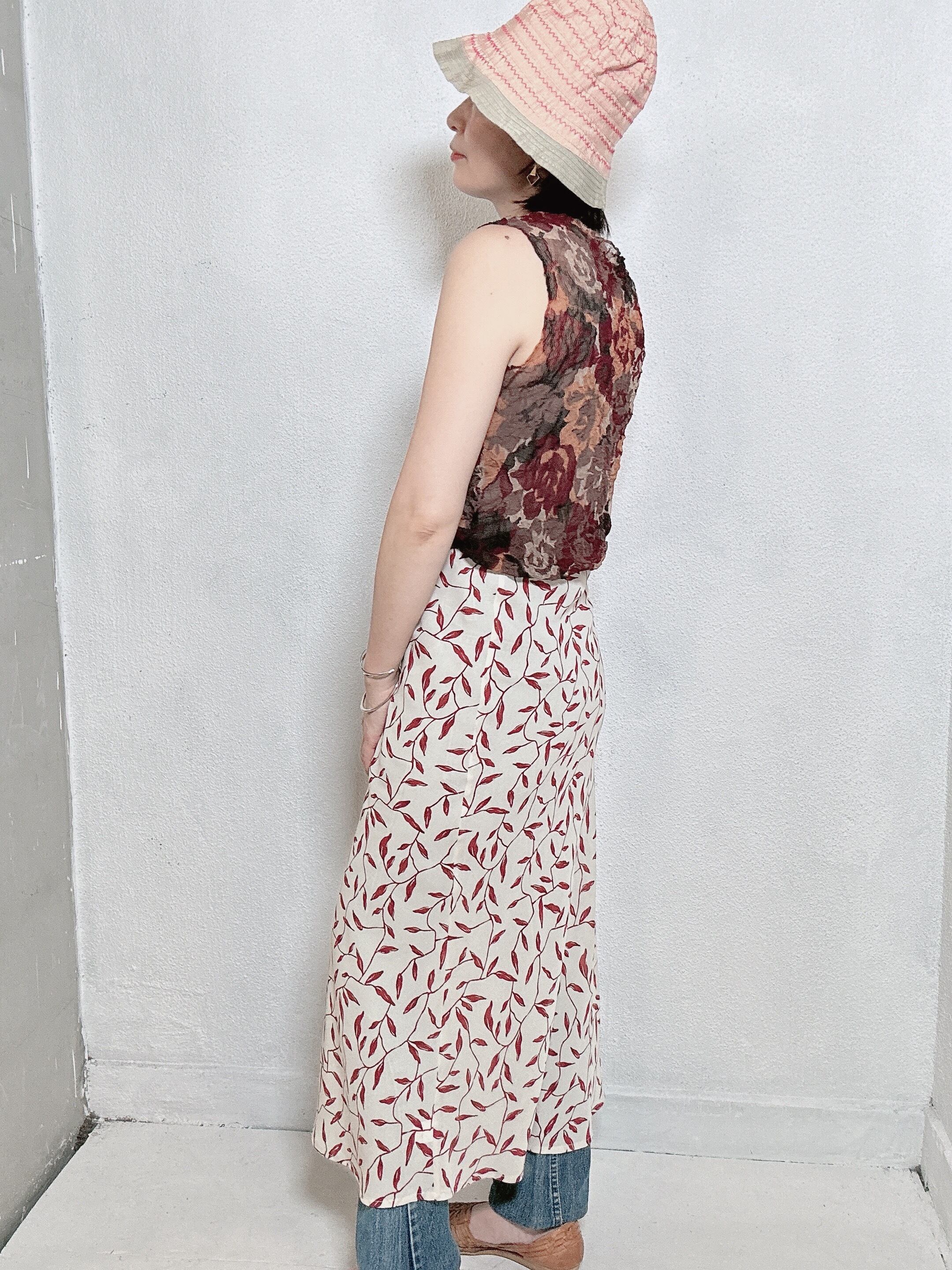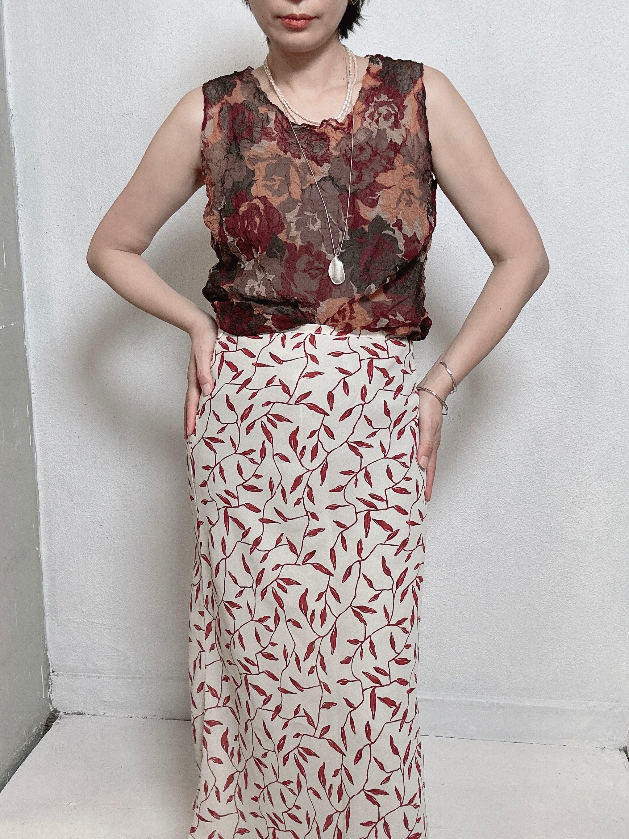 アイボリーベースに散りばめられた、赤のリーフプリントが印象的なイタリア製の古着スカート。