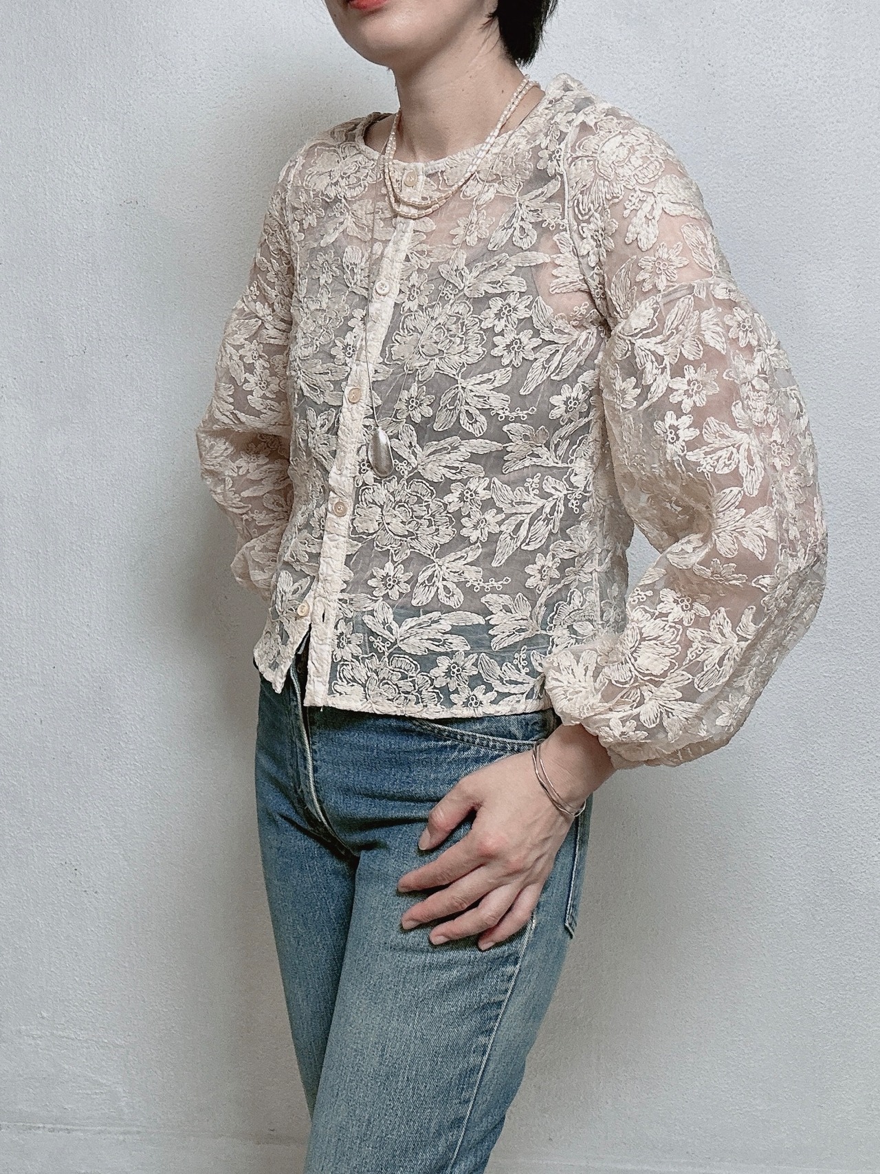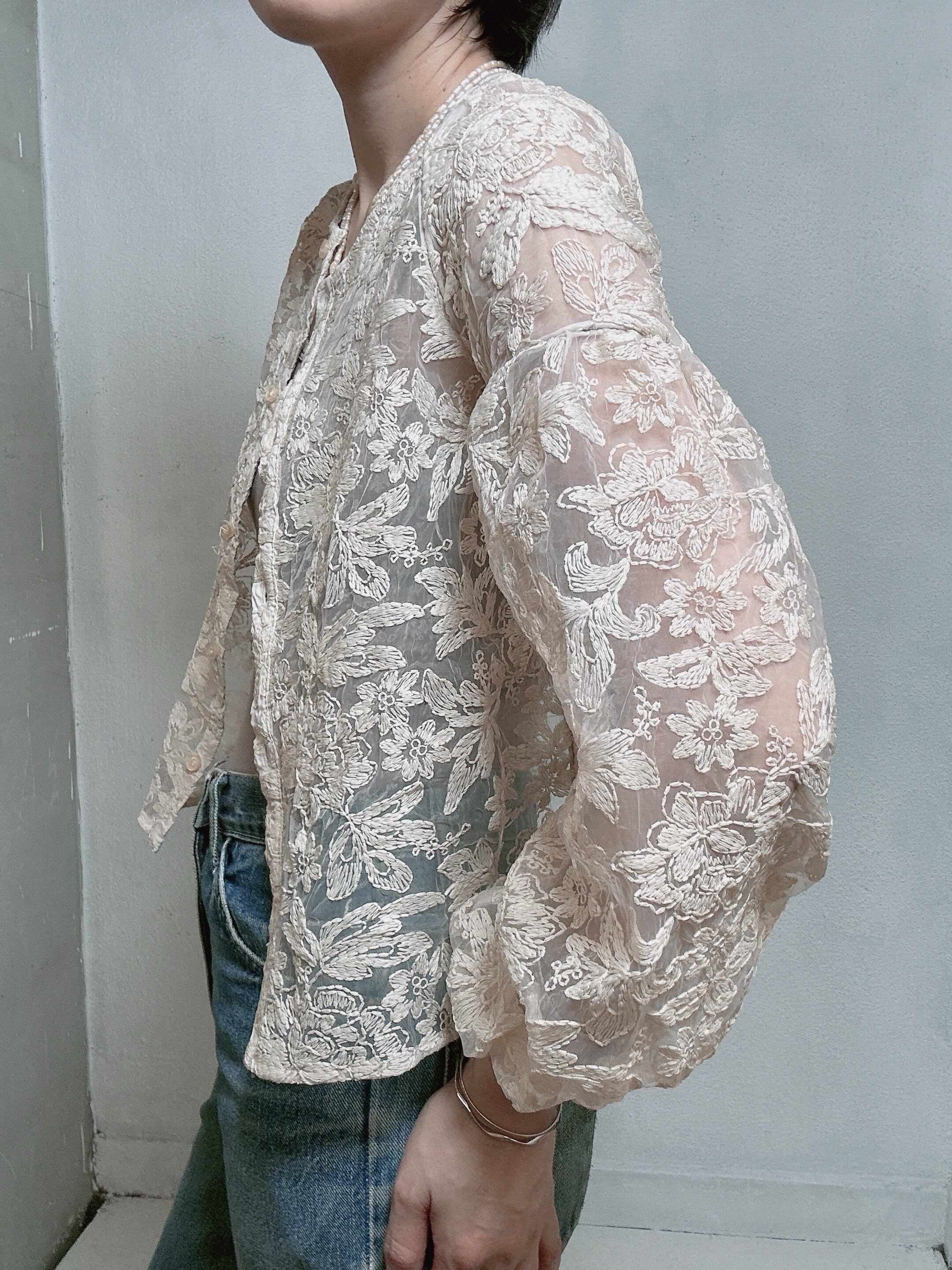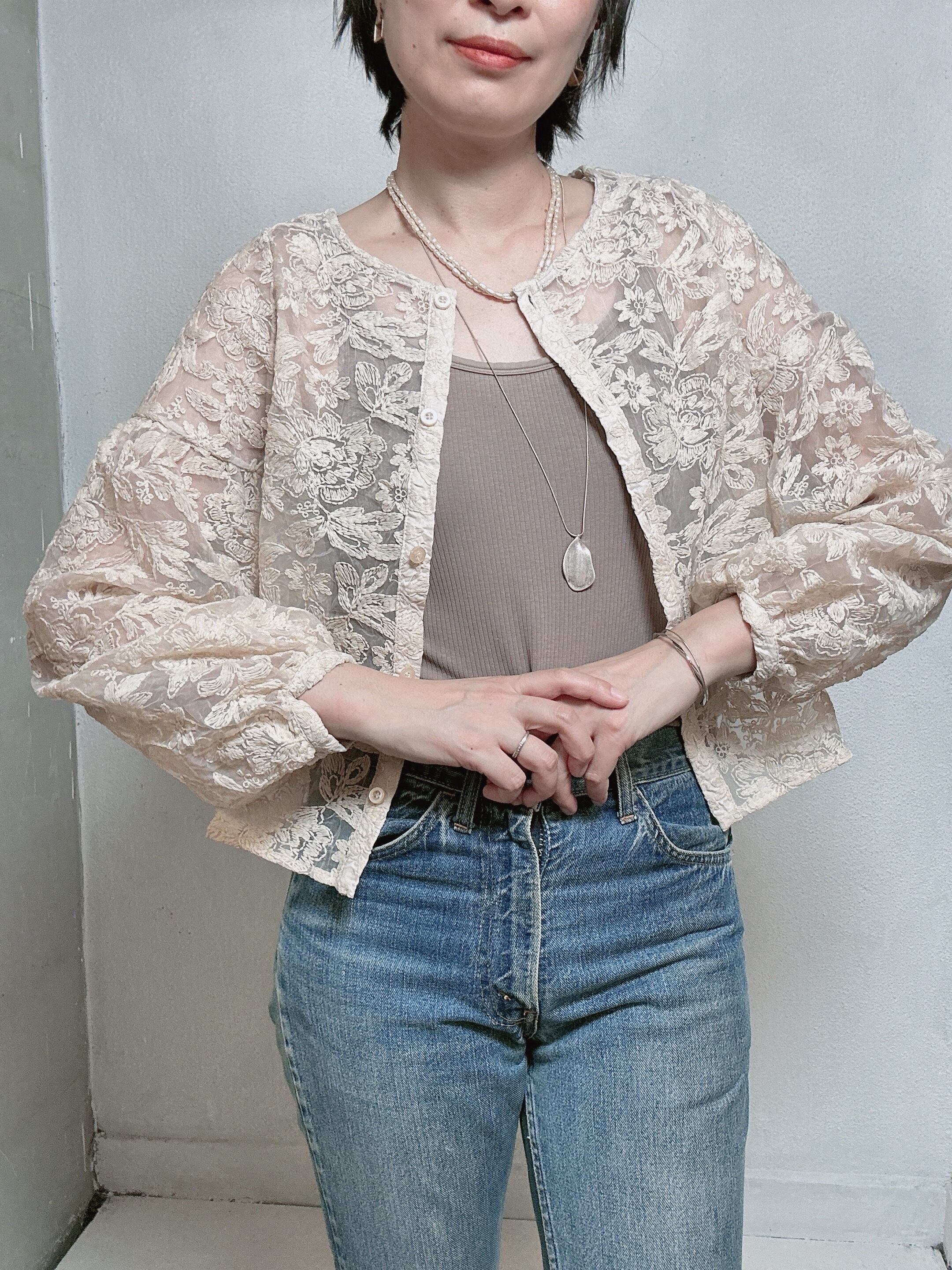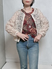 繊細な花柄レースで仕立てられた、古着の総レースジャケット。