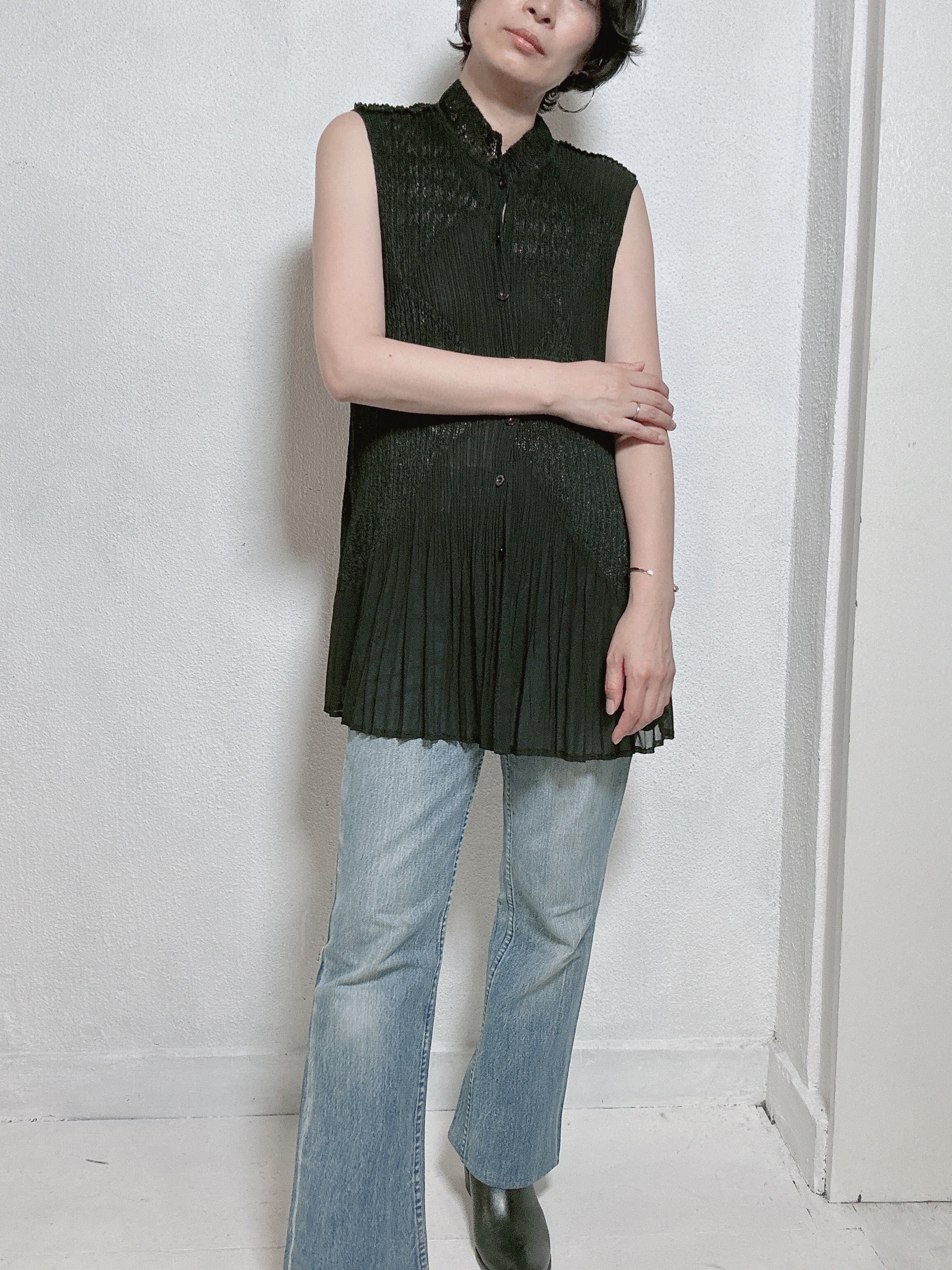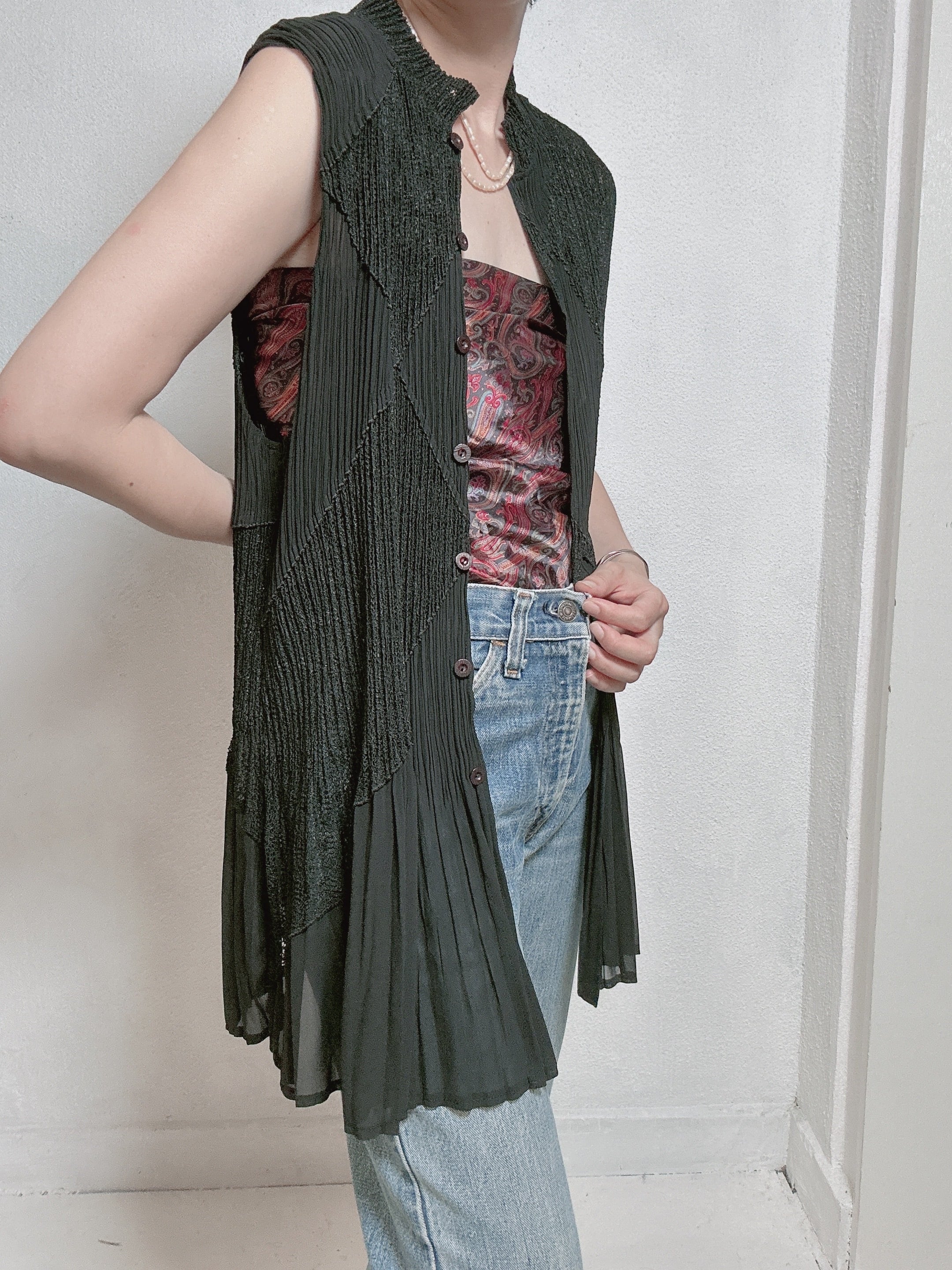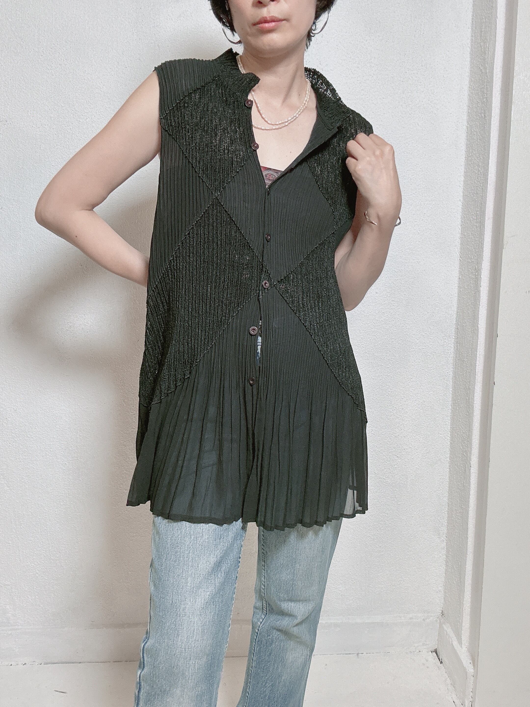 透け感のある軽やかな素材に、プリーツと切り替えのデザインが個性的なロング丈ベストブラウス。ノースリーブでさらっと羽織ることができ、ボタンを閉じればワンピース風にも着こなせます。キャミソールやタンクトップとレイヤードすれば、抜け感のあるスタイルに。デニムやスラックスとの相性も良く、モード感をプラスできる一着です。