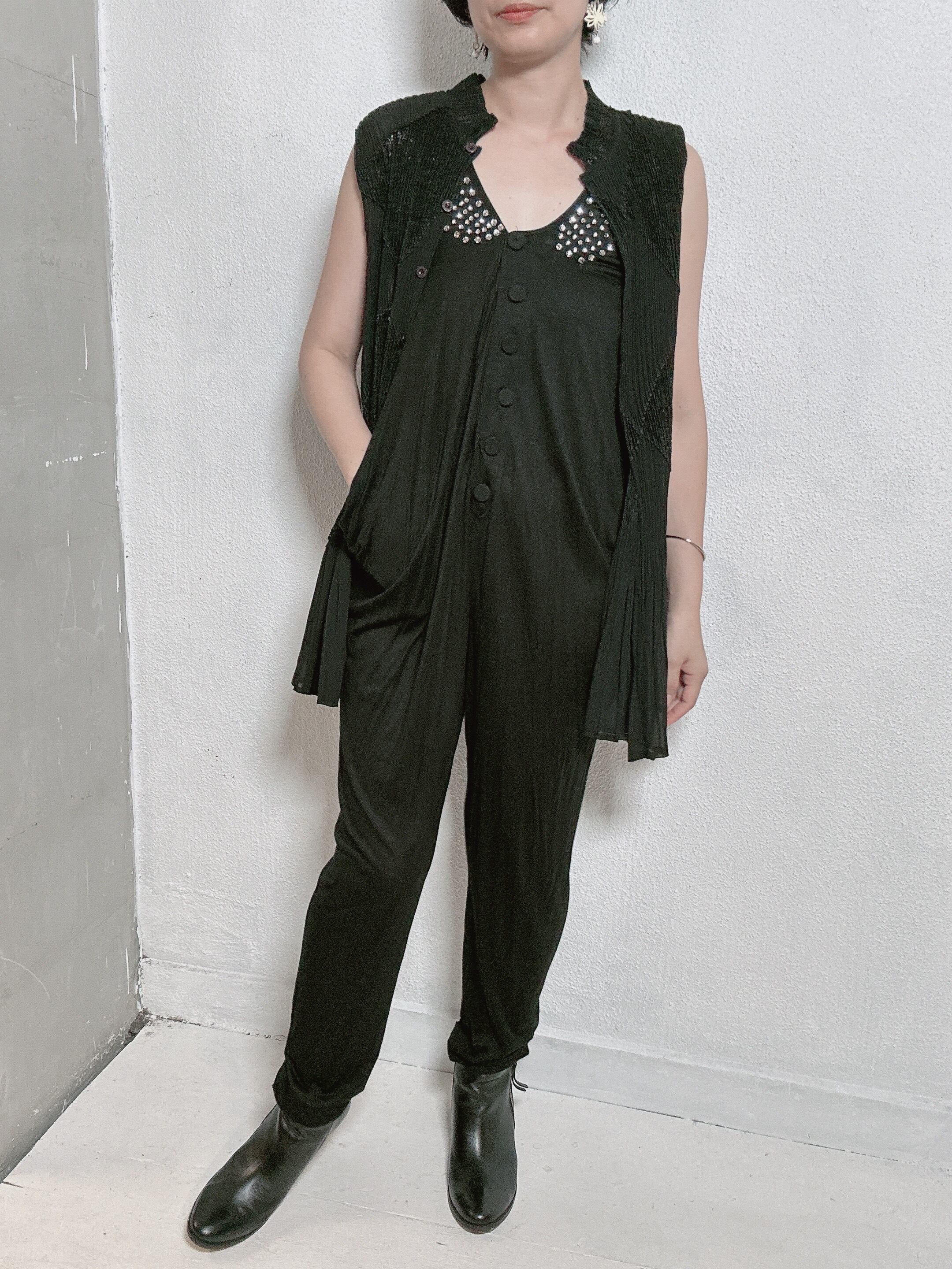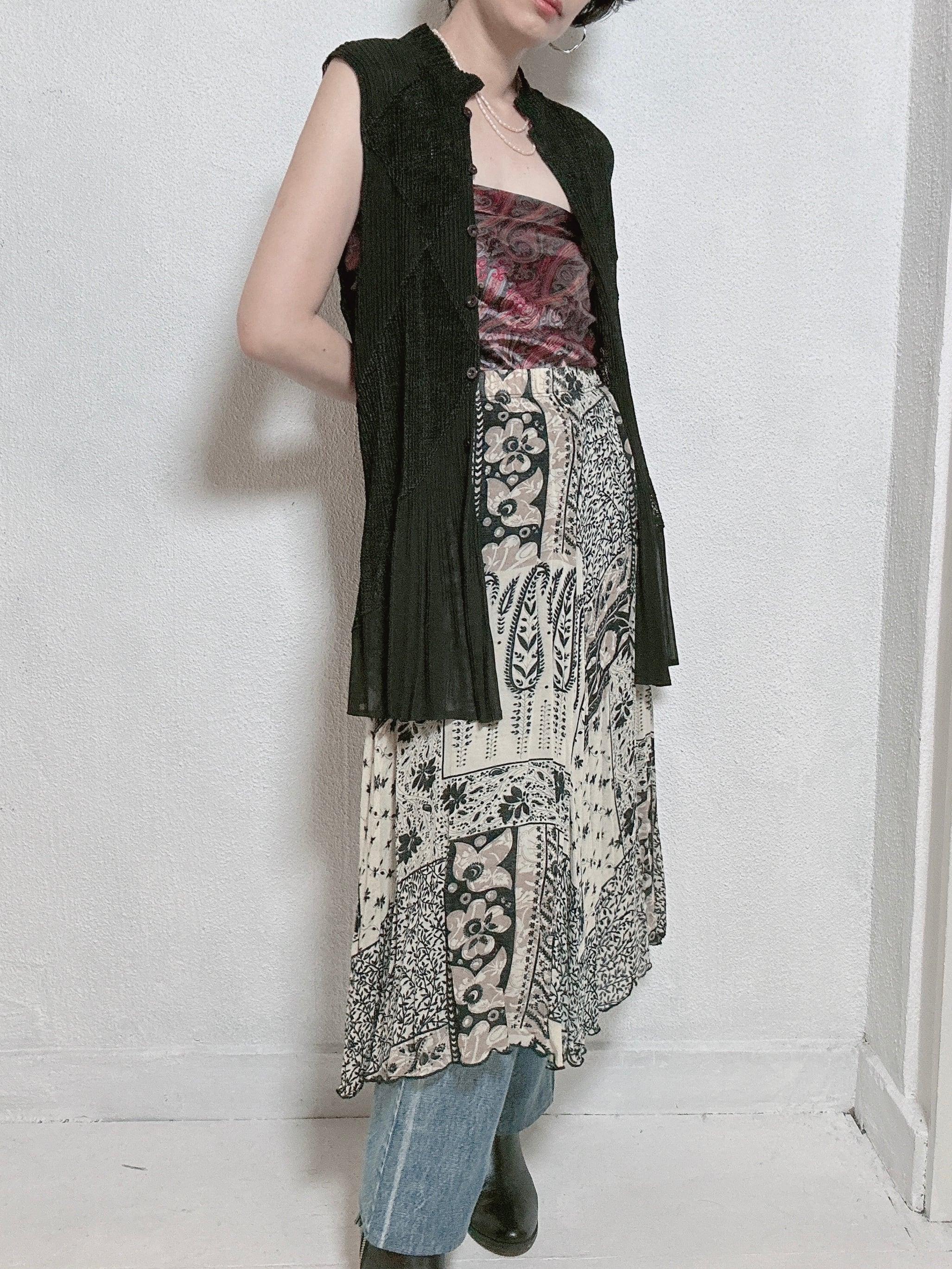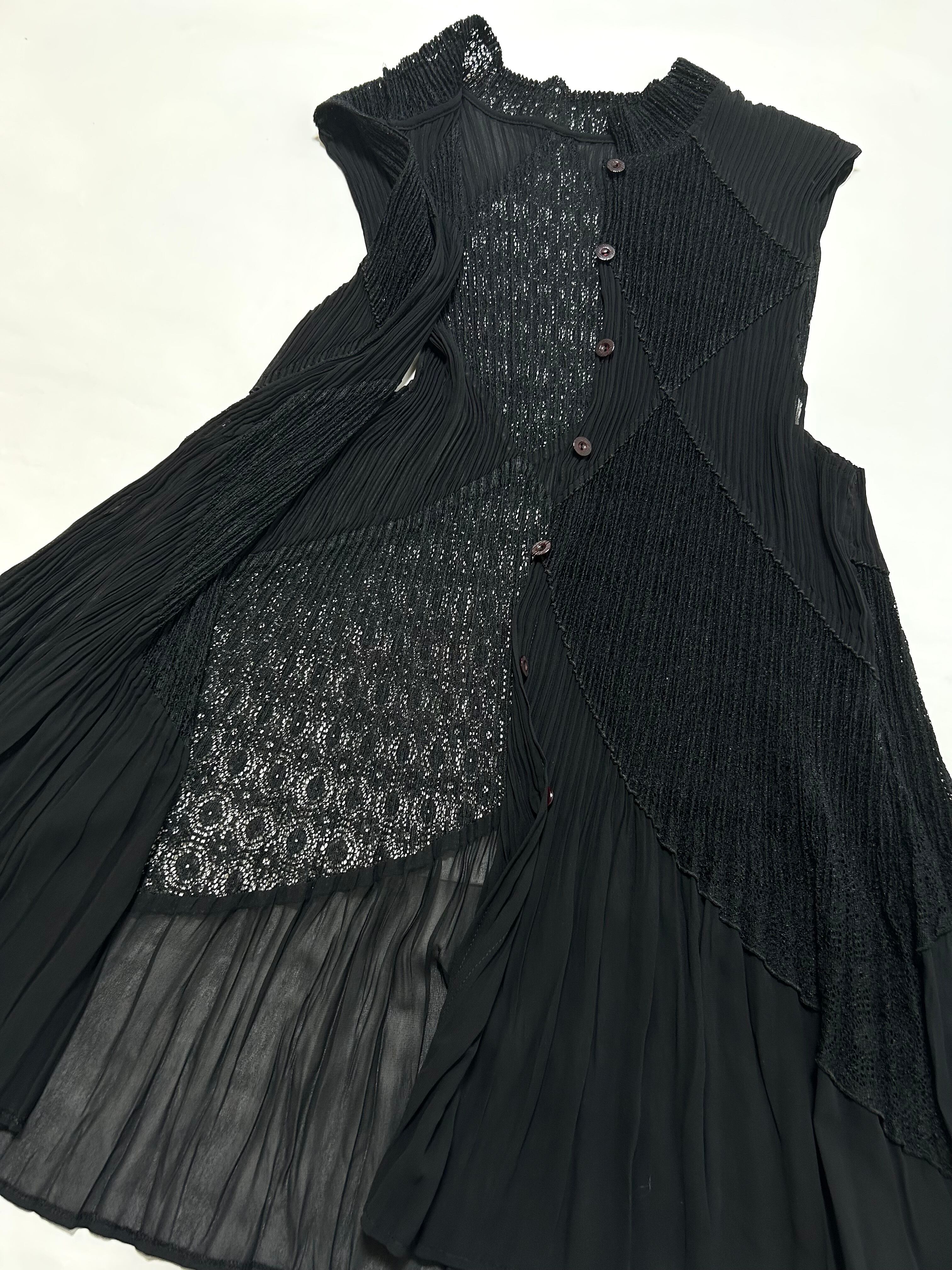 透け感のある軽やかな素材に、プリーツと切り替えのデザインが個性的なロング丈ベストブラウス。ノースリーブでさらっと羽織ることができ、ボタンを閉じればワンピース風にも着こなせます。キャミソールやタンクトップとレイヤードすれば、抜け感のあるスタイルに。デニムやスラックスとの相性も良く、モード感をプラスできる一着です。