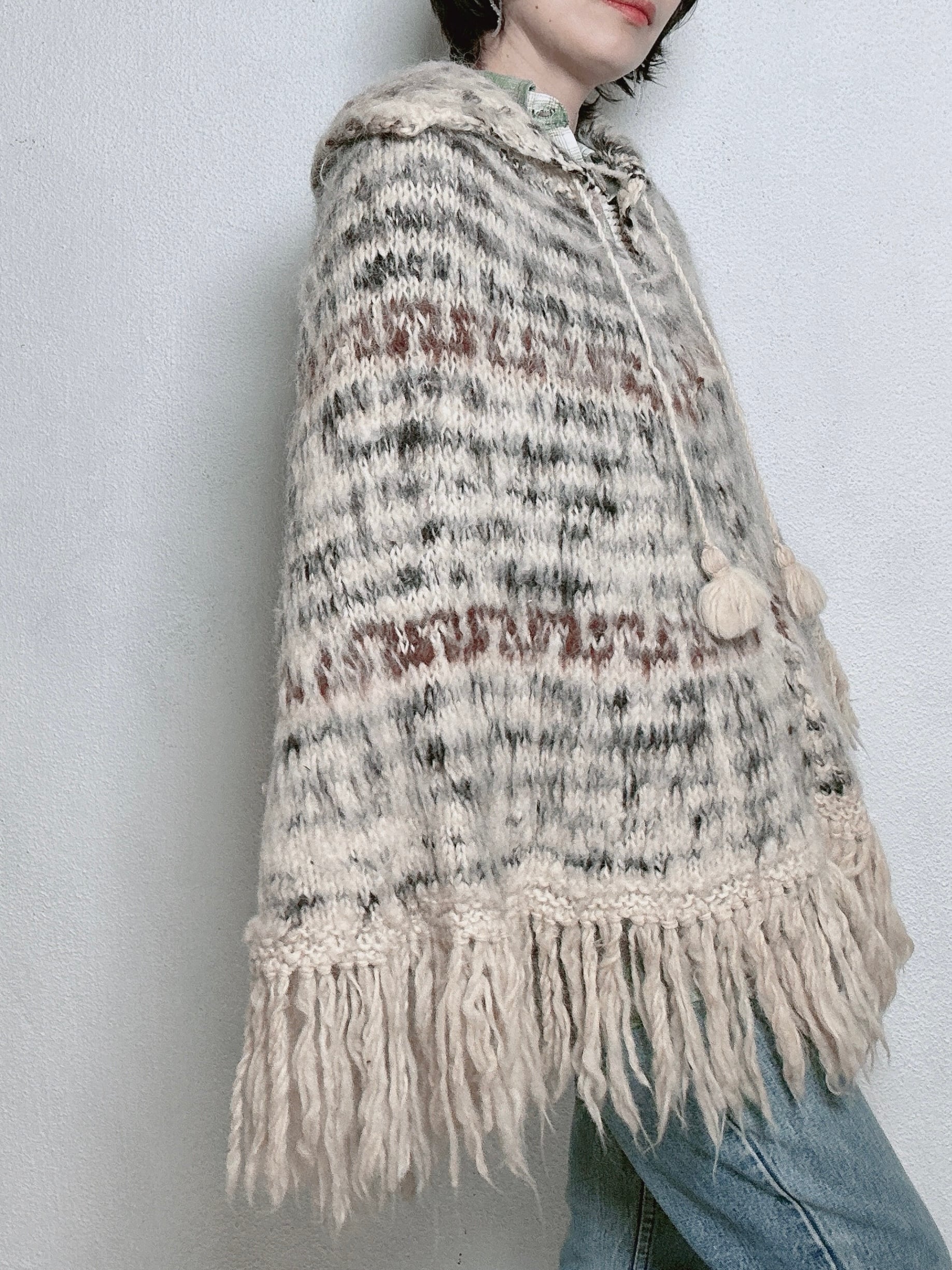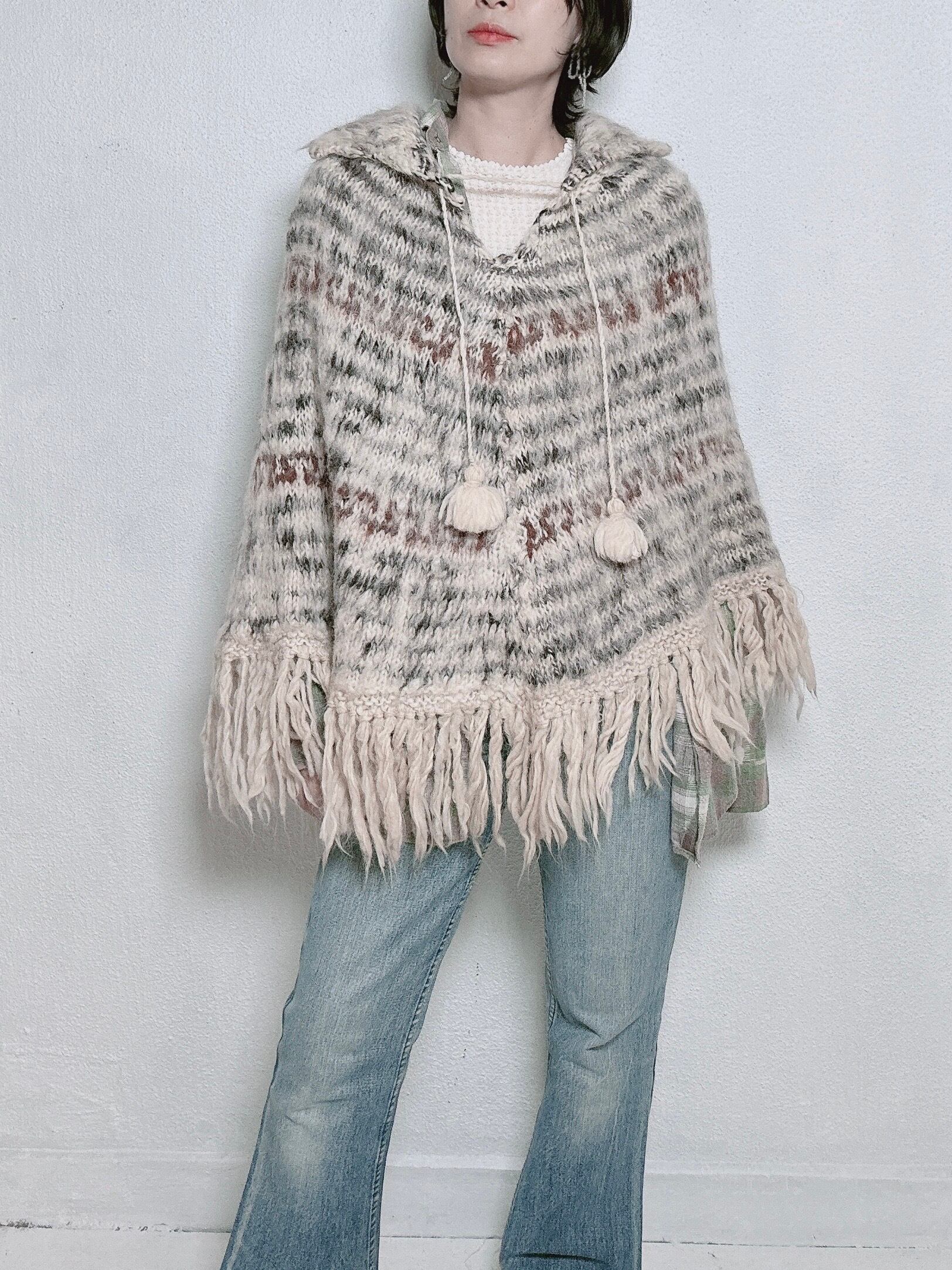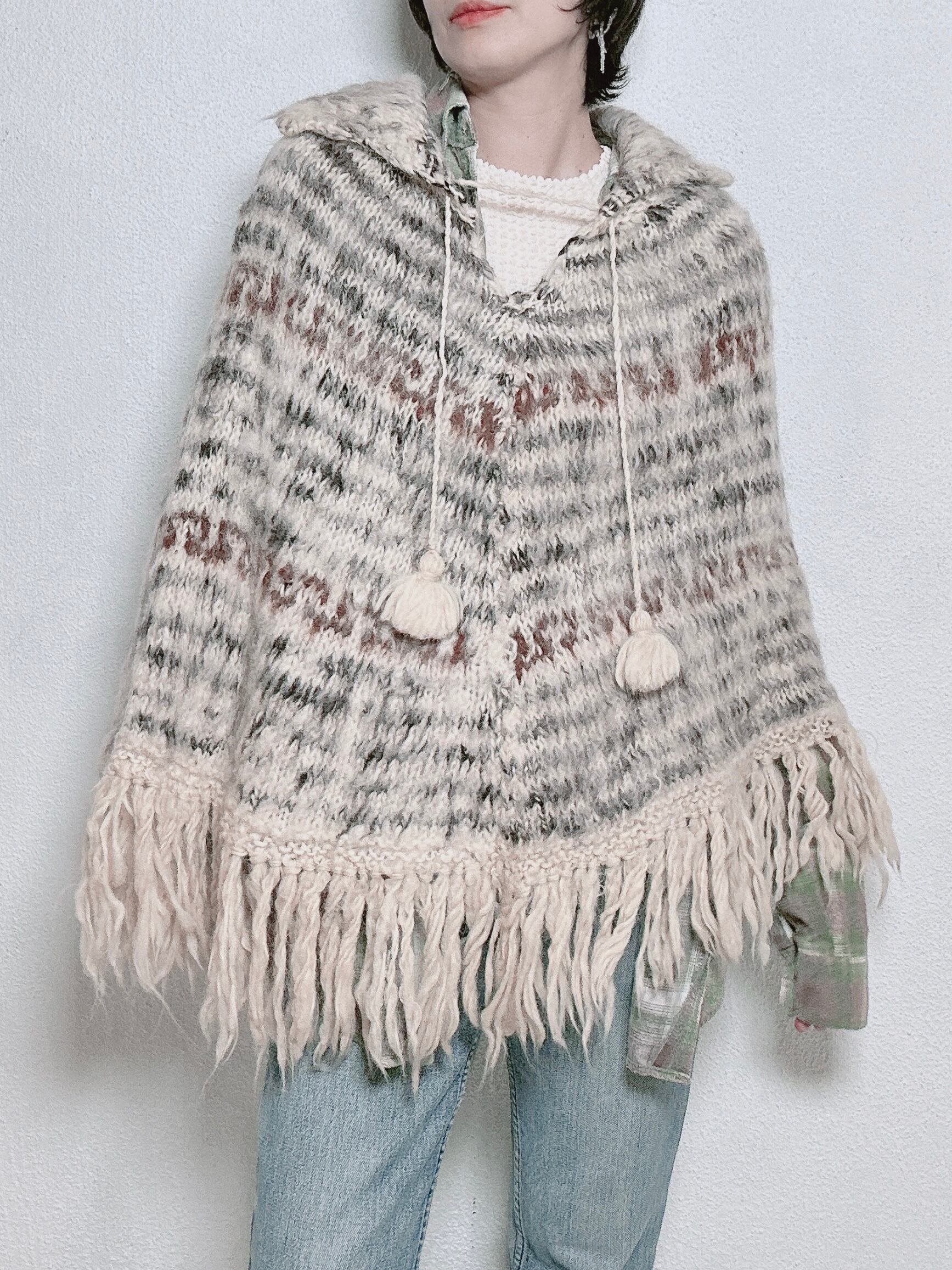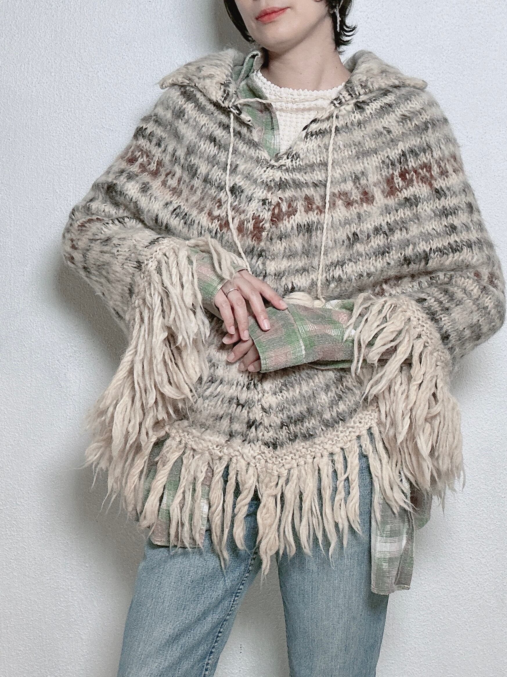 ボヘミアンスタイルにぴったりな、フリンジ付きのニットポンチョ。
