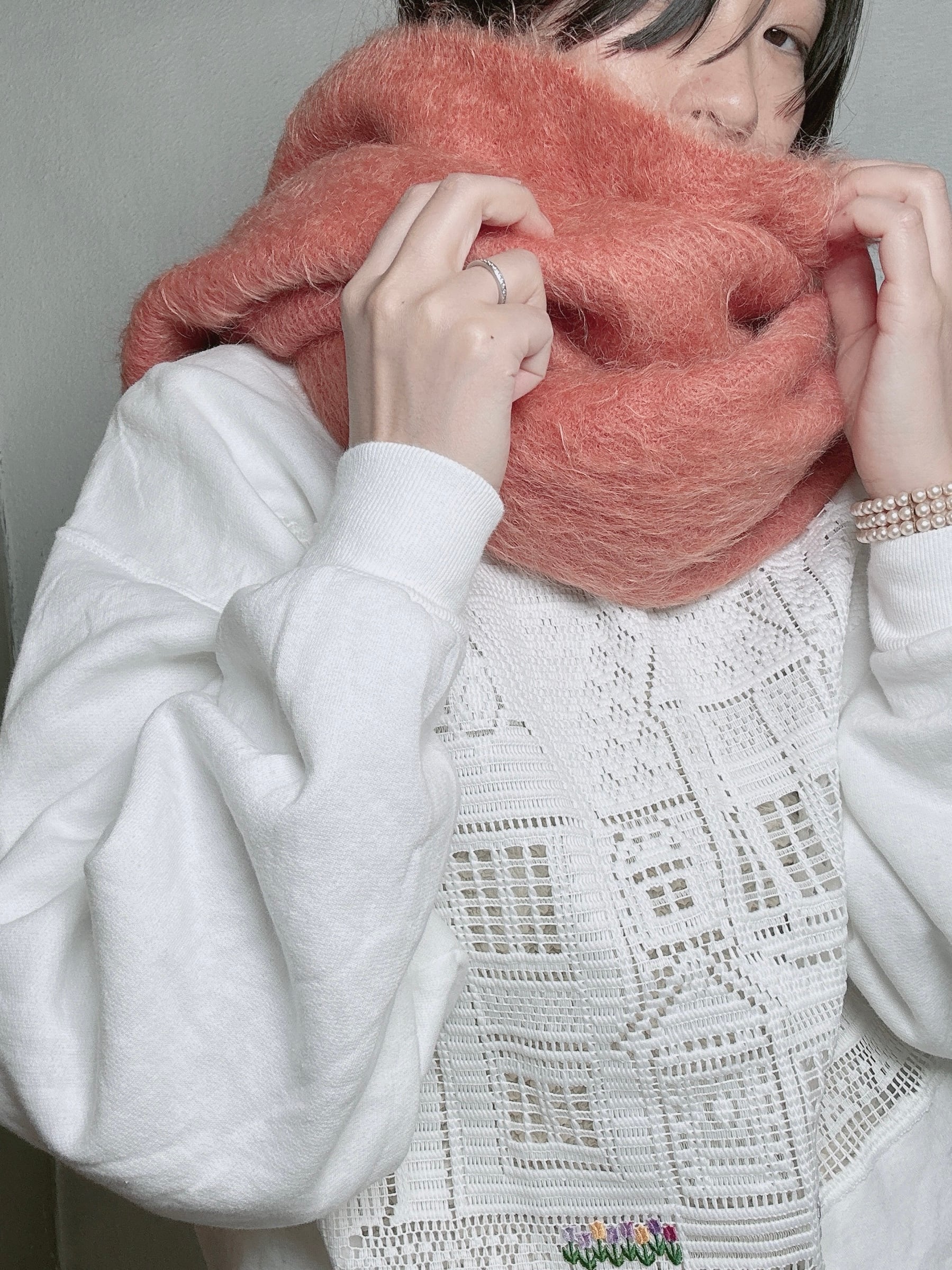 コートの上からショールのように纏ったり、ぐるりと巻いてマフラーのようにも使える万能アイテムです。